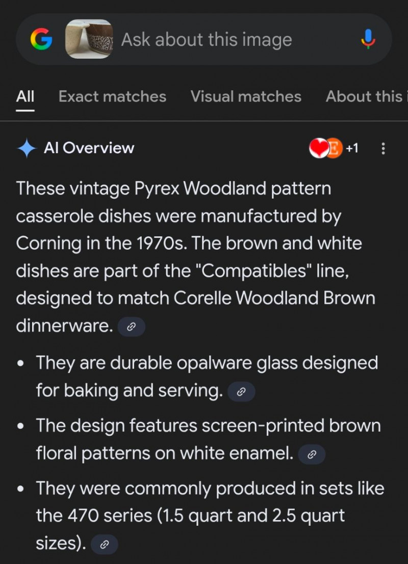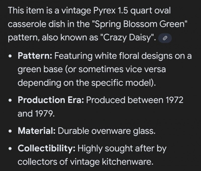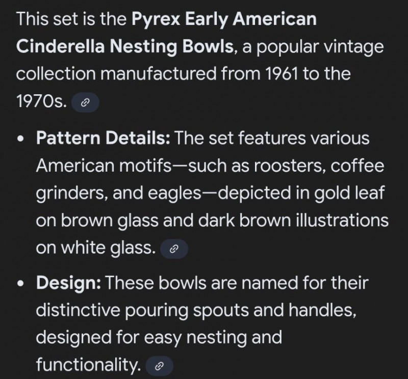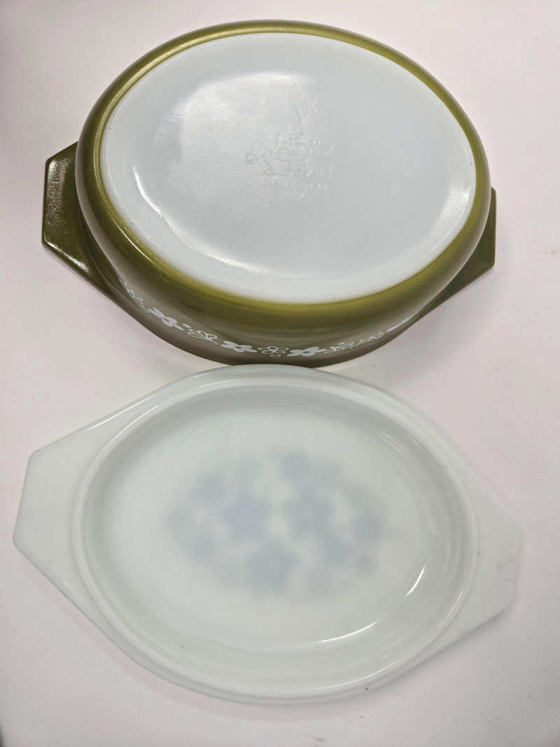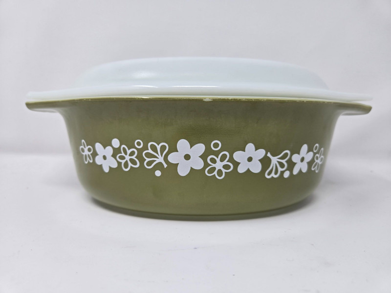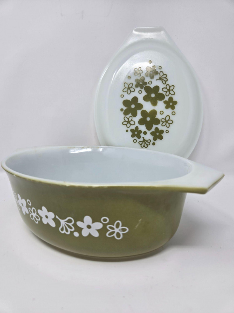 A charming mixed collection of 8 vintage Pyrex pieces, featuring classic mid‑century patterns and colors. This lot includes: Large 'Cinderella' mixing bowls with brown‑on‑white and gold‑on‑brown Americana‑style motifs, sm-3 1/4" x 4 1/4"t - lg-10 1/26 x 6"t Smaller bowls and casseroles in coordinating earth‑tone patterns Speckled beige 'Woodland' bowl 6 1/2"r x 2"t, 1 pint Dark brown floral‑patterned bowl Oval green, 1.5-quart, 'Crazy Daisy' dish with Lid 3"t /4 1/2"t w/lid, 10 12"x 7"oval A great assortment for Pyrex collectors, vintage kitchen lovers, or anyone looking to add functional retro charm to their cookware lineup. Pre‑owned condition with typical wear for vintage Pyrex. 8 Piece Pyrex