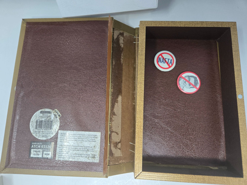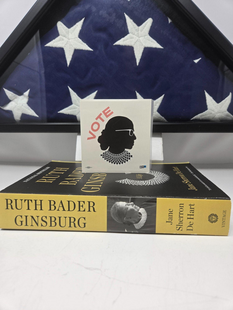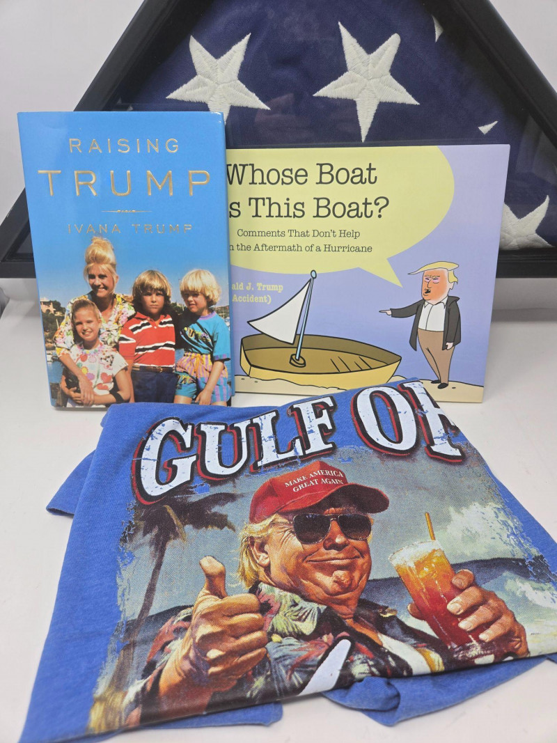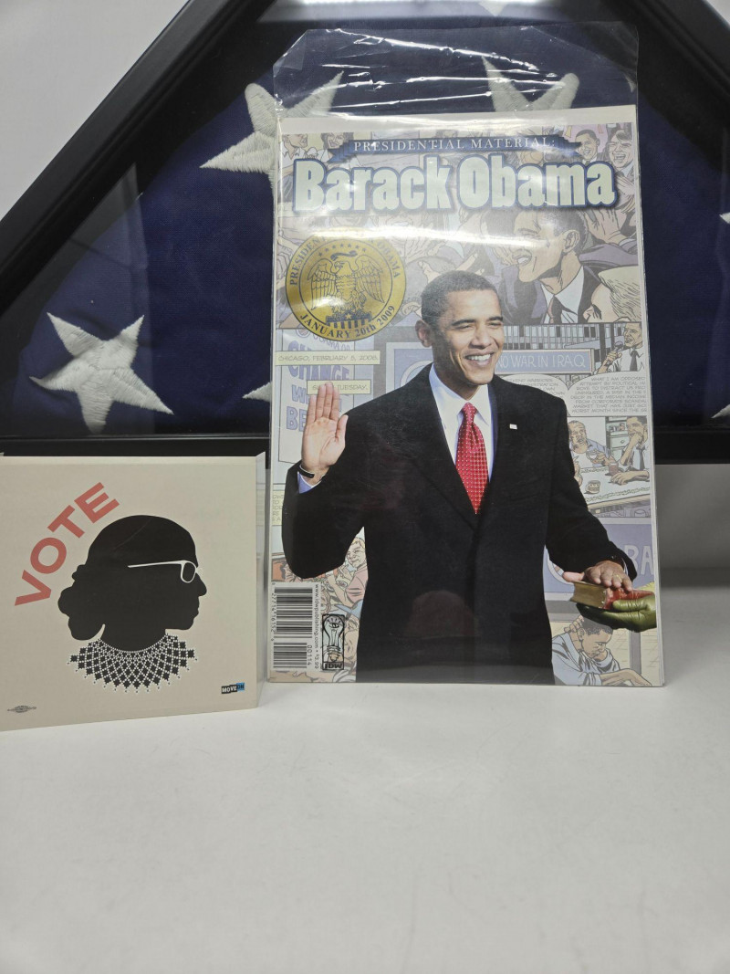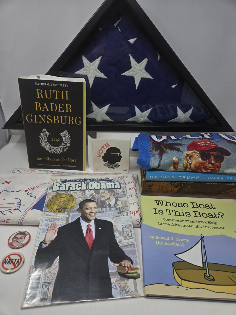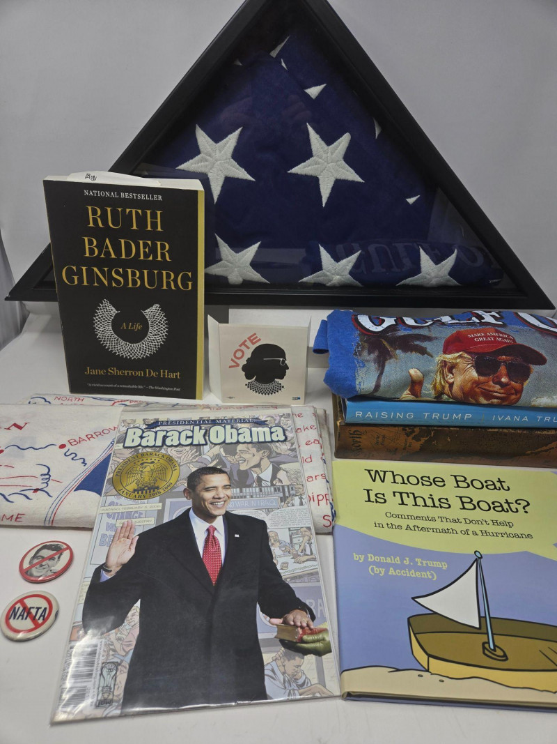 Triangular presentation box, ideal for honoring service or patriotic décor. Books & Biographies Raising Trump by Ivana Trump Whose Boat Is This Boat? (Donald J. Trump, by Accident) Ruth Bader Ginsburg: A Life by Jane Sherron De Hart Political & Cultural Items President‑Elect Barack Obama comic‑style magazine “VOTE” card with stylized profile graphic Cloth banner with red/blue design 50" x 50" Two anti‑NAFTA pins Xtra Large Trump-T Presidents / USA Memorabilia Lot