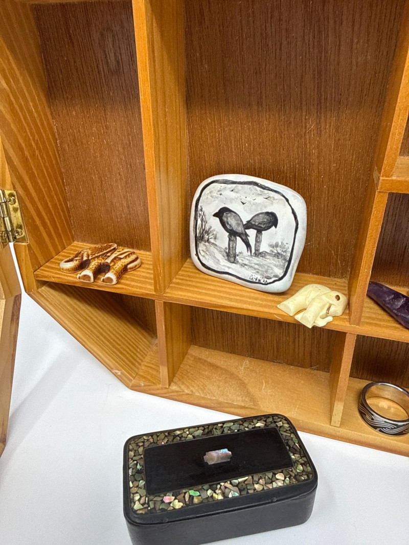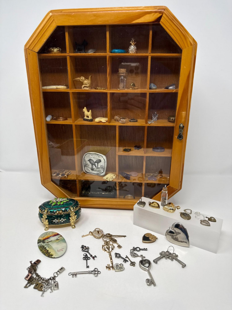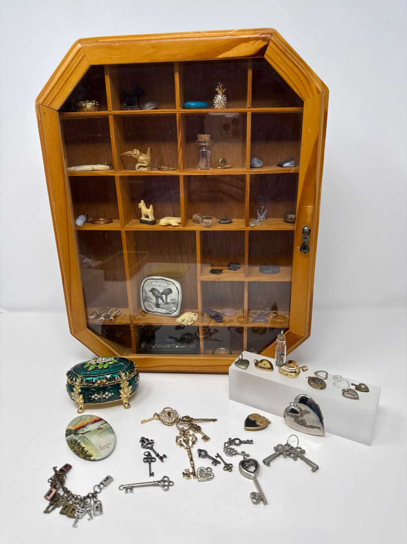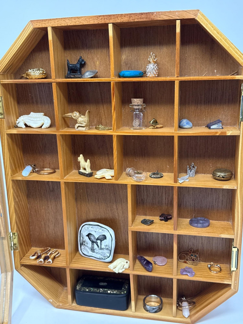 Display Case of Trinkets & Treasures A charming, eclectic assortment of miniatures, curios, and keepsakes, beautifully arranged in a wooden display case with multiple compartments. This lot is perfect for collectors, décor stylists, or anyone who loves small treasures with personality. Included Highlights: Wooden Display Case with glass front and many small cubbies Assorted mini figurines — animals, carved pieces, and decorative minis Vintage‑style keys, heart lockets, and metal charms Green & Gold Jewelry Box with ornate legs Painted Round Trinket featuring a scenic motif Additional tiny collectibles and decorative accents A delightful mix of textures, materials, and styles—ideal for curio cabinets, shadow boxes, or creative décor projects. Case- 15 x 11.5