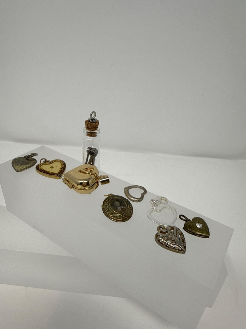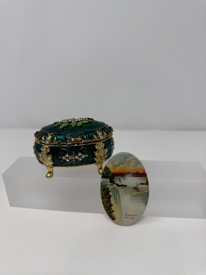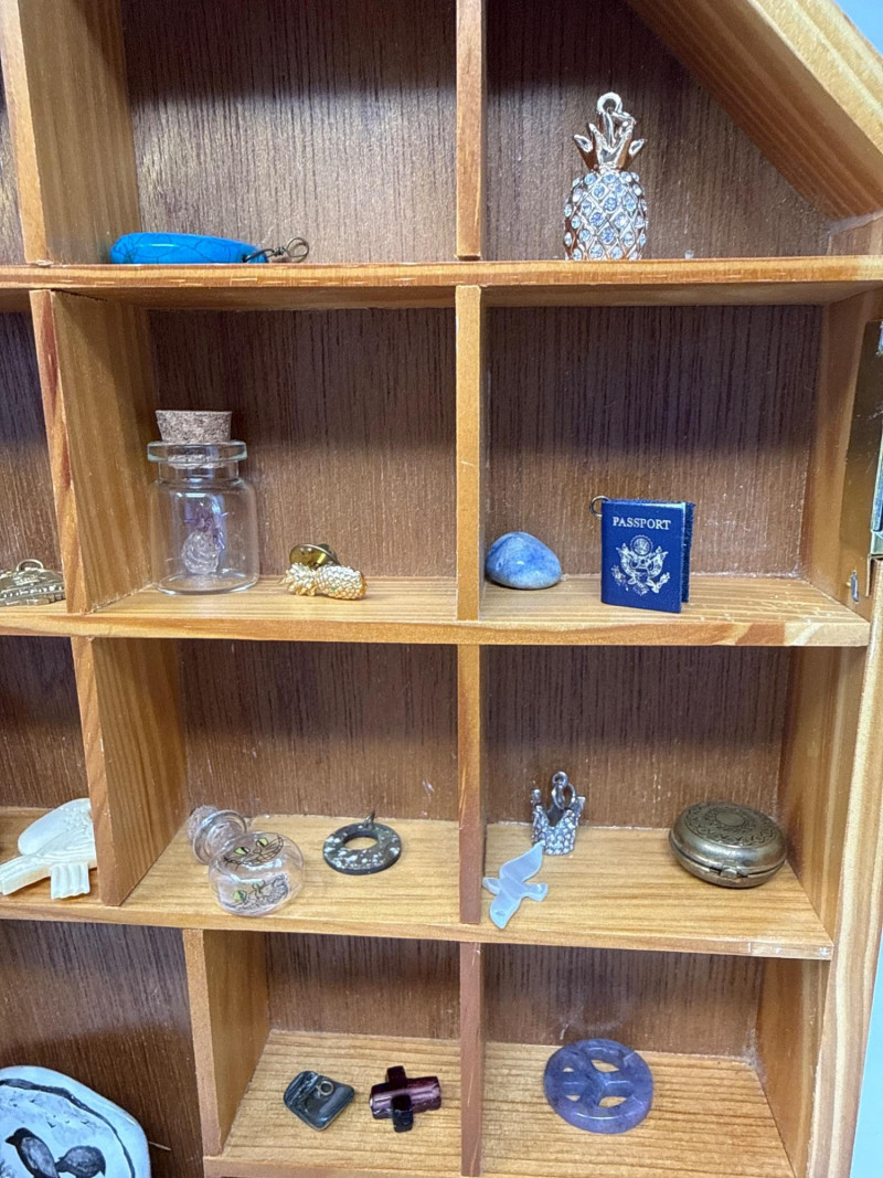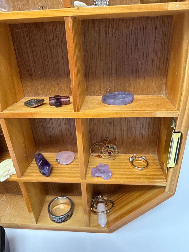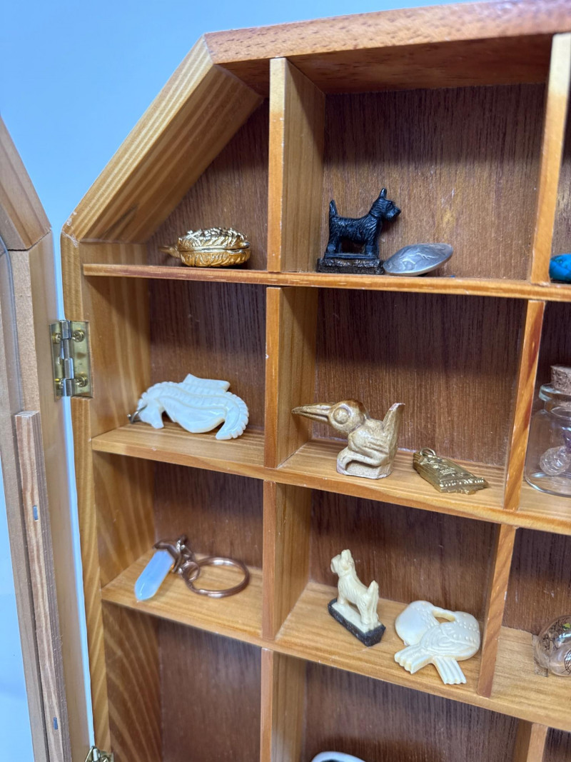 Display Case of Trinkets & Treasures A charming, eclectic assortment of miniatures, curios, and keepsakes, beautifully arranged in a wooden display case with multiple compartments. This lot is perfect for collectors, décor stylists, or anyone who loves small treasures with personality. Included Highlights: Wooden Display Case with glass front and many small cubbies Assorted mini figurines — animals, carved pieces, and decorative minis Vintage‑style keys, heart lockets, and metal charms Green & Gold Jewelry Box with ornate legs Painted Round Trinket featuring a scenic motif Additional tiny collectibles and decorative accents A delightful mix of textures, materials, and styles—ideal for curio cabinets, shadow boxes, or creative décor projects. Case- 15 x 11.5