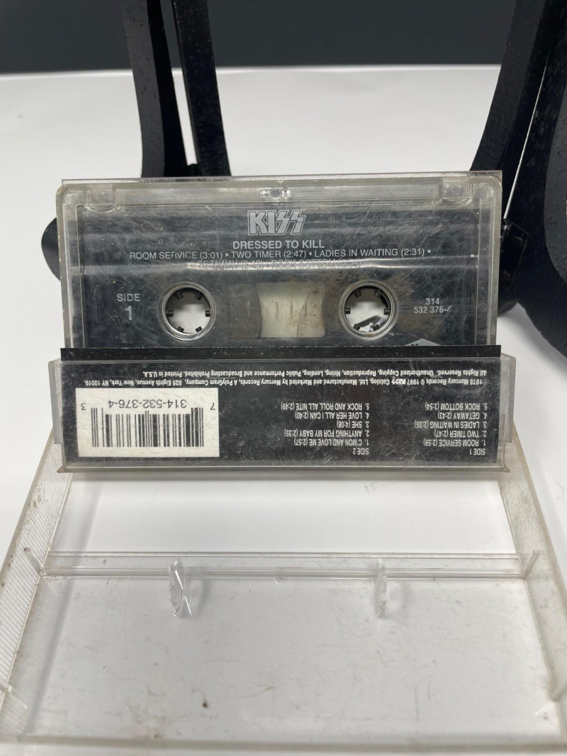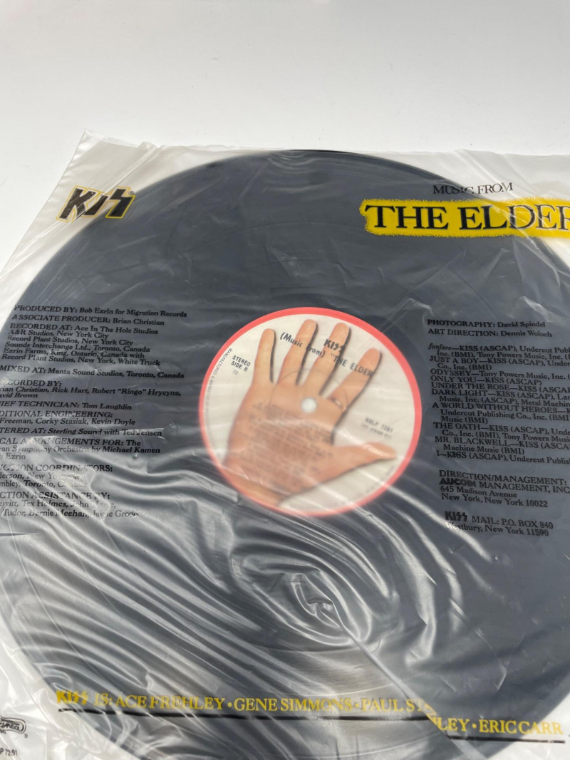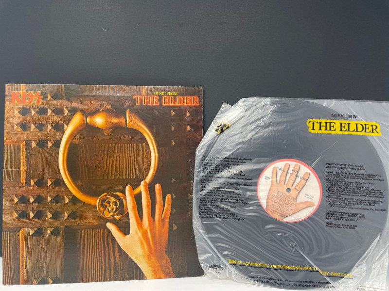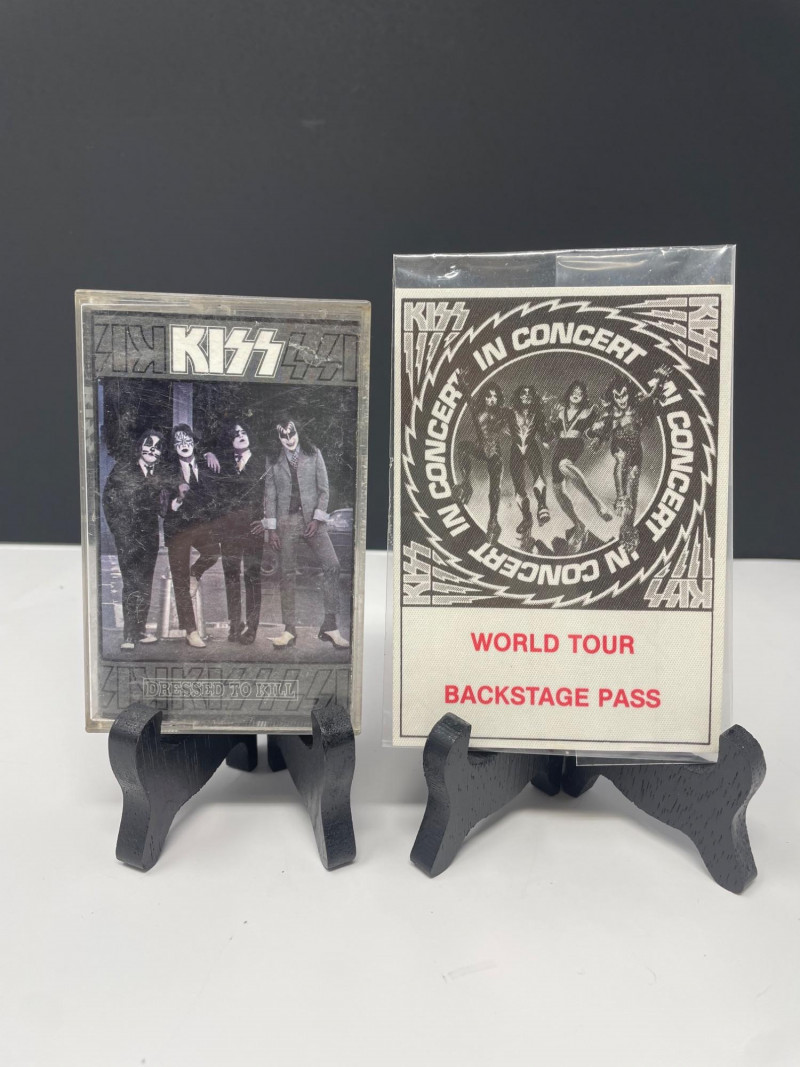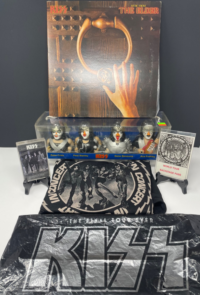 A bold, fan‑favorite assortment of KISS memorabilia, spanning music, merch, and collectible display pieces. This lot celebrates multiple eras of the band’s iconic style and stage presence. Included Highlights: “Music from The Elder” Vinyl Album — classic cover art with the hand‑to‑door‑knocker design Boxed Set of Four KISS Action Figures — Peter Criss, Paul Stanley, Gene Simmons, Ace Frehley KISS Cassette Tape displayed on stand Kiss End of Road Poster 24" x 18" World Tour Backstage Pass Card — “IN CONCERT” design Two KISS Apparel Pieces: Plastic Bag from concert “THE FINAL TOUR EVER” shirt with large silver KISS logo A striking, ready‑to‑display collection for KISS fans, rock‑and‑roll collectors, or anyone building a music‑memorabilia showcase.KISS Music Memorabilia and Poster