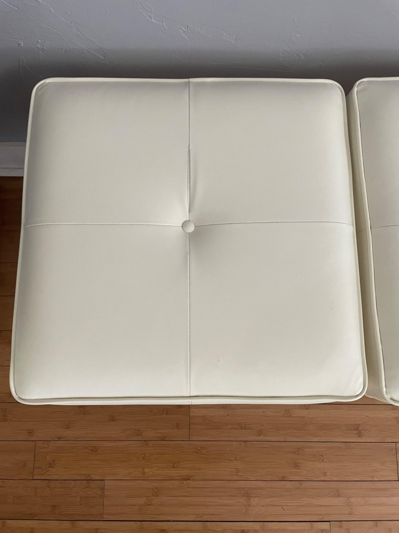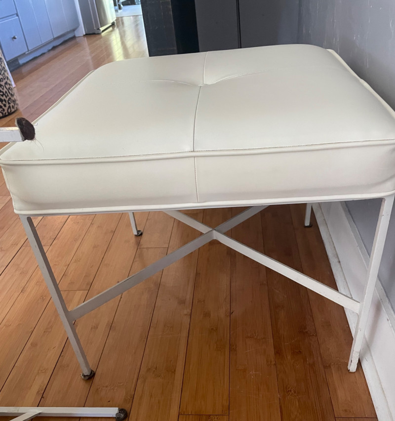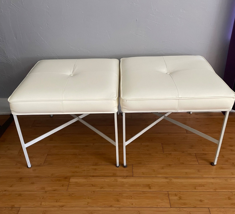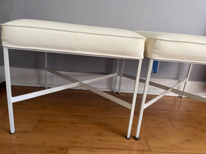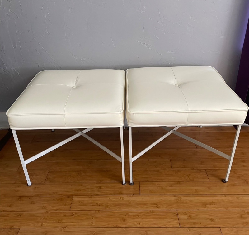 Modernist X-Base Square Benches (or ottomans), likely produced by the Design Institute of America They feature a signature white vinyl upholstered seat with a single center tufted button and a thin chrome or stainless steel frame with an X-shaped stretcher. This minimalist, mid-century modern design is often attributed to the "manner of Paul McCobb," a prominent American furniture designer. Size: 23” Square x 19” H x Seat Cushion 2” Thick One bench has seam split - Looks repairable.