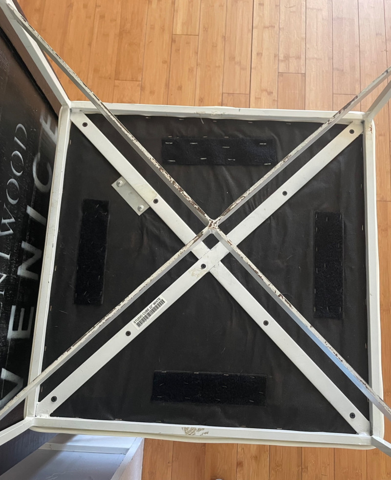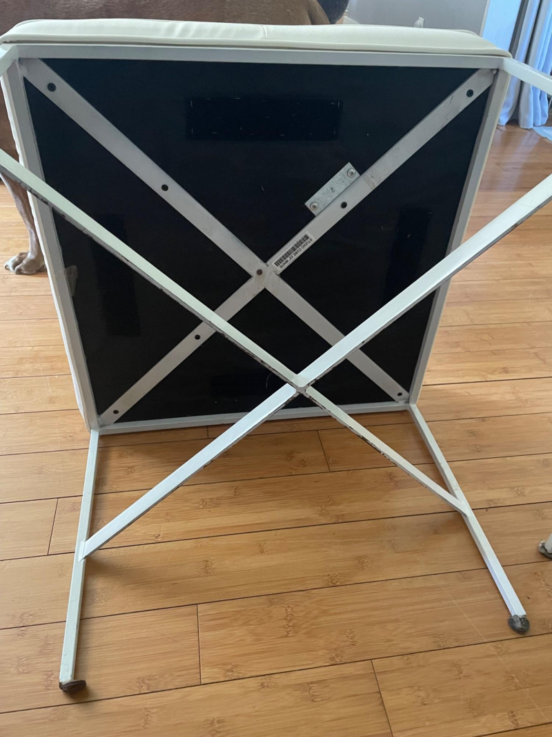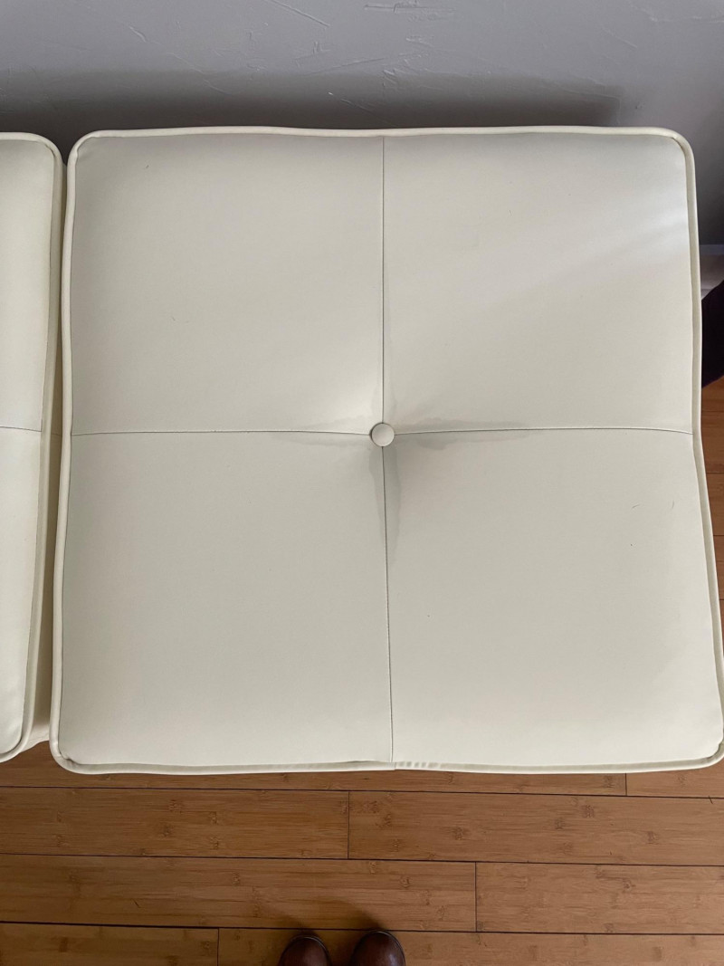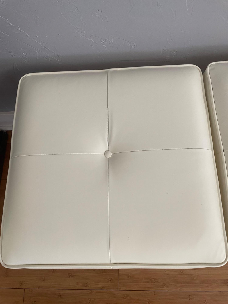 Modernist X-Base Square Benches (or ottomans), likely produced by the Design Institute of America They feature a signature white vinyl upholstered seat with a single center tufted button and a thin chrome or stainless steel frame with an X-shaped stretcher. This minimalist, mid-century modern design is often attributed to the "manner of Paul McCobb," a prominent American furniture designer. Size: 23” Square x 19” H x Seat Cushion 2” Thick One bench has seam split - Looks repairable.