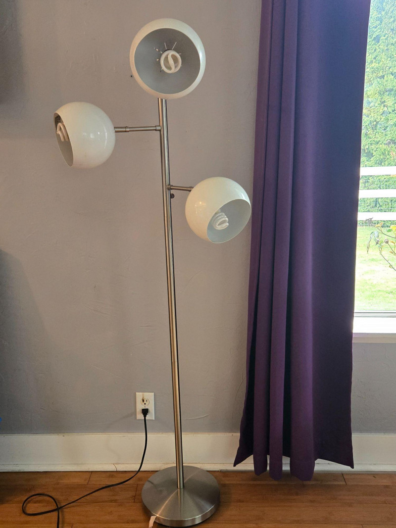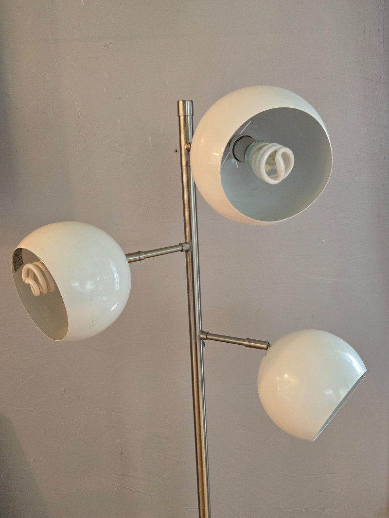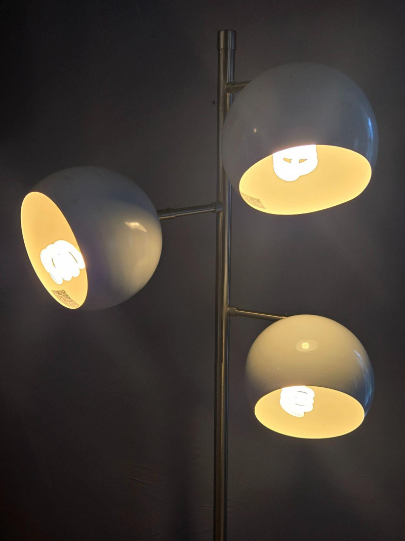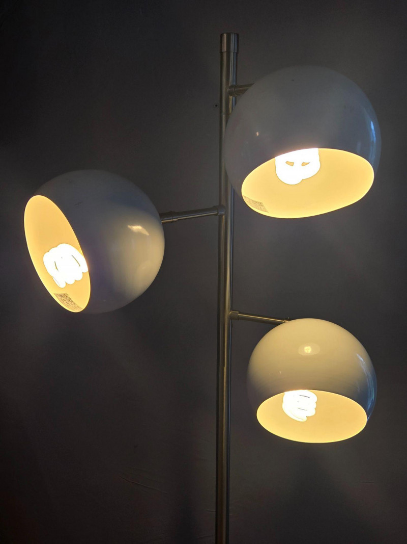 A sleek, contemporary three‑globe floor lamp featuring a modern vertical design with staggered white orb shades. Each globe emits a warm ambient glow, creating soft, even lighting ideal for living rooms, offices, reading corners, or studio spaces. Features: Three spherical white shades positioned at varied heights Slim metallic pole with a clean, modern profile Warm, inviting light output Stylish accent piece that complements both minimalist and mid‑century décor A functional and attractive lighting solution that adds both illumination and sculptural presence to any room.Floor Lamp