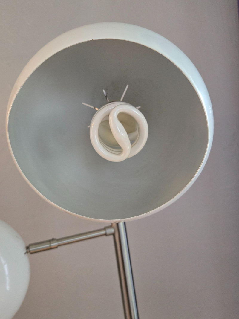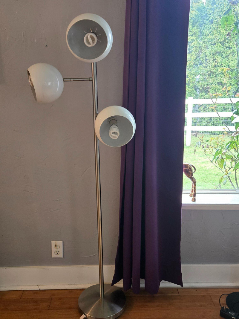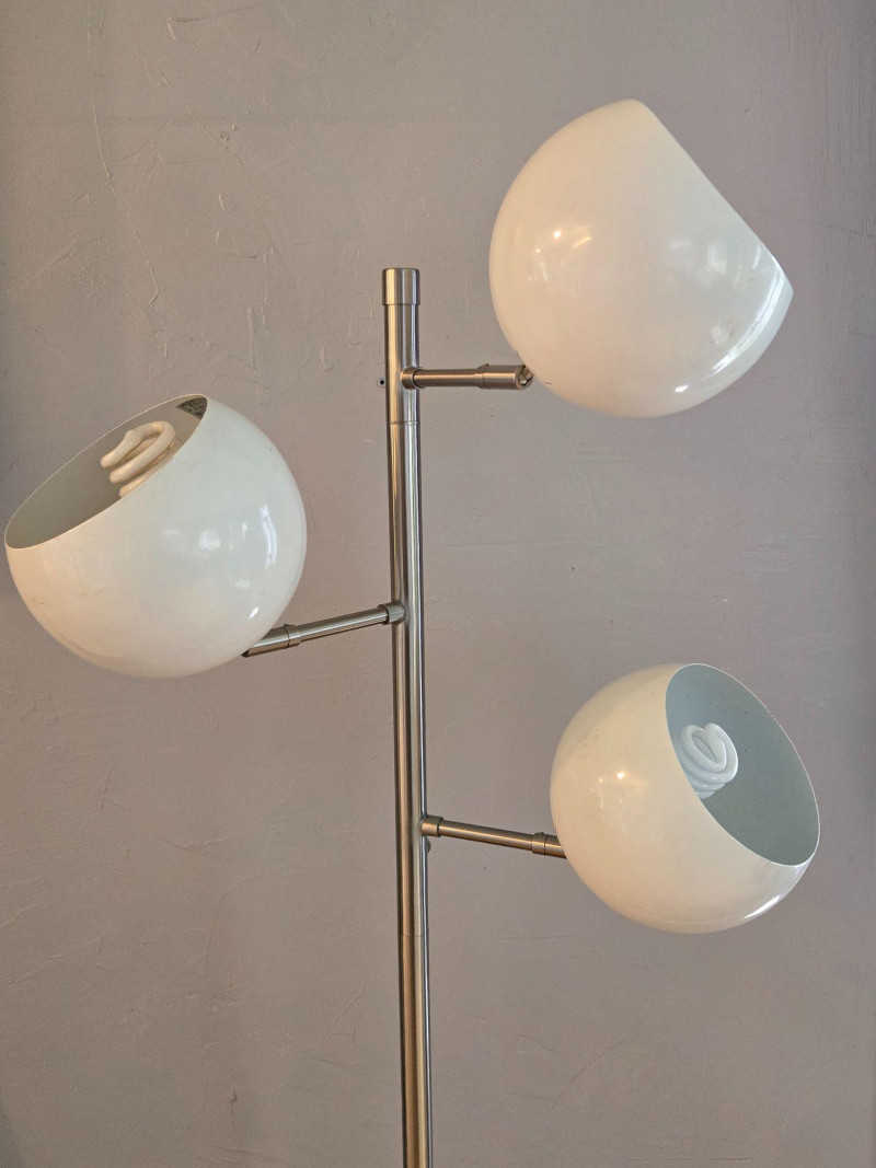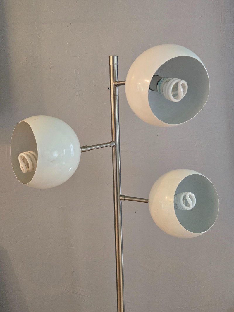 A sleek, contemporary three‑globe floor lamp featuring a modern vertical design with staggered white orb shades. Each globe emits a warm ambient glow, creating soft, even lighting ideal for living rooms, offices, reading corners, or studio spaces. Features: Three spherical white shades positioned at varied heights Slim metallic pole with a clean, modern profile Warm, inviting light output Stylish accent piece that complements both minimalist and mid‑century décor A functional and attractive lighting solution that adds both illumination and sculptural presence to any room.Floor Lamp