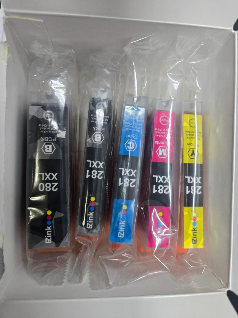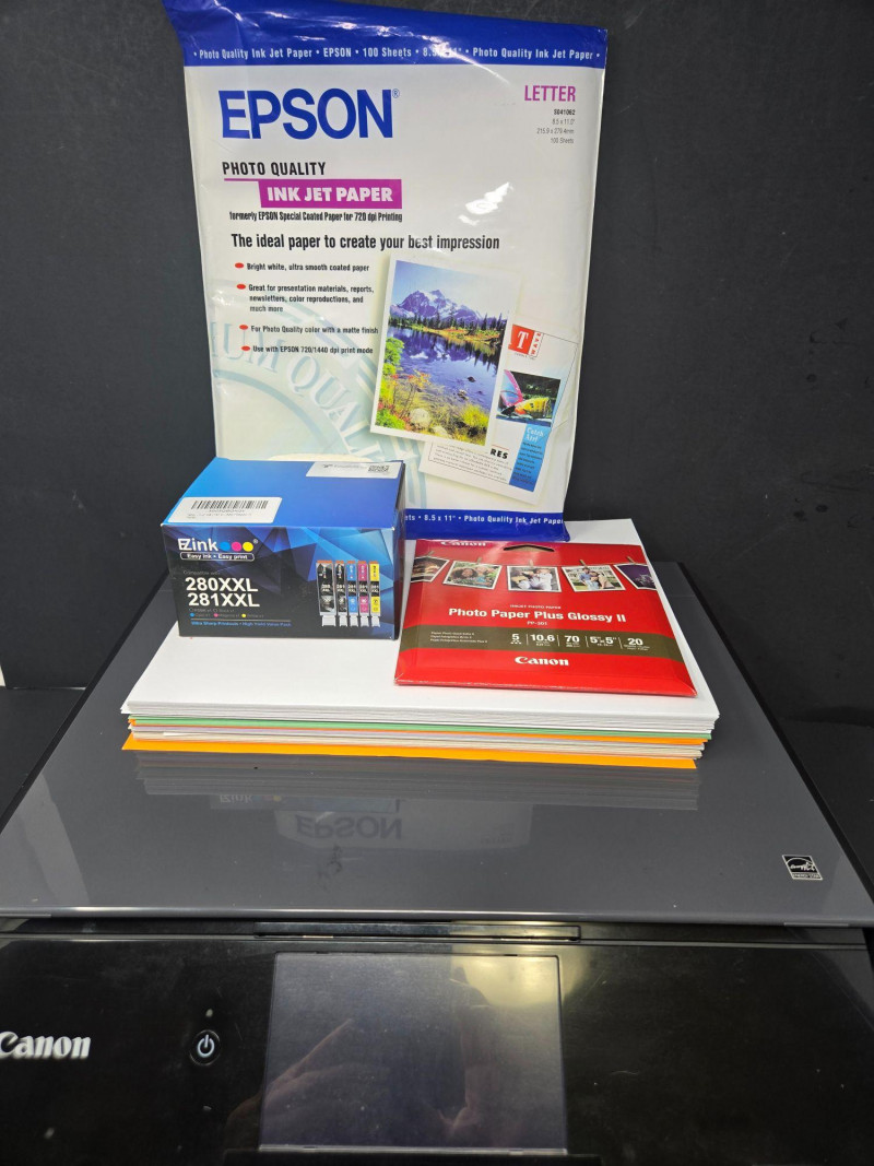 A versatile Canon PIXMA printer paired with a generous assortment of unused ink cartridges and premium photo paper, ideal for home offices, craft rooms, or photo‑printing setups. This bundle provides everything needed for high‑quality printing right out of the box. Included Highlights: Canon PIXMA Printer Compact design with front‑panel controls Suitable for documents, photos, and everyday printing Unused Ink Cartridges Zink‑brand compatible cartridges (280XXL / 281XXL) Multi‑color pack, unopened Photo & Specialty Paper Epson Photo Quality Ink Jet Paper (Letter, 100 sheets) Canon Photo Paper Plus Glossy II (5" x 7", sealed packs) Additional assorted paper sheets Printer is pre‑owned; ink and paper packages are unused/sealed. All items sold AS IS, WHERE IS.Canon PIXMA Printer w/Unused Ink Cartridges