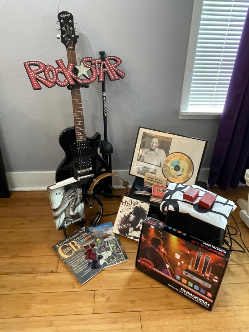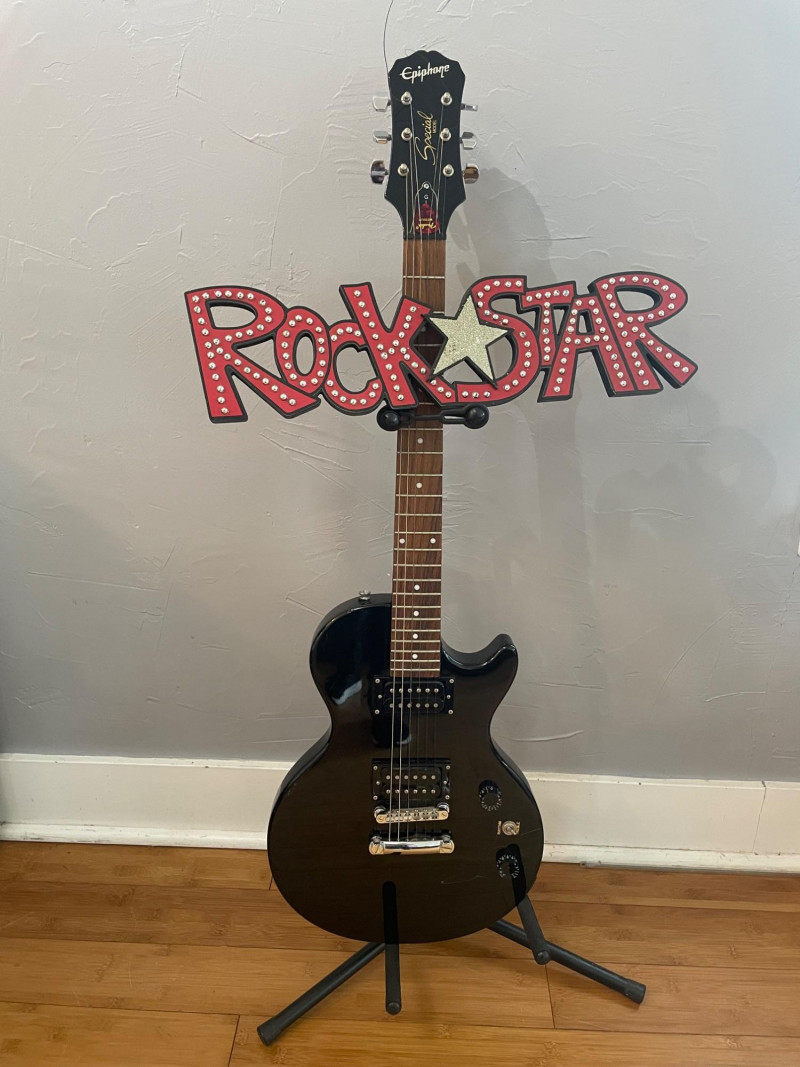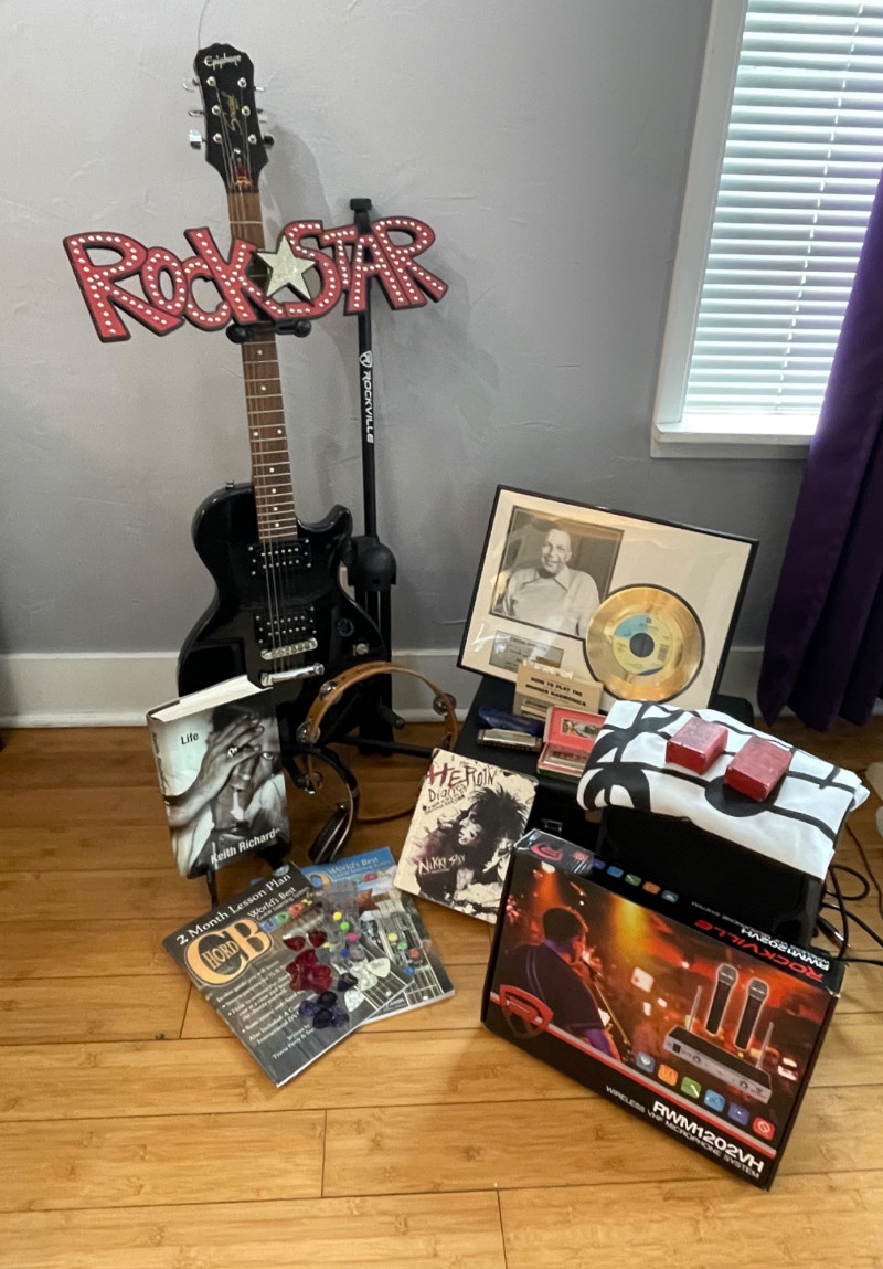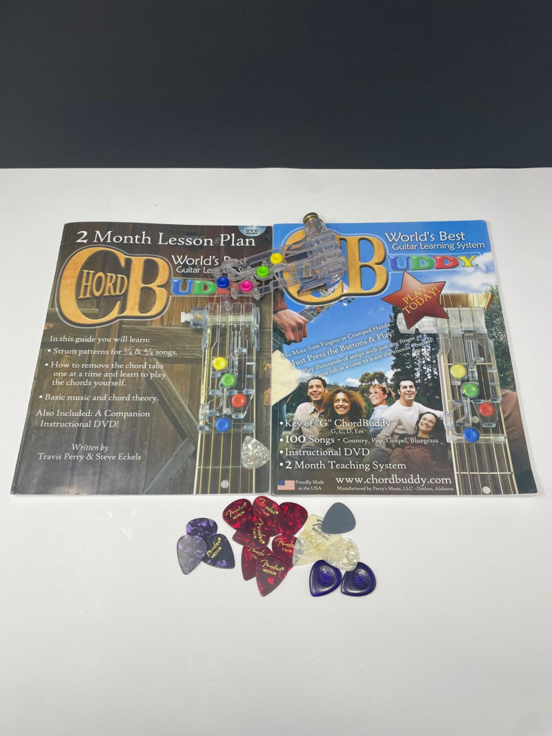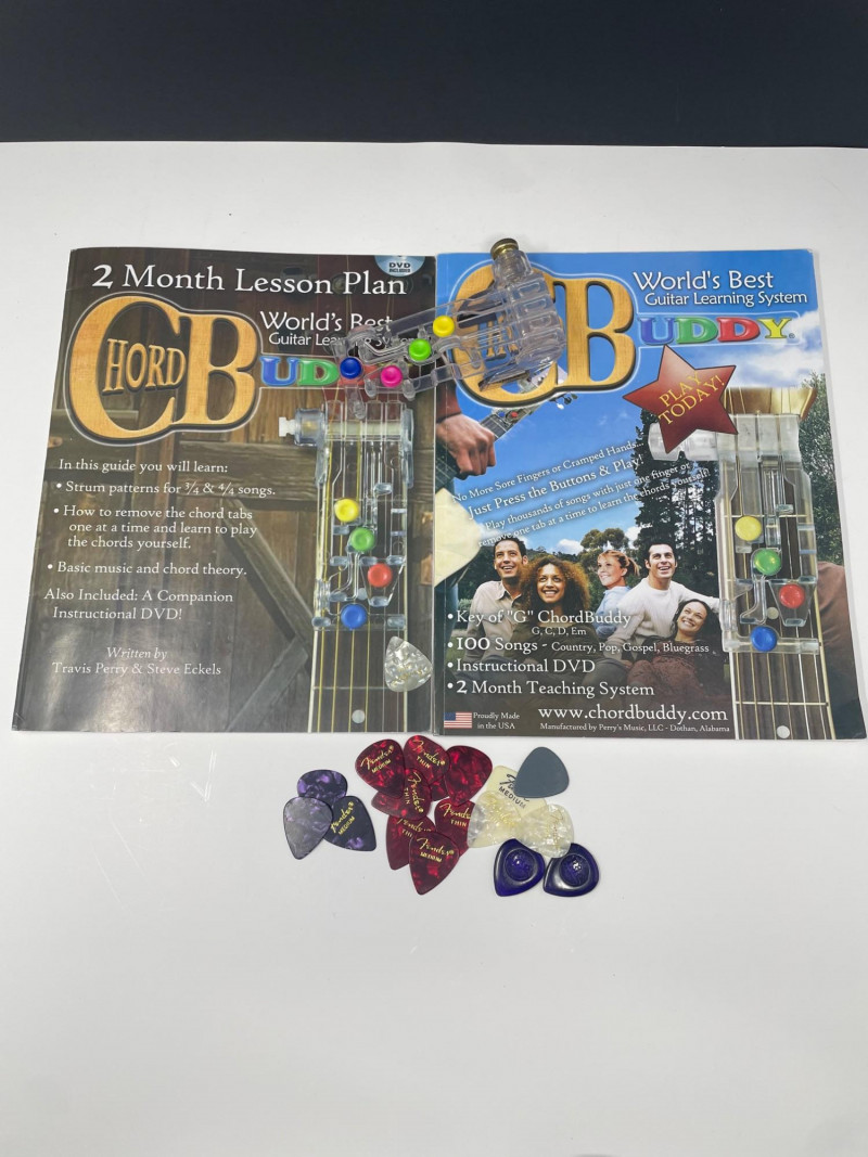 A bold, personality‑packed collection perfect for any rock‑lover, musician, or music‑room decorator. This lot brings together an electric guitar, gear, memorabilia, books, and accessories—an instant starter set for a budding player or a fun display bundle for a music‑themed space. Rock Band University Lesson Plan Booklet with guitar picksFor The Music Fan