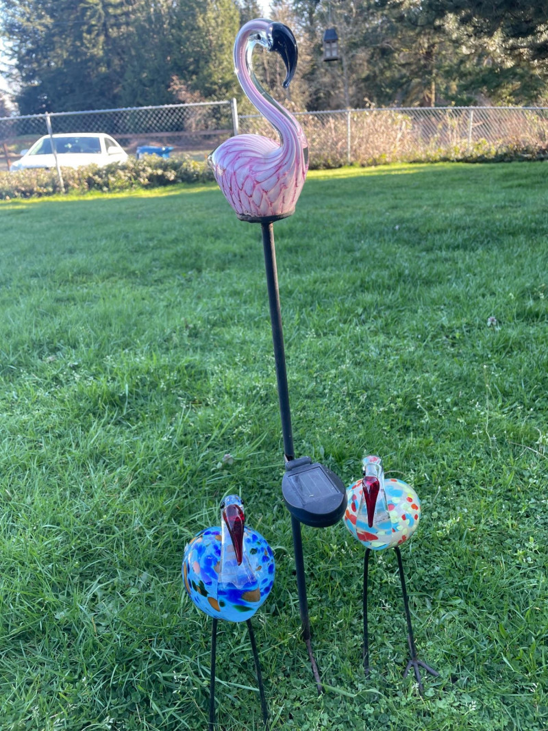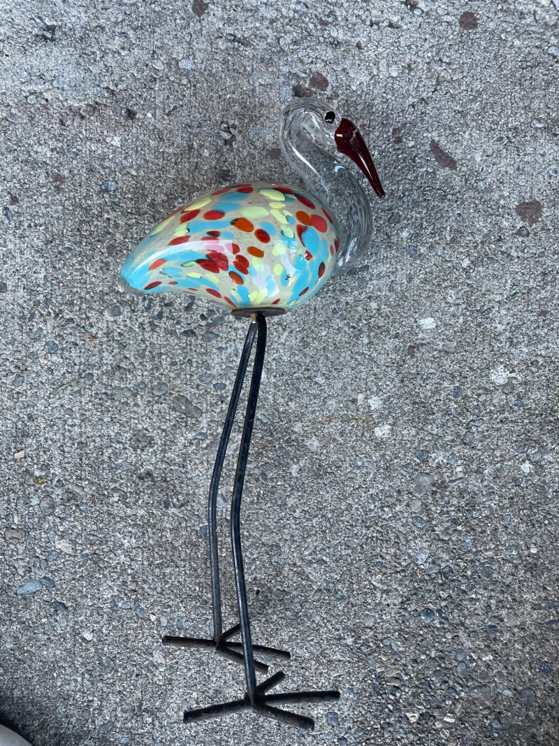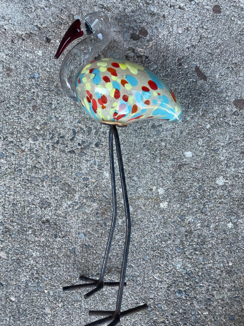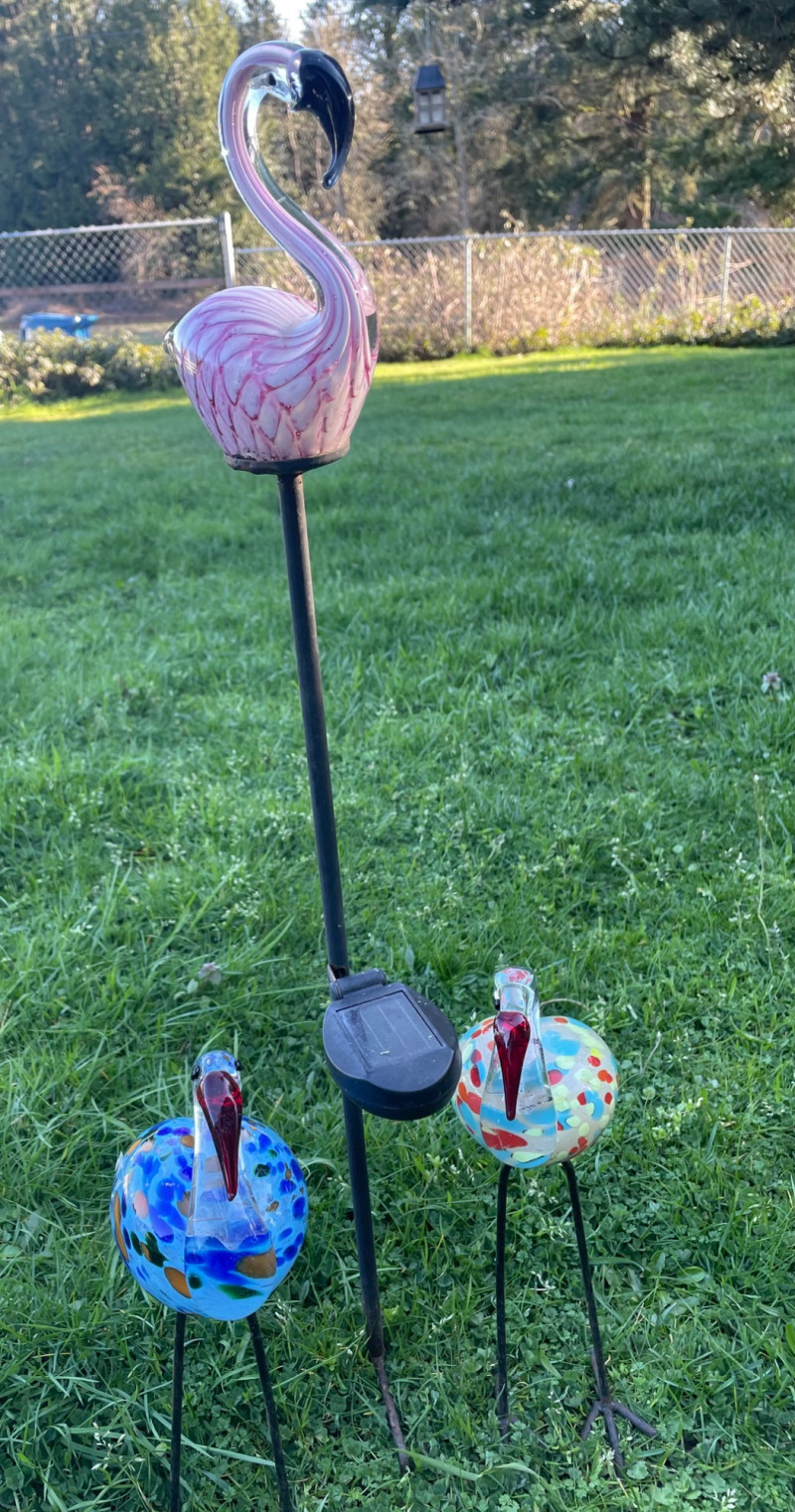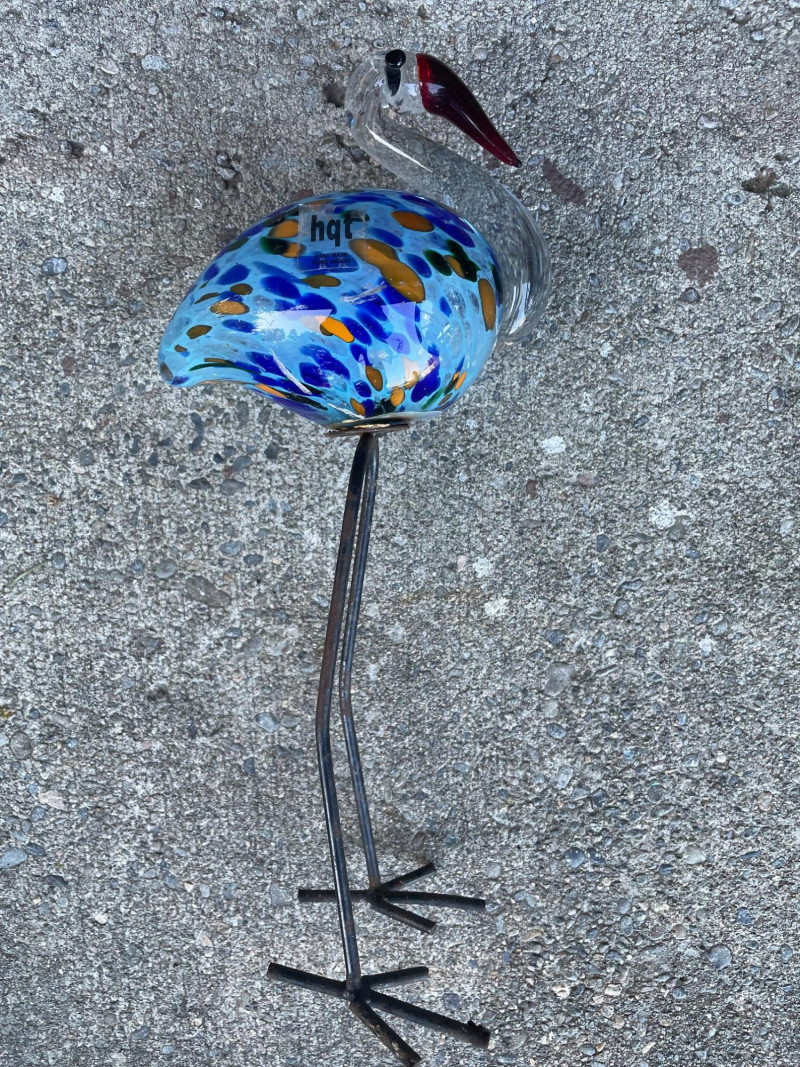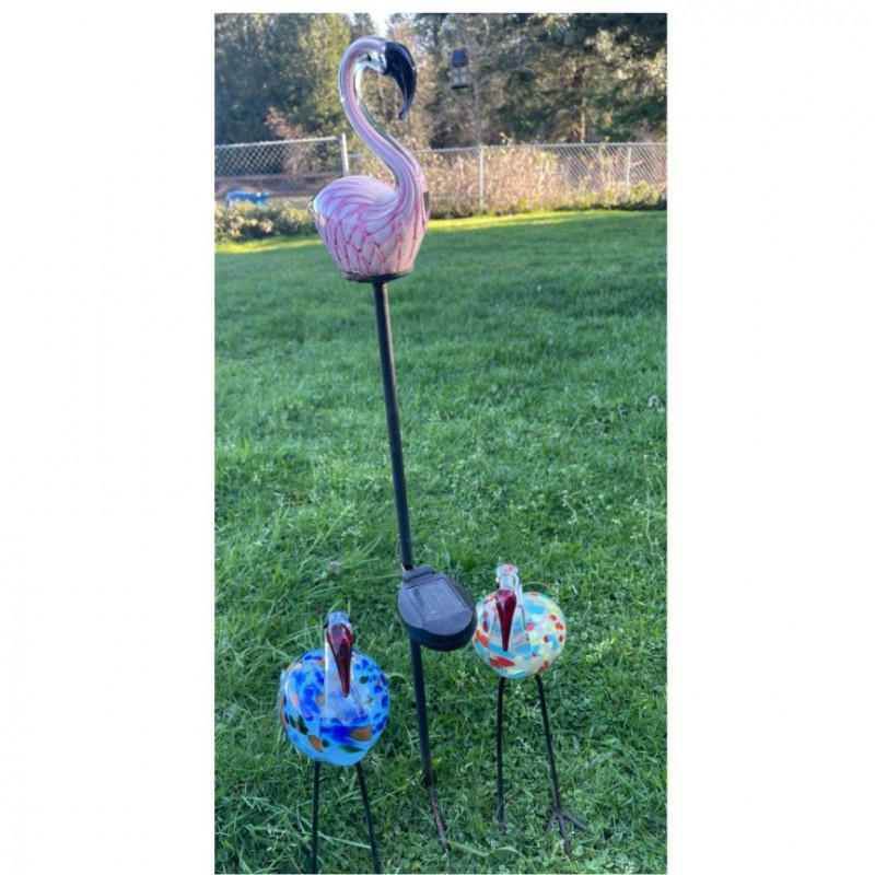 A playful trio of decorative glass yard birds, perfect for brightening garden beds, walkways, patios, or whimsical outdoor displays. This set blends vibrant color, handcrafted charm, and a touch of solar‑powered magic. Included Highlights: Tall Pink Flamingo- Two Colorful Glass Birds- Pre‑owned outdoor condition with typical weathering. All items sold AS IS, WHERE IS. Flamingo: 16”H Bird 6” x 4” (untested) Blue Standing Blue Bird: 13” H Bird 6” Standing Multi Color Bird: 12” Bird 6”‘hqt’ Flamingo Yard Art