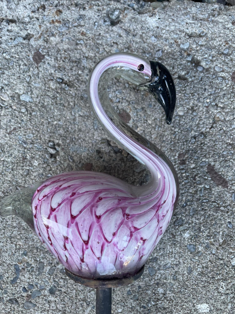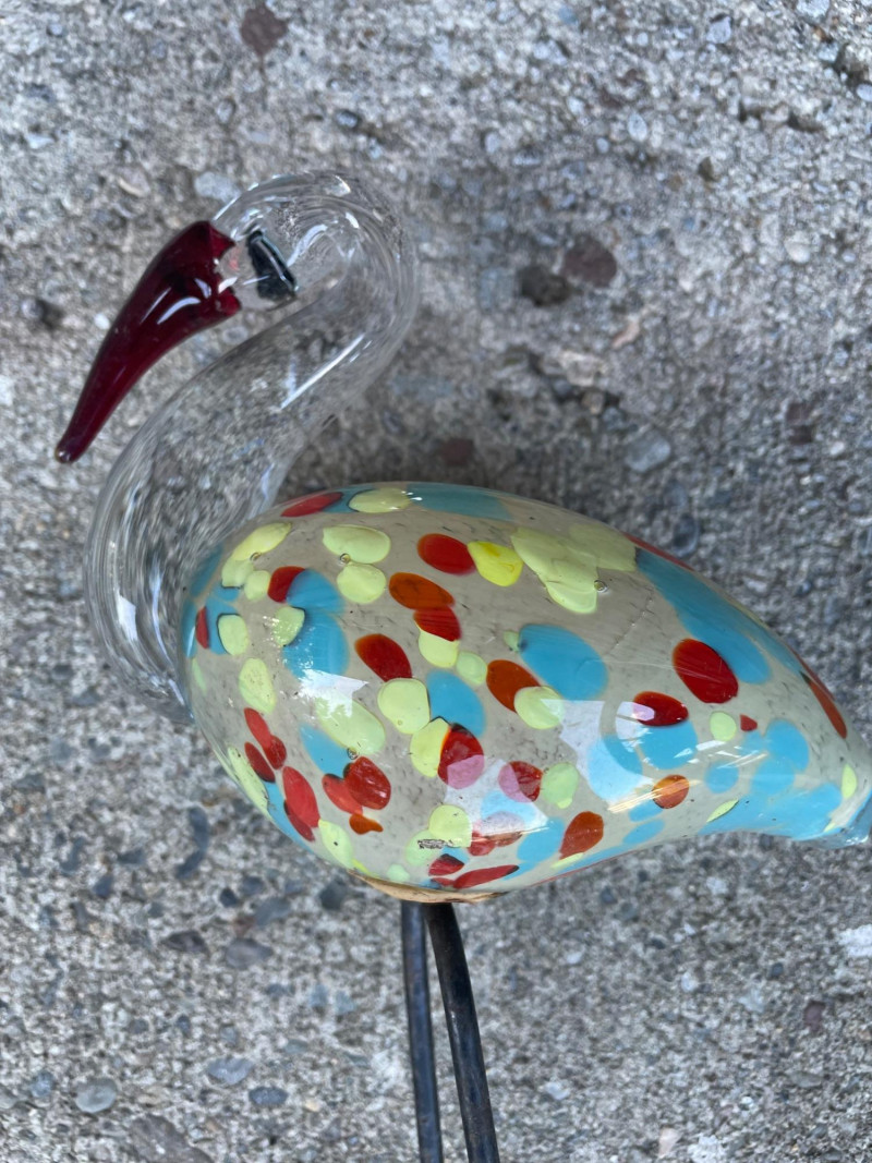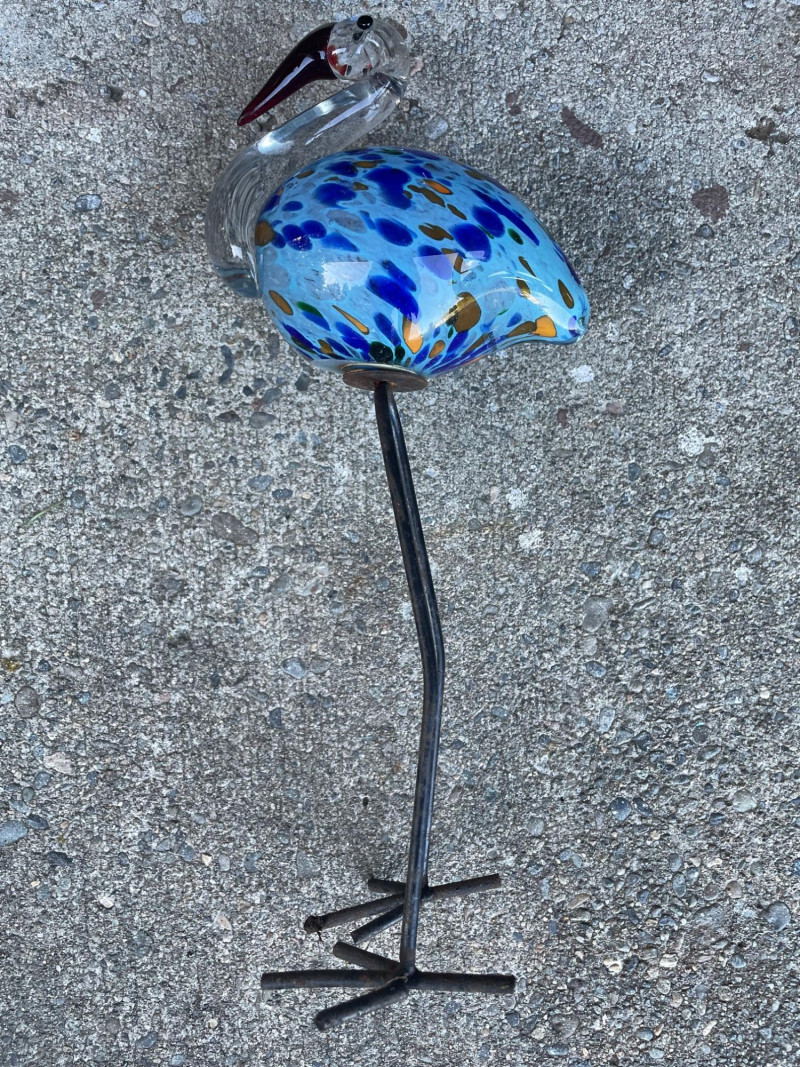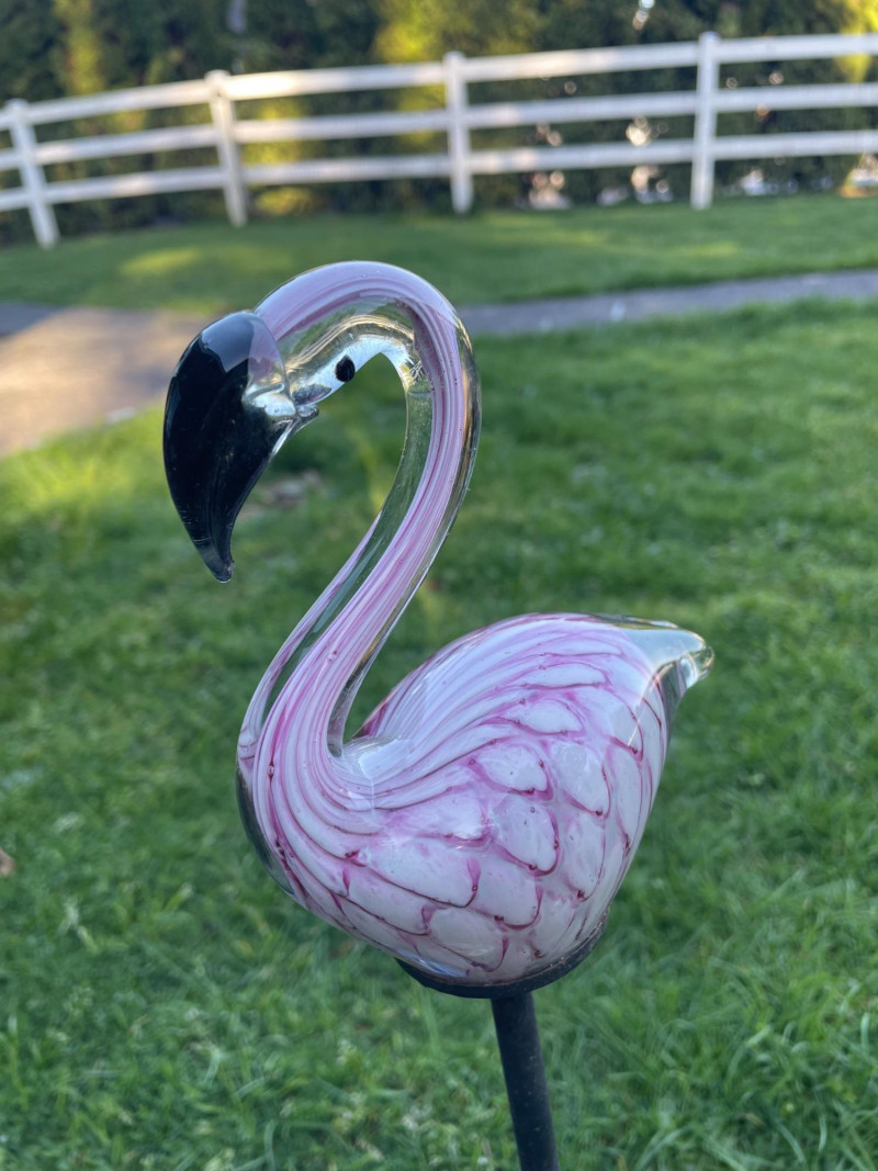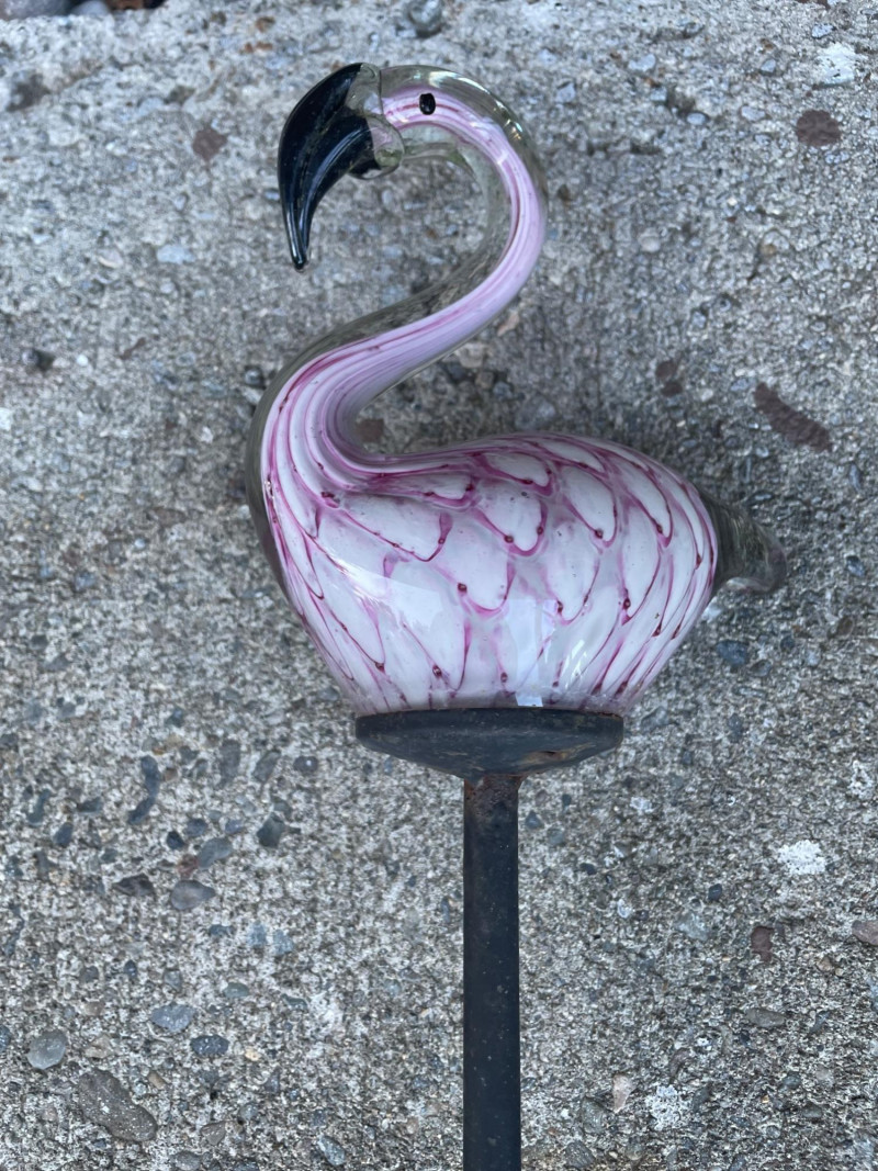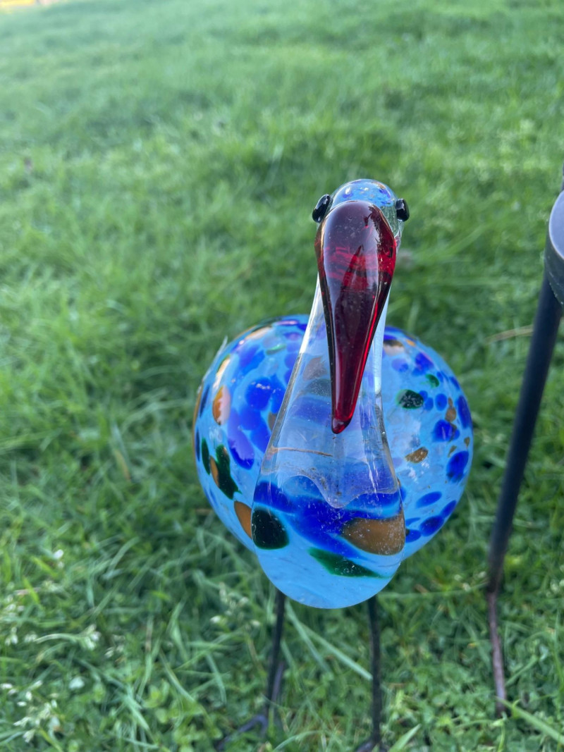 A playful trio of decorative glass yard birds, perfect for brightening garden beds, walkways, patios, or whimsical outdoor displays. This set blends vibrant color, handcrafted charm, and a touch of solar‑powered magic. Included Highlights: Tall Pink Flamingo- Two Colorful Glass Birds- Pre‑owned outdoor condition with typical weathering. All items sold AS IS, WHERE IS. Flamingo: 16”H Bird 6” x 4” (untested) Blue Standing Blue Bird: 13” H Bird 6” Standing Multi Color Bird: 12” Bird 6”‘hqt’ Flamingo Yard Art