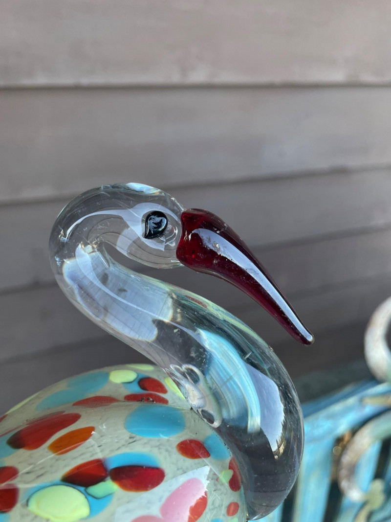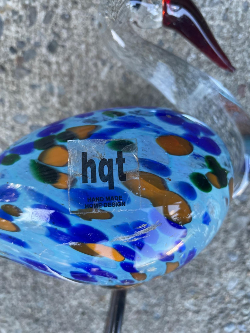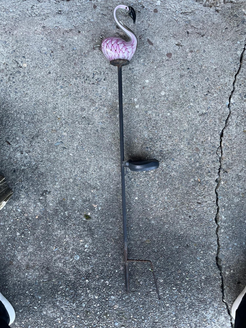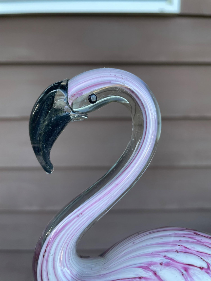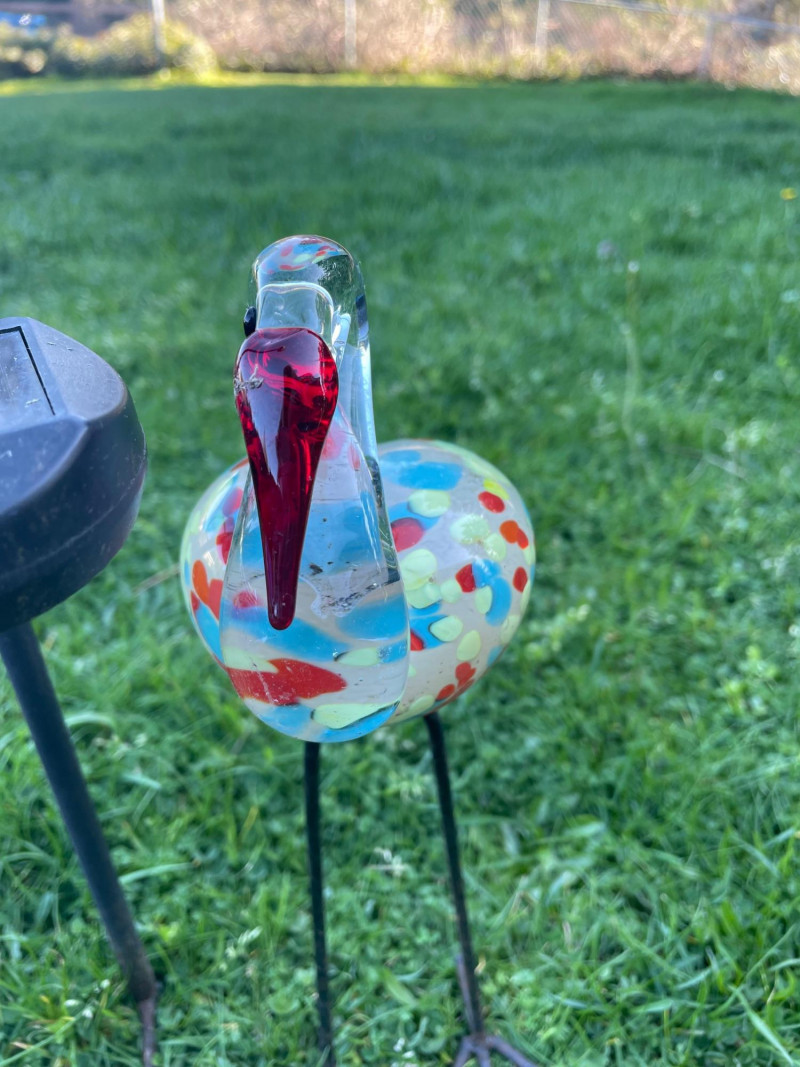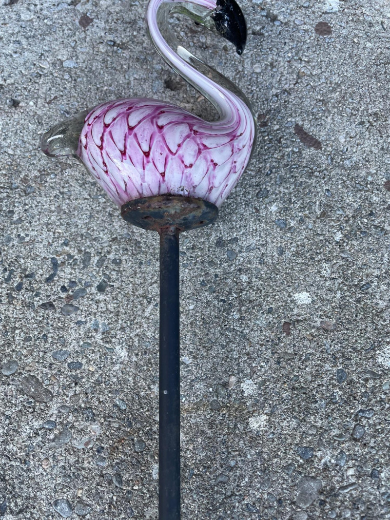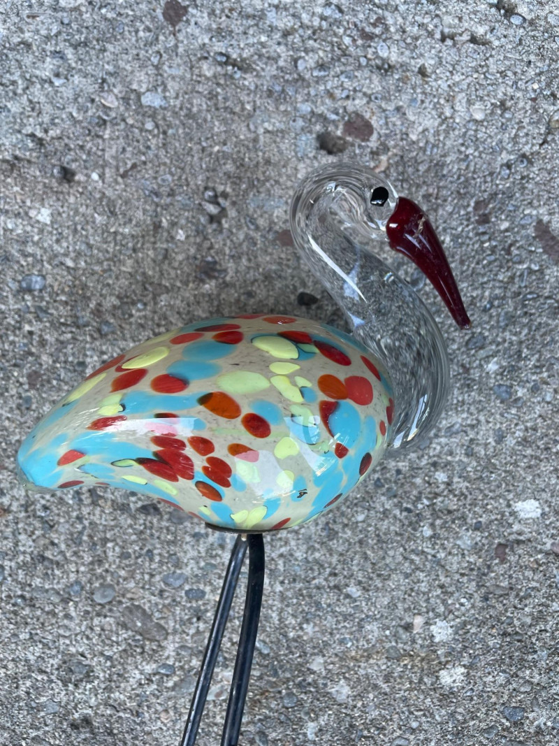 A playful trio of decorative glass yard birds, perfect for brightening garden beds, walkways, patios, or whimsical outdoor displays. This set blends vibrant color, handcrafted charm, and a touch of solar‑powered magic. Included Highlights: Tall Pink Flamingo- Two Colorful Glass Birds- Pre‑owned outdoor condition with typical weathering. All items sold AS IS, WHERE IS. Flamingo: 16”H Bird 6” x 4” (untested) Blue Standing Blue Bird: 13” H Bird 6” Standing Multi Color Bird: 12” Bird 6”‘hqt’ Flamingo Yard Art