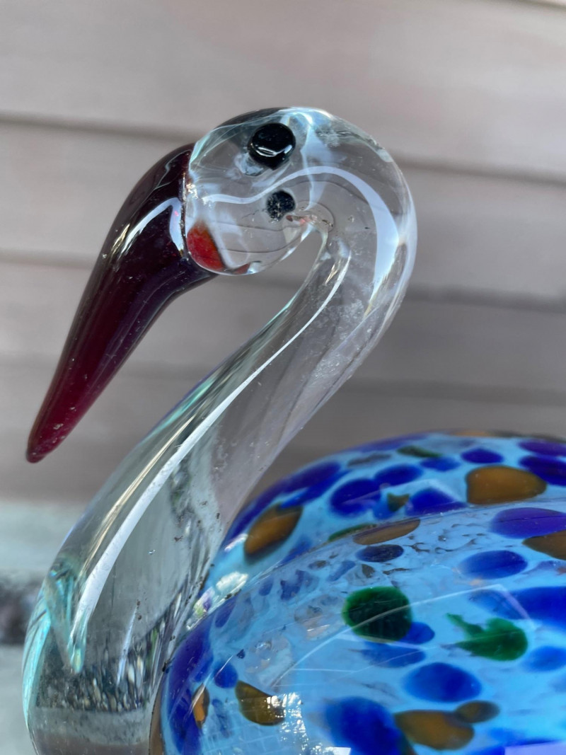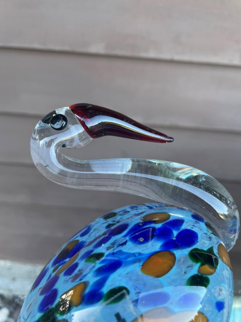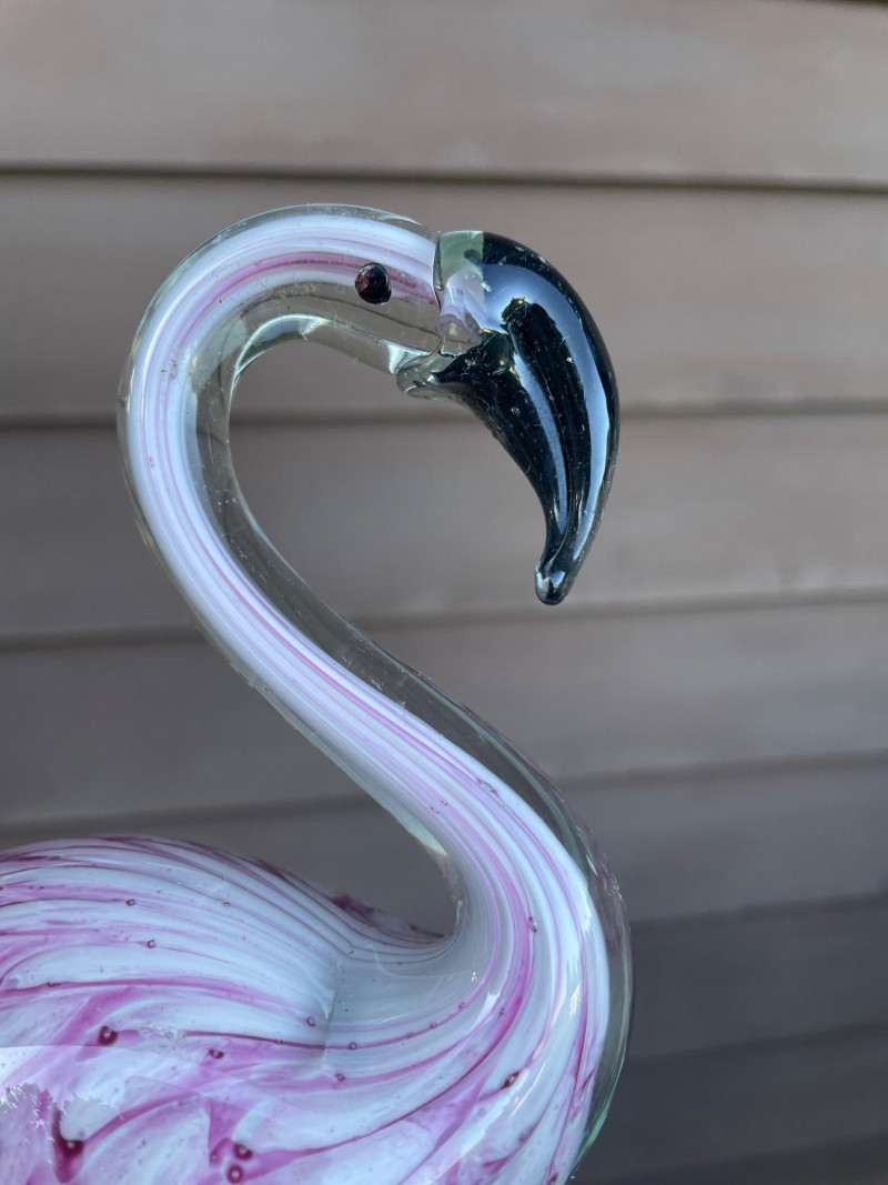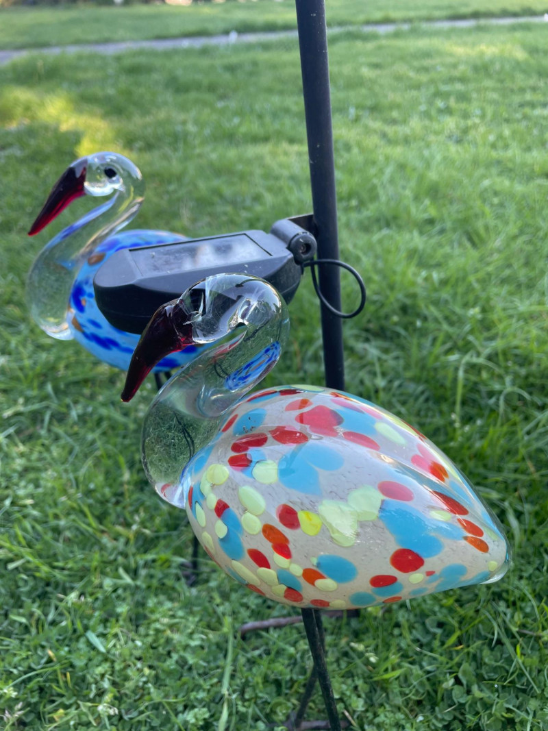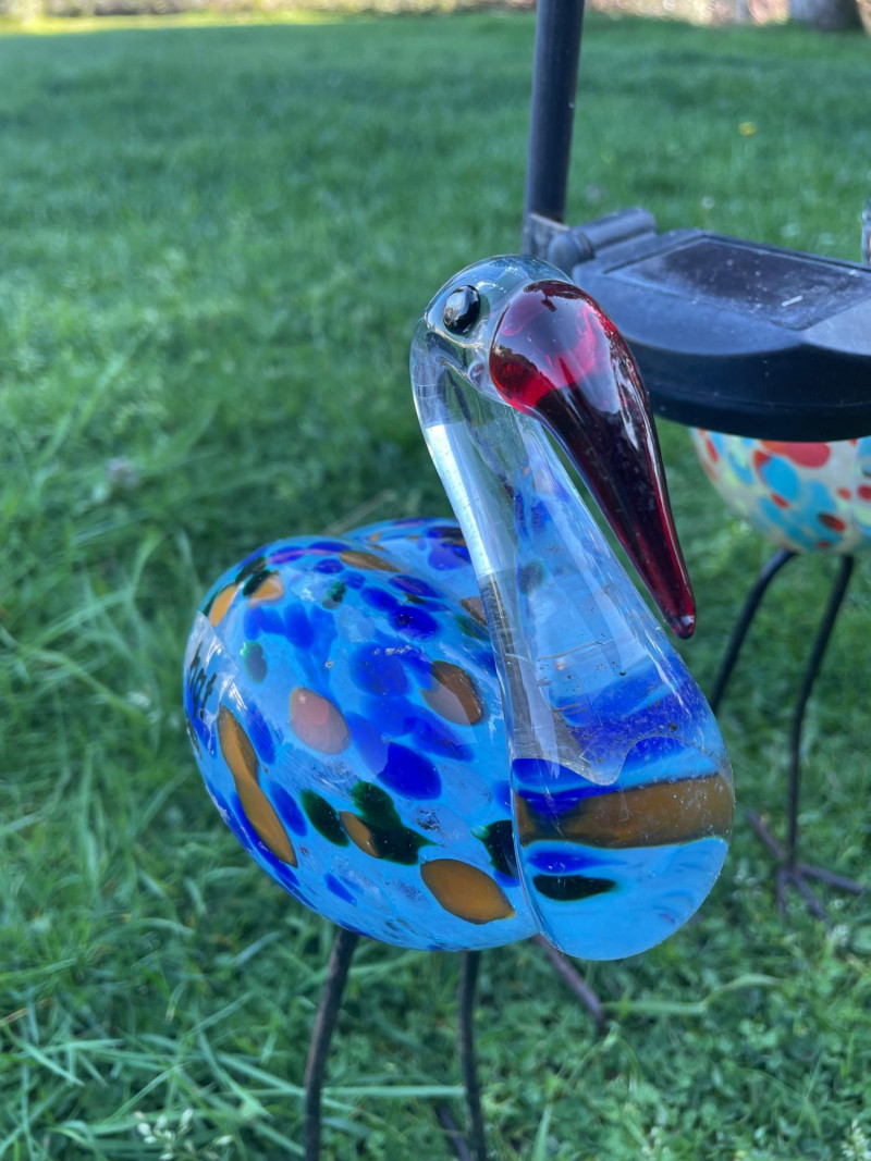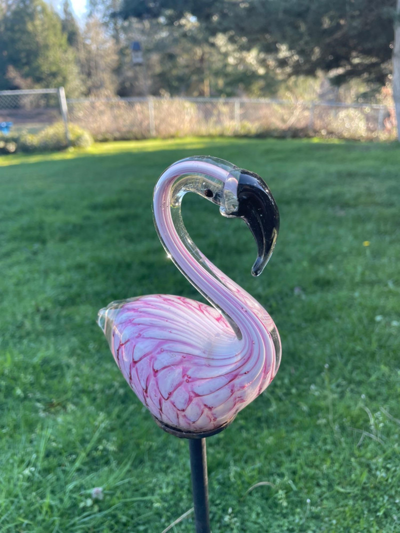 A playful trio of decorative glass yard birds, perfect for brightening garden beds, walkways, patios, or whimsical outdoor displays. This set blends vibrant color, handcrafted charm, and a touch of solar‑powered magic. Included Highlights: Tall Pink Flamingo- Two Colorful Glass Birds- Pre‑owned outdoor condition with typical weathering. All items sold AS IS, WHERE IS. Flamingo: 16”H Bird 6” x 4” (untested) Blue Standing Blue Bird: 13” H Bird 6” Standing Multi Color Bird: 12” Bird 6”‘hqt’ Flamingo Yard Art