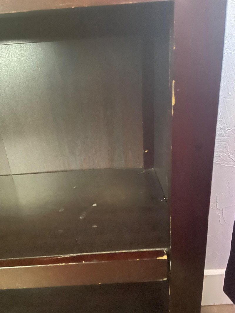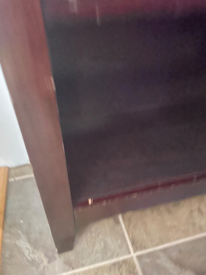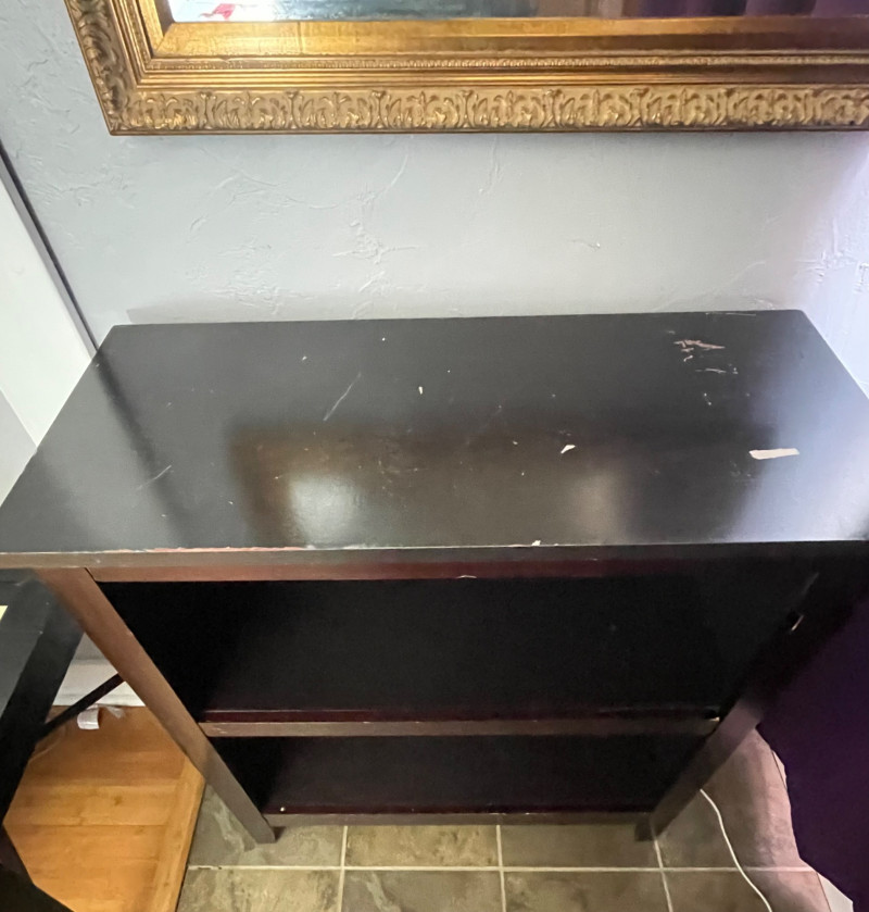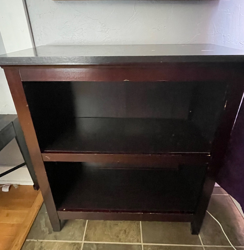 Two‑Shelf Bookcase — dark wood finish with open shelving; approx. 15” x 31” x 36” H