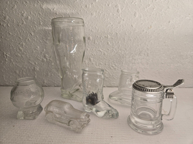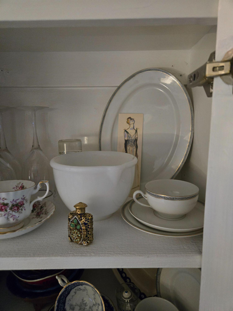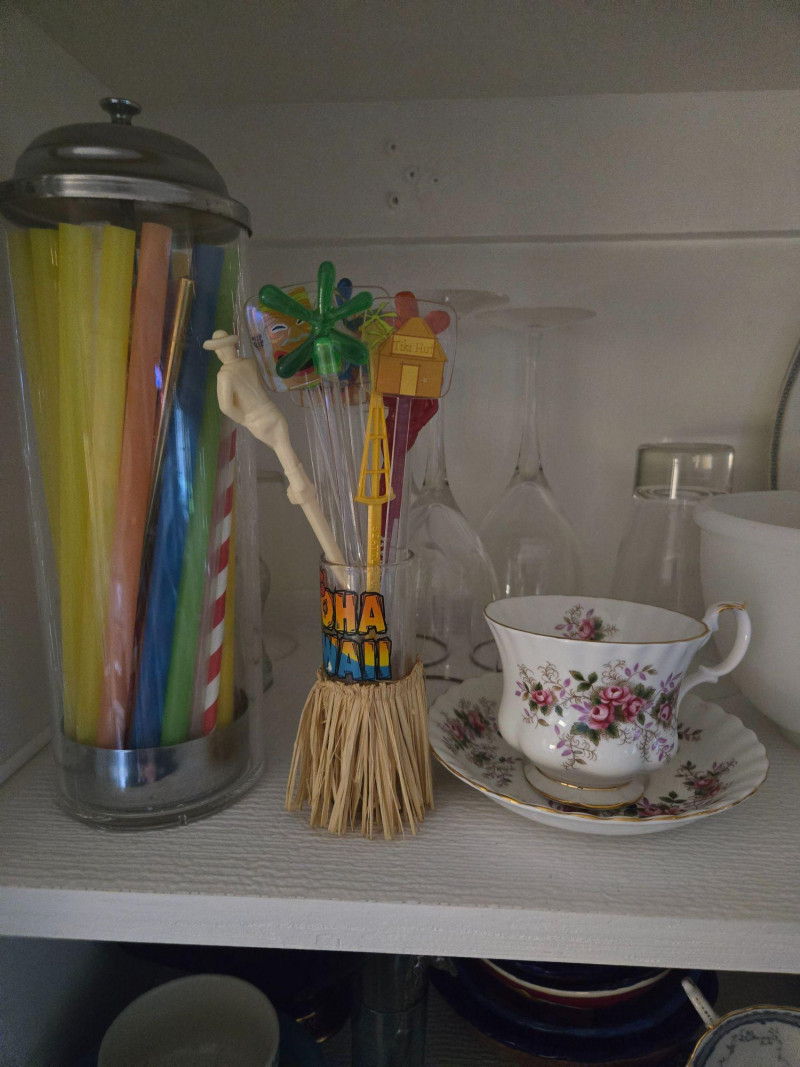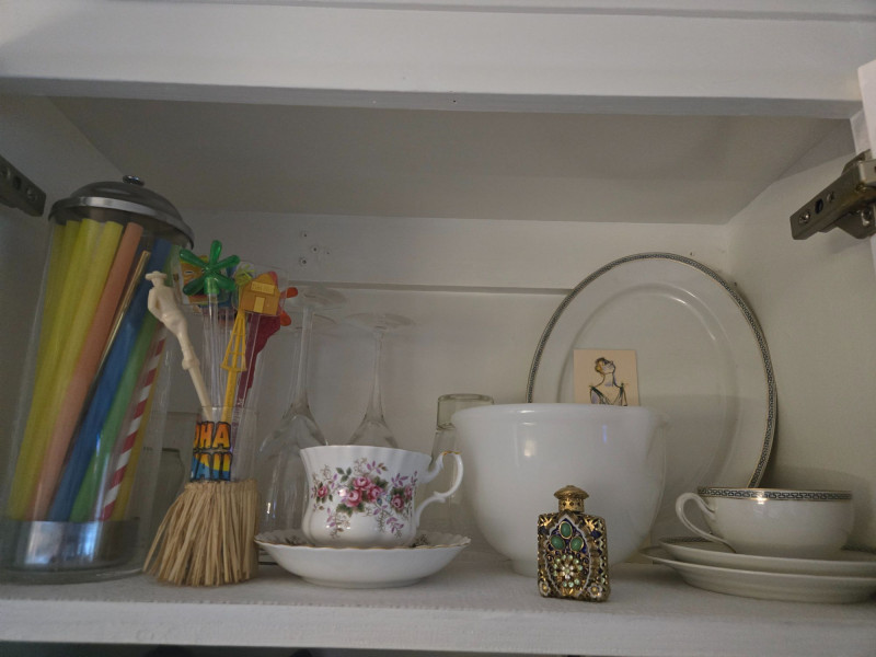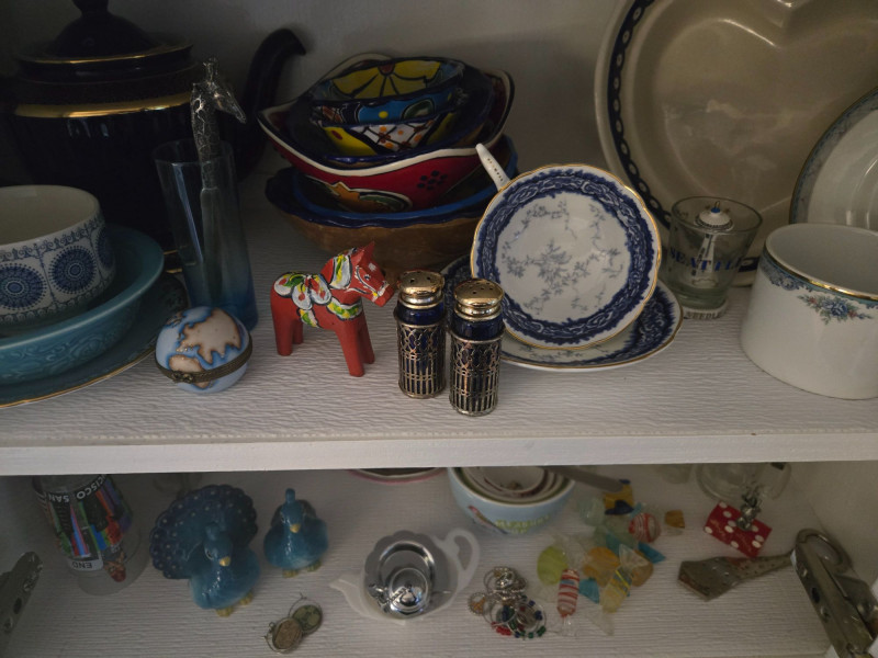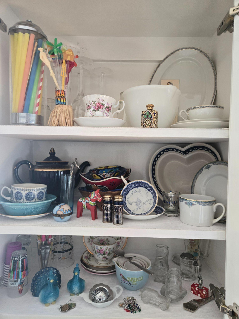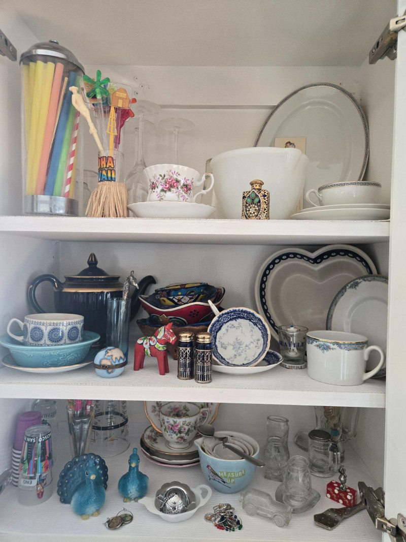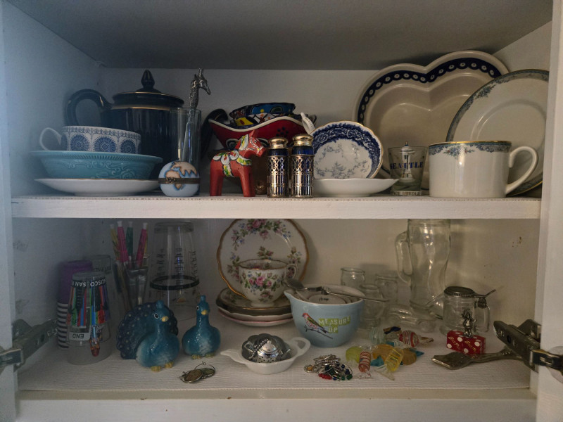 A delightful and eclectic “Cabinet of Treasures” filled with vintage, global, and whimsical pieces—perfect for collectors, decorators, or anyone who loves a curated mix of charm and character. This three‑shelf assortment includes: Top Shelf Highlights: Colorful straws and cocktail umbrellas Floral teacup and saucer Decorative glassware and plates Large white bowl Small ornate perfume bottle Middle Shelf Highlights: Deep blue teapot Blue‑patterned teacups and saucers Red wooden Dala‑style horse Two small decorative canisters Miniature globe ornament Blue‑and‑white bowls and plates Bottom Shelf Highlights: Glass jars and measuring cup Stacked floral teacups Pair of blue ceramic peacock figurines Small trinket dishes and glass containers Red dice‑shaped accent piece Mixed pre‑owned condition. Items show typical wear from use and age. All items sold AS IS, WHERE IS. Cabinet of Treasures