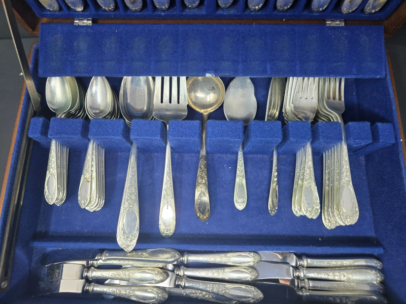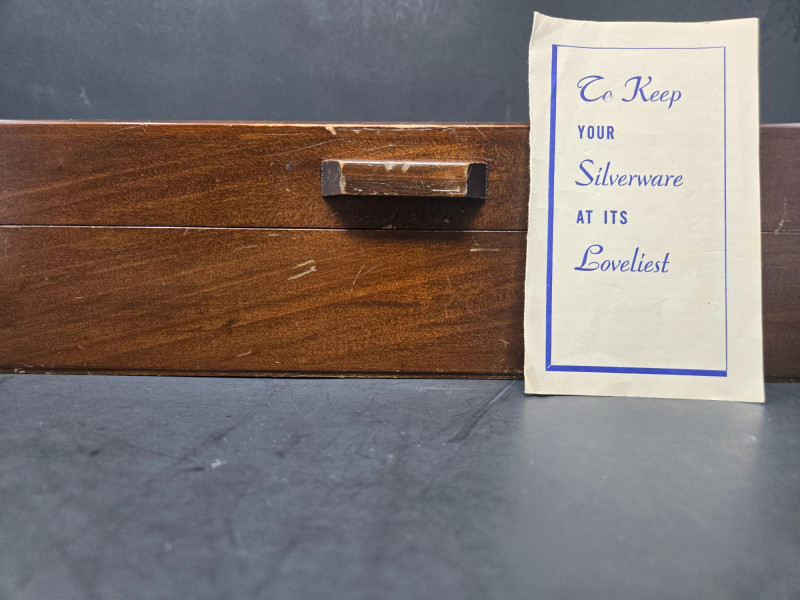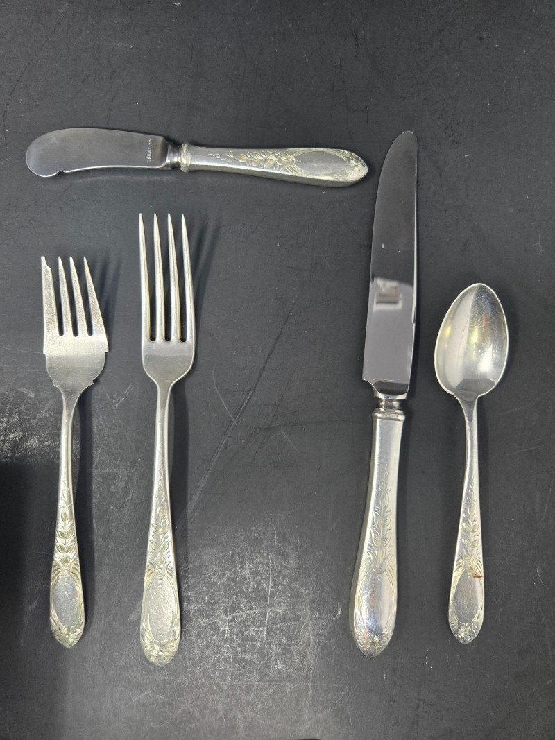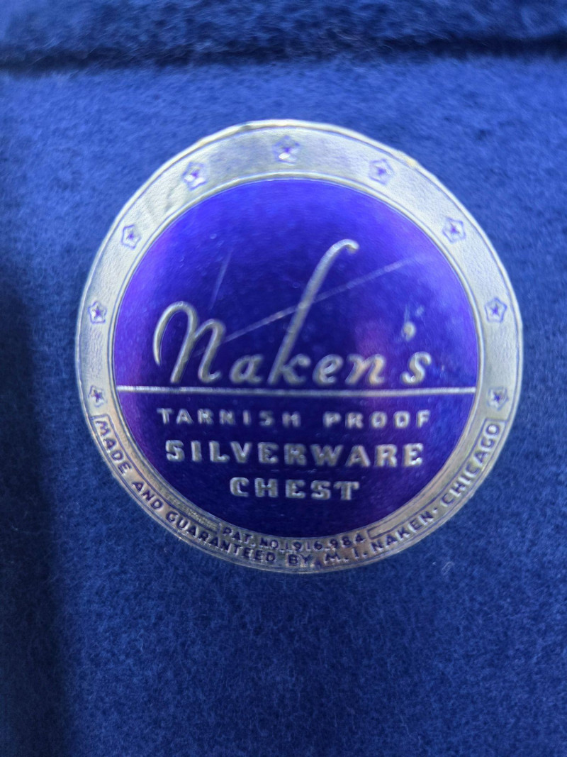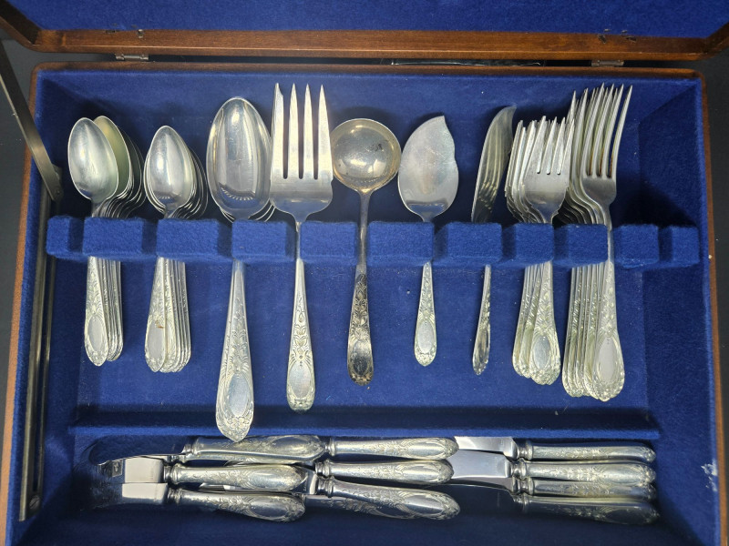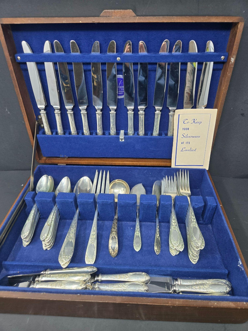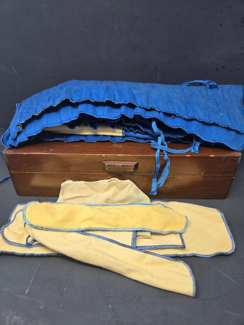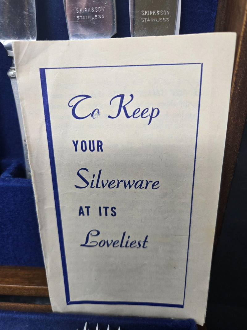 12 ea, dinner fork, sm forks, dinner knives & butter knives w/stainless blades. 24 teaspoons, 3 serving spoons, 1 gravy ladle, 1 serving fork and 2 fancy spreaders. And a 7.75 gr sterling server that does not match set. A beautifully kept, velvet‑lined flatware set A substantial 79‑piece sterling silver flatware collection by S. Kirk & Son, presented in a fitted wooden chest with blue velvet interior. The set features ornate, traditional patterning characteristic of Kirk’s craftsmanship, known for its weight, detail, and enduring quality. 12 Dinner Knives (upper tier) 816 total gr, subtract 25% f/stainless ='s 612 total gr 12 ea Forks & Spoons in matching pattern Serving Utensils (3 spoons, 1 fork, 1 ladle, 2 fancy spreaders) 12 butter 516 total gr subtract 25% f/stainless ='s 487 total gr Original Care Card included inside the chest Total Weight: 3192 grams (as listed) Housed in a wooden storage chest with blue velvet lining Pre‑owned, well‑kept set with typical light wear from age and storage. Chest shows expected use. All items sold AS IS, WHERE IS.S. Kirk & Son 79‑Piece Sterling Silver (3192 total gr)