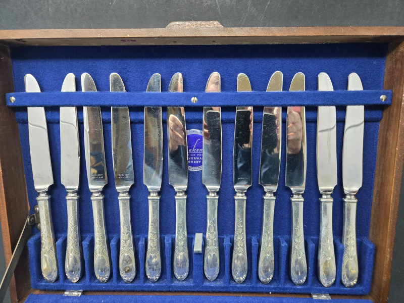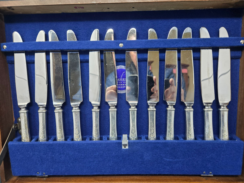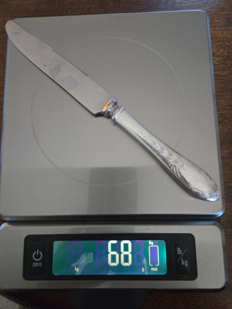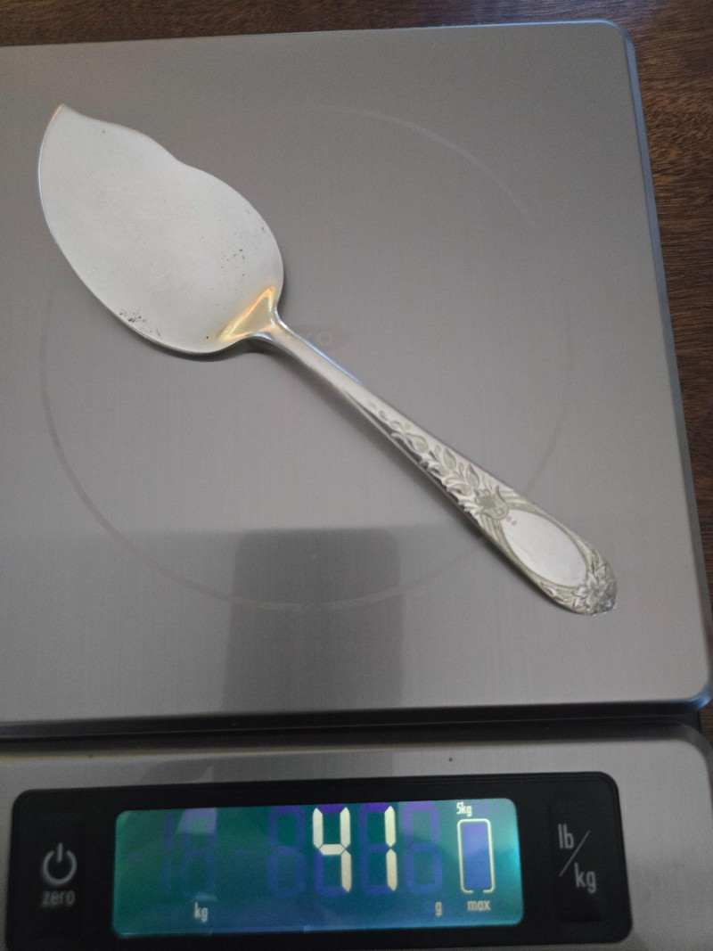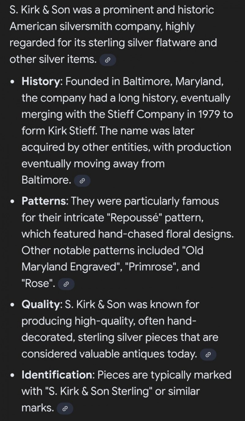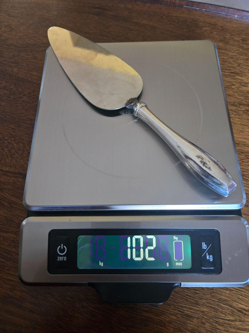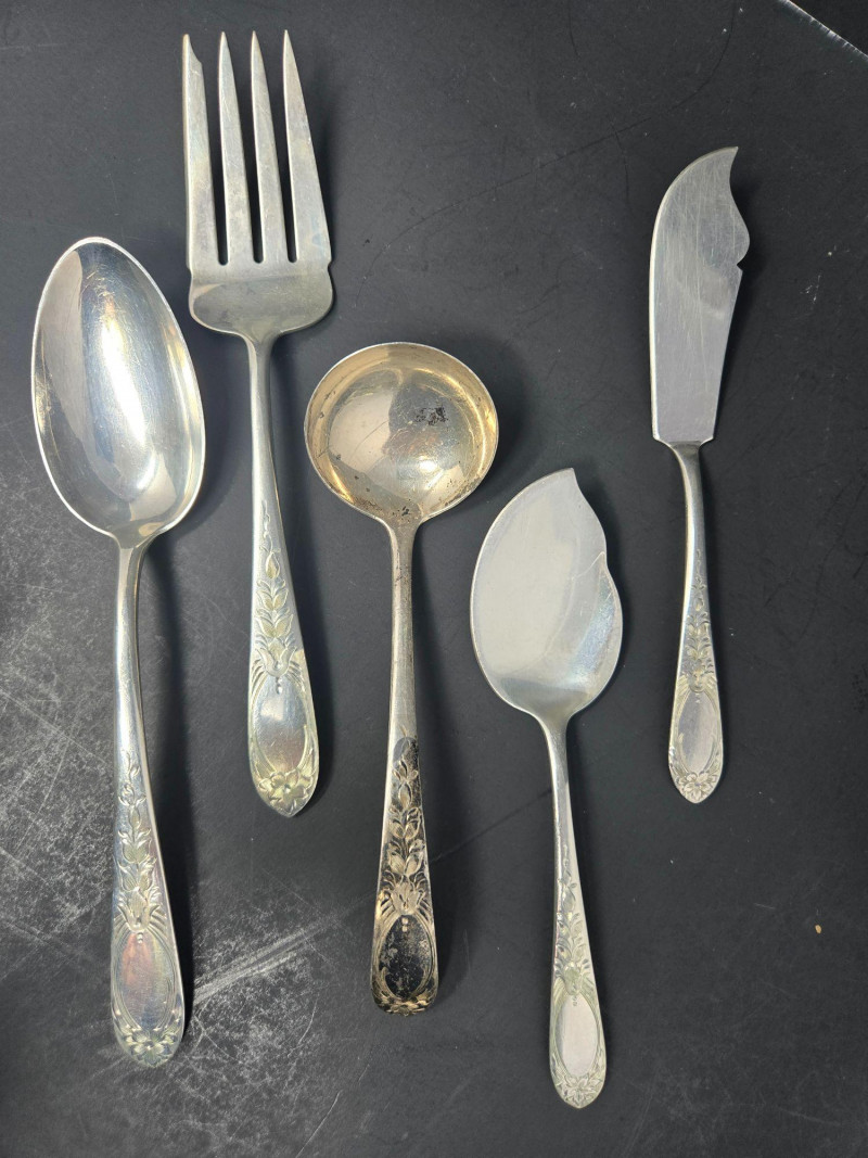 12 ea, dinner fork, sm forks, dinner knives & butter knives w/stainless blades. 24 teaspoons, 3 serving spoons, 1 gravy ladle, 1 serving fork and 2 fancy spreaders. And a 7.75 gr sterling server that does not match set. A beautifully kept, velvet‑lined flatware set A substantial 79‑piece sterling silver flatware collection by S. Kirk & Son, presented in a fitted wooden chest with blue velvet interior. The set features ornate, traditional patterning characteristic of Kirk’s craftsmanship, known for its weight, detail, and enduring quality. 12 Dinner Knives (upper tier) 816 total gr, subtract 25% f/stainless ='s 612 total gr 12 ea Forks & Spoons in matching pattern Serving Utensils (3 spoons, 1 fork, 1 ladle, 2 fancy spreaders) 12 butter 516 total gr subtract 25% f/stainless ='s 487 total gr Original Care Card included inside the chest Total Weight: 3192 grams (as listed) Housed in a wooden storage chest with blue velvet lining Pre‑owned, well‑kept set with typical light wear from age and storage. Chest shows expected use. All items sold AS IS, WHERE IS.S. Kirk & Son 79‑Piece Sterling Silver (3192 total gr)
