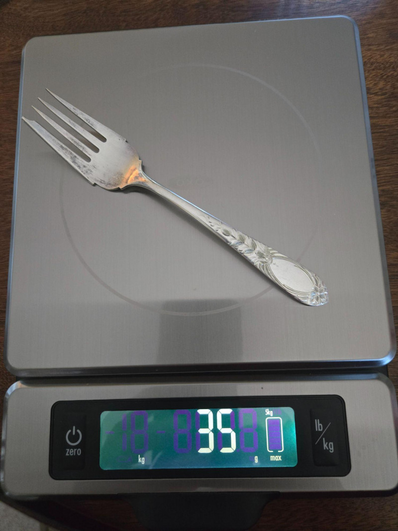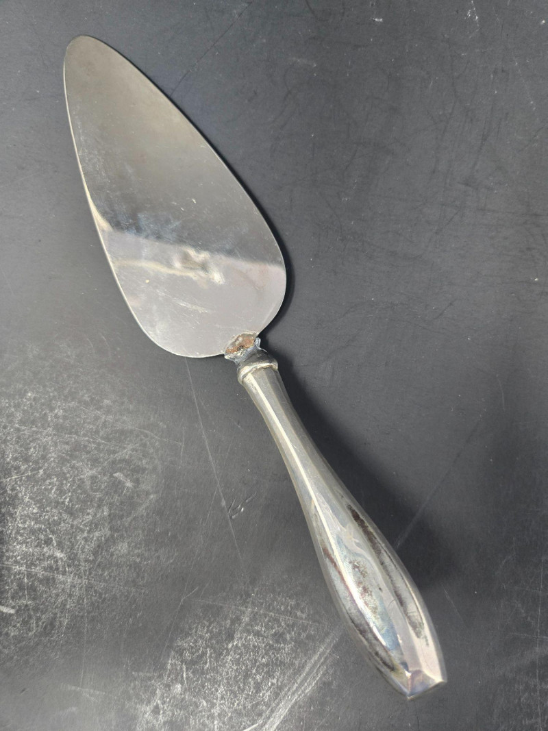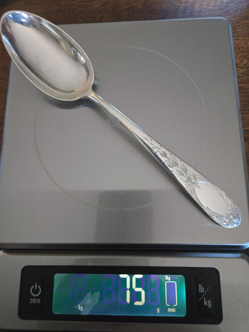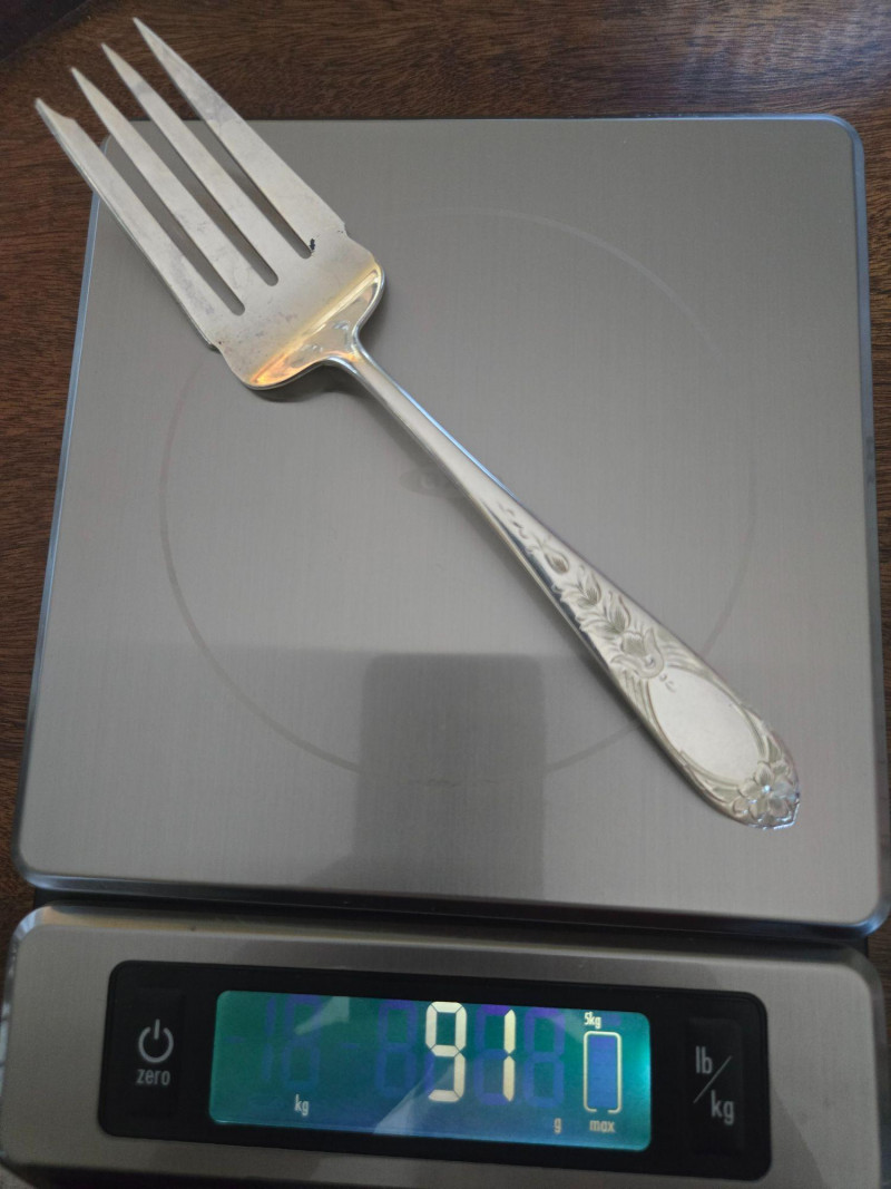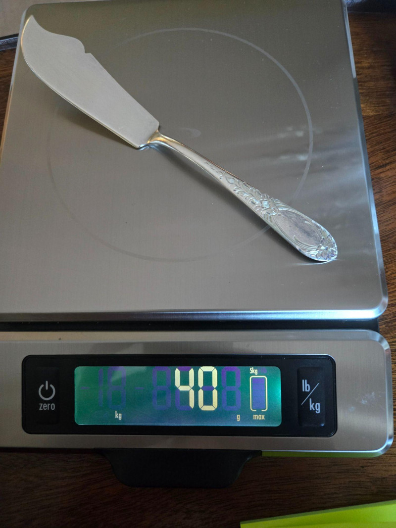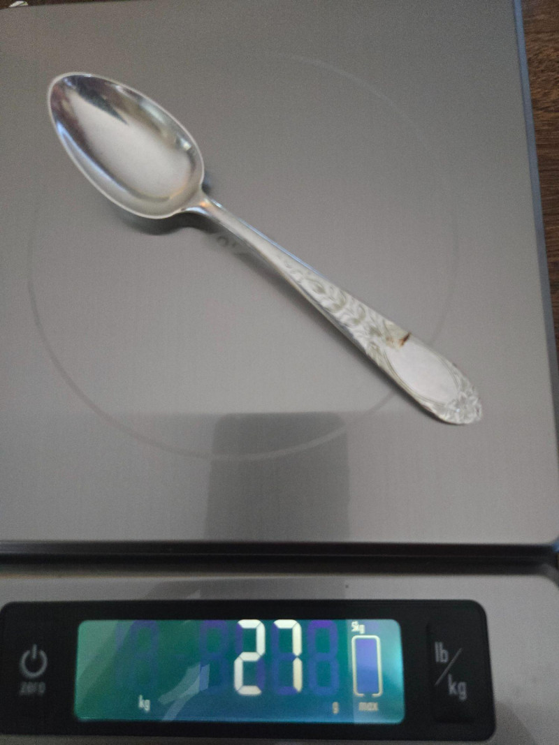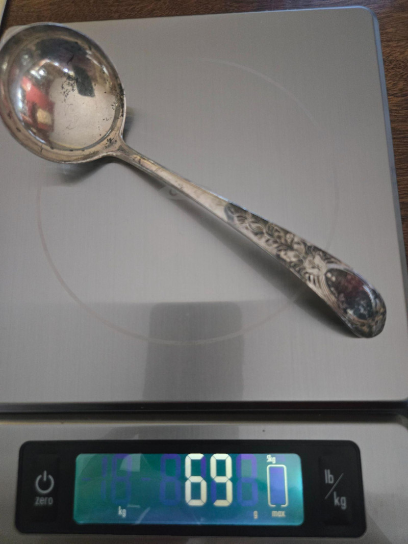12 ea, dinner fork, sm forks, dinner knives & butter knives w/stainless blades. 24 teaspoons, 3 serving spoons, 1 gravy ladle, 1 serving fork and 2 fancy spreaders. And a 7.75 gr sterling server that does not match set. A beautifully kept, velvet‑lined flatware set A substantial 79‑piece sterling silver flatware collection by S. Kirk & Son, presented in a fitted wooden chest with blue velvet interior. The set features ornate, traditional patterning characteristic of Kirk’s craftsmanship, known for its weight, detail, and enduring quality. 12 Dinner Knives (upper tier) 816 total gr, subtract 25% f/stainless ='s 612 total gr 12 ea Forks & Spoons in matching pattern Serving Utensils (3 spoons, 1 fork, 1 ladle, 2 fancy spreaders) 12 butter 516 total gr subtract 25% f/stainless ='s 487 total gr Original Care Card included inside the chest Total Weight: 3192 grams (as listed) Housed in a wooden storage chest with blue velvet lining Pre‑owned, well‑kept set with typical light wear from age and storage. Chest shows expected use. All items sold AS IS, WHERE IS.S. Kirk & Son 79‑Piece Sterling Silver (3192 total gr)