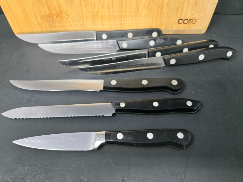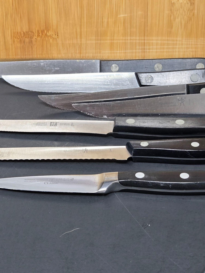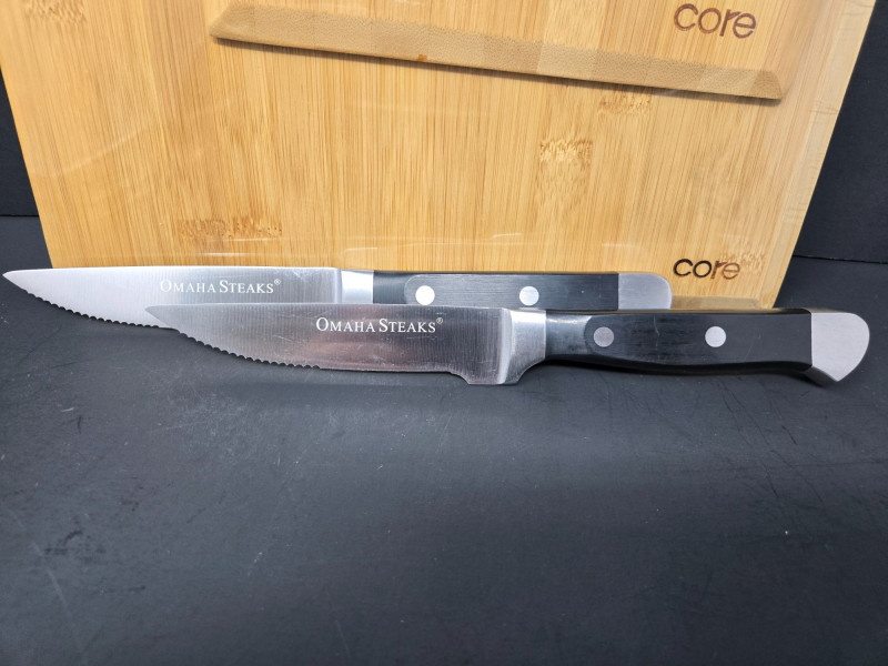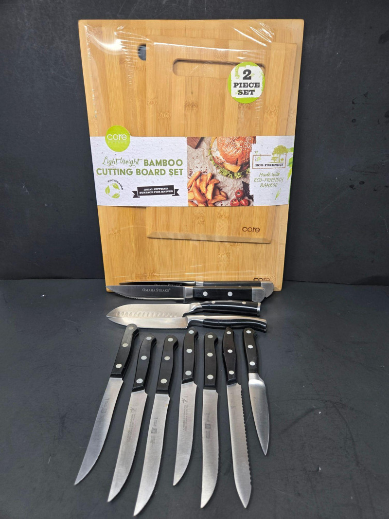 Lot # 70 - 2 Bamboo Boards & Knives, Henkle, Emeril, Omaha Steaks & Onieda