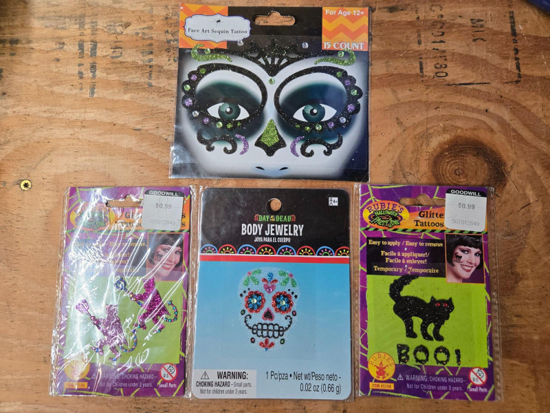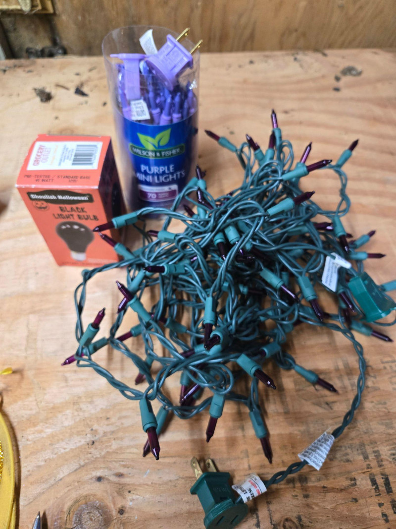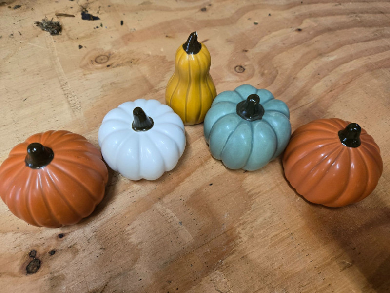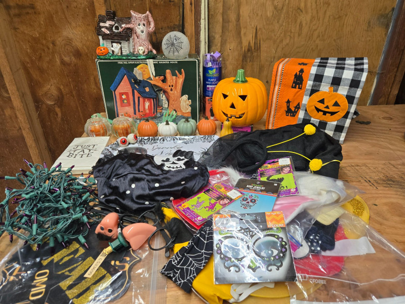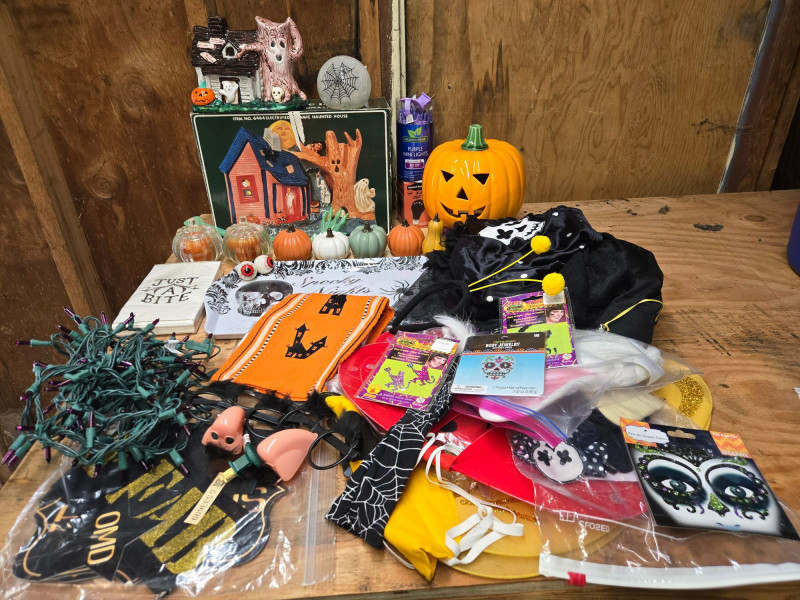 A fun, festive, and varied Halloween décor and costume assortment, perfect for spooky‑season decorating, parties, or crafting your own haunted display. This colorful mixed lot includes: Decor & Display Items: Assorted decorative pumpkins in orange, white, and green Large plastic jack‑o’‑lantern Haunted house tabletop décor with ghosts Pair of ceramic ghost figurines “JUST ONE BITE” sign String of green Halloween lights Costumes & Accessories: Masks, wigs, and costume pieces Packaged novelty items including fake noses and themed accessories Spiderweb‑patterned fabric Halloween socks/sleeves with black cat silhouettes Mixed pre‑owned condition with typical seasonal wear. All items sold AS IS, WHERE IS.Halloween
