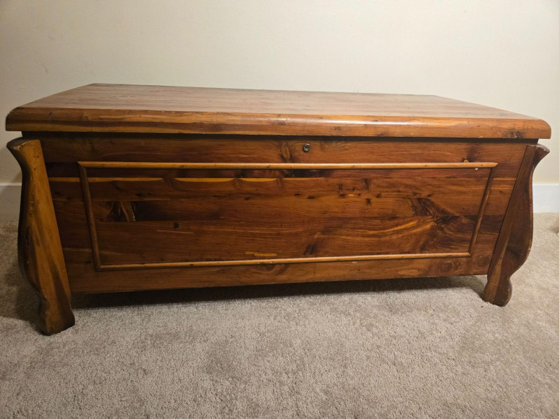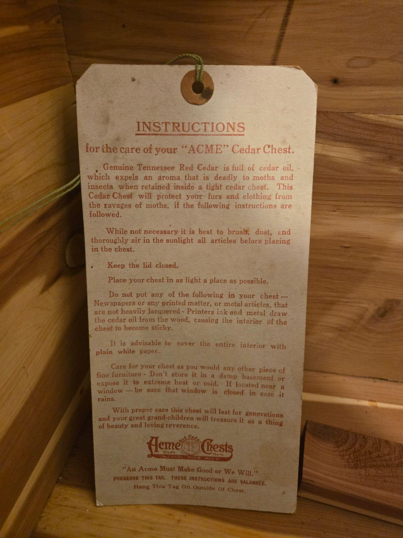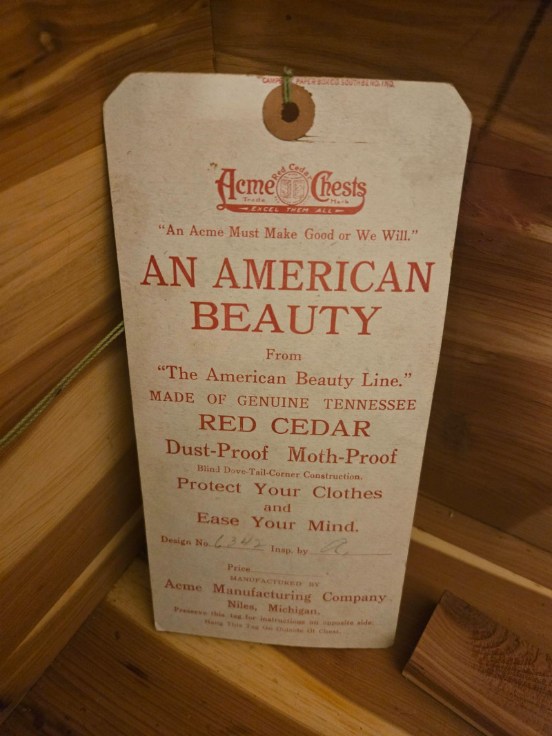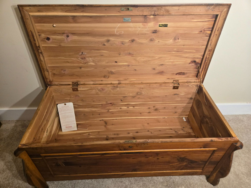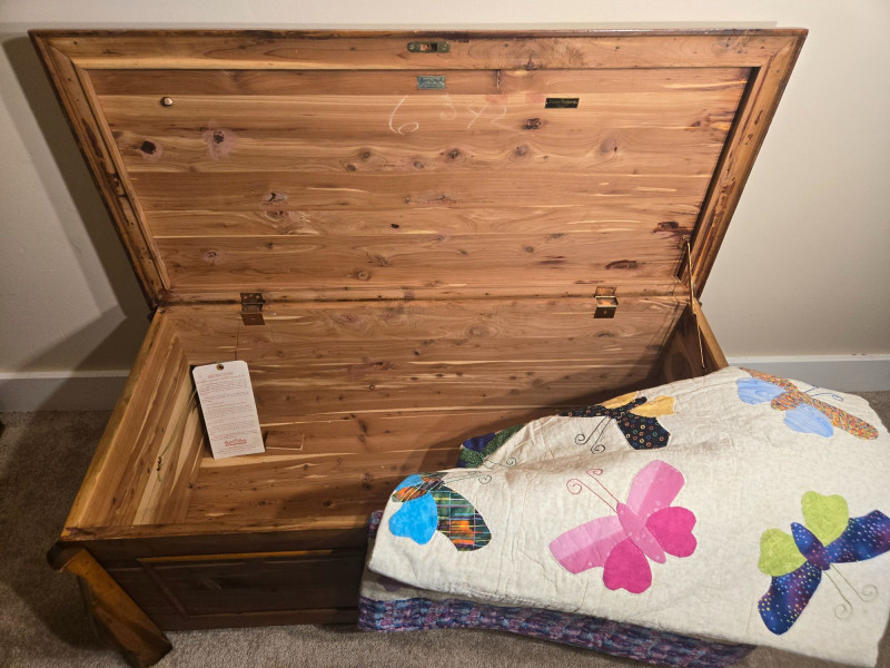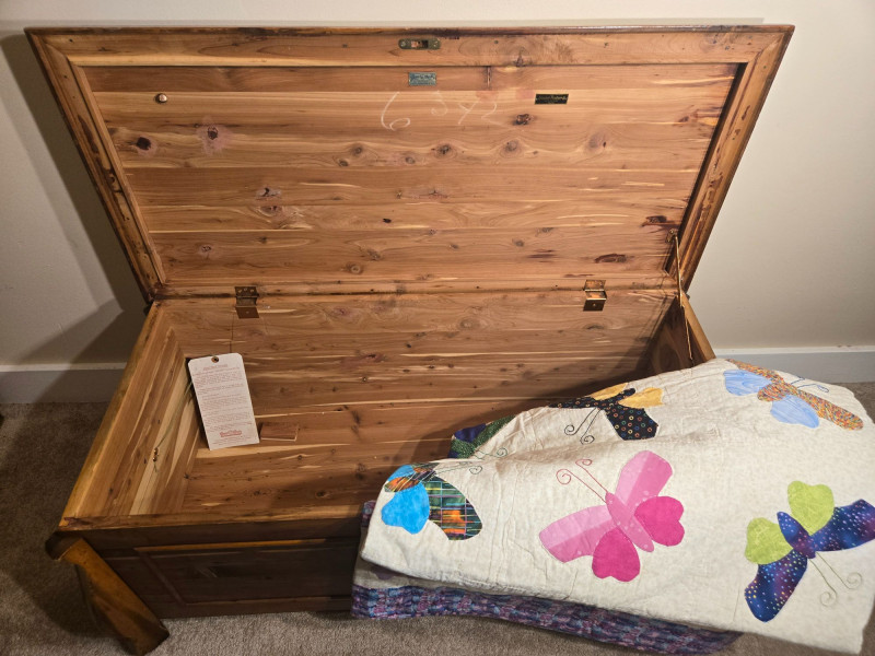 “An American Beauty” Antique Cedar Hope Chest w/ Vintage Quilt Chest: 19"d × 18.5"t × 42"w • Quilt: 98" × 79" A beautifully preserved antique cedar hope chest, affectionately titled “An American Beauty,” featuring classic cedar construction, brass hardware, and the warm, aromatic interior these trunks are known for. The chest opens smoothly to reveal clean cedar planking and an interior label, with light age‑appropriate markings that add to its authenticity. Draped over the front is a never before used, vintage butterfly‑pattern quilt, vibrant with multicolored appliqué and stitching. The quilt’s generous size makes it suitable for display, layering, or repurposing in décor. Solid cedar hope chest with original interior label Brass hinges and latch hardware Clean interior with natural cedar grain Vintage quilt with colorful butterfly motif Shows typical wear consistent with age; cedar interior presents well. Quilt displays expected vintage softness and use. Sold AS IS.