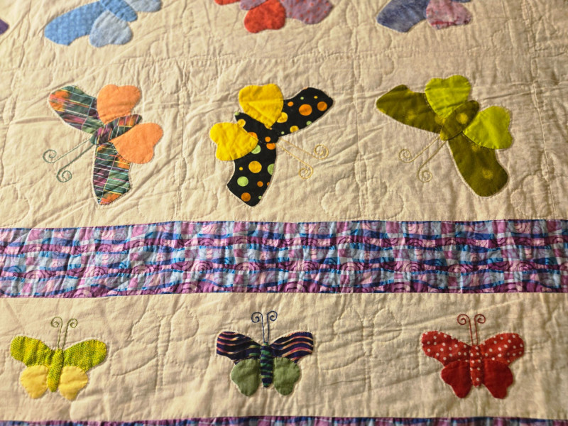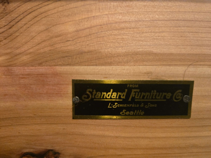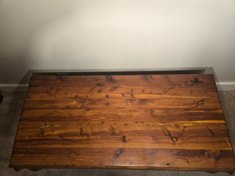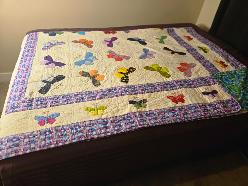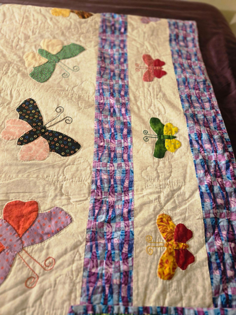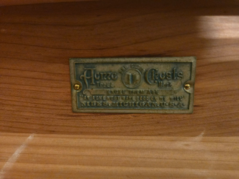 “An American Beauty” Antique Cedar Hope Chest w/ Vintage Quilt Chest: 19"d × 18.5"t × 42"w • Quilt: 98" × 79" A beautifully preserved antique cedar hope chest, affectionately titled “An American Beauty,” featuring classic cedar construction, brass hardware, and the warm, aromatic interior these trunks are known for. The chest opens smoothly to reveal clean cedar planking and an interior label, with light age‑appropriate markings that add to its authenticity. Draped over the front is a never before used, vintage butterfly‑pattern quilt, vibrant with multicolored appliqué and stitching. The quilt’s generous size makes it suitable for display, layering, or repurposing in décor. Solid cedar hope chest with original interior label Brass hinges and latch hardware Clean interior with natural cedar grain Vintage quilt with colorful butterfly motif Shows typical wear consistent with age; cedar interior presents well. Quilt displays expected vintage softness and use. Sold AS IS.