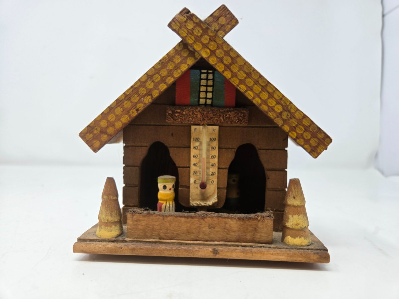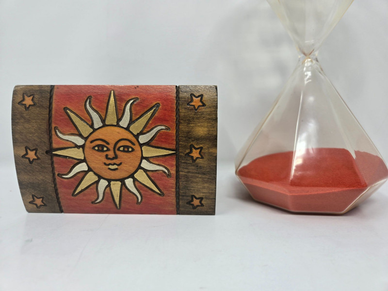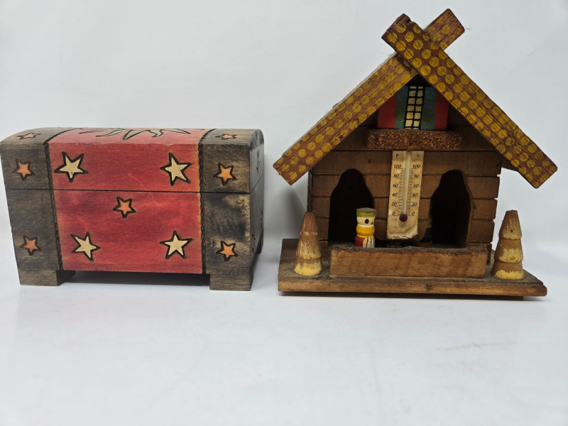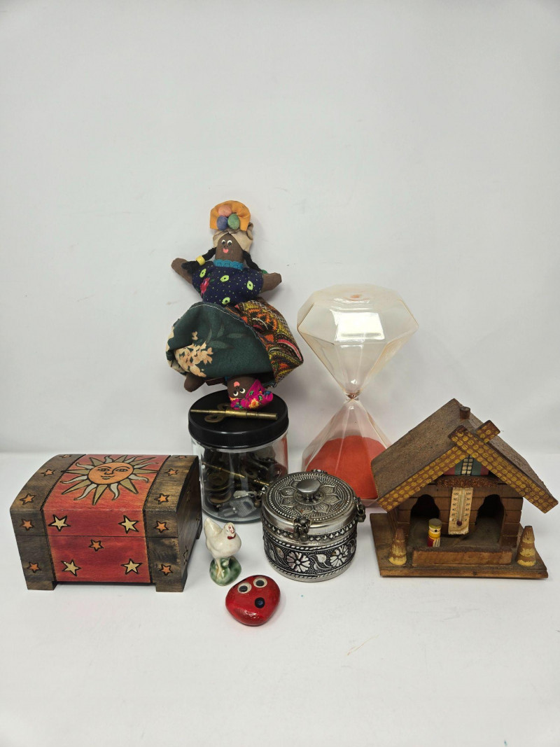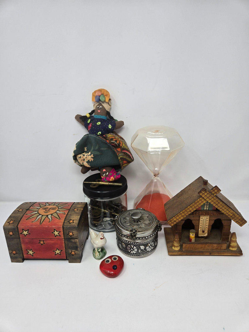 A charming and varied assortment of vintage and collectible curios, blending folk art, whimsy, and classic decorative pieces. This curated lot includes: Handmade Cloth Doll in colorful traditional dress Large Hourglass with vivid red sand Painted Wooden Chest featuring sun, moon, and star motifs Glass Jar of Vintage Keys — great for décor or craft projects Ornate Silver‑Tone Trinket Box with floral engraving Ceramic Chicken Figurine Red Heart Stone with googly eyes — playful and quirky Wooden Weather House with thermometer and figurines Mixed pre‑owned condition with age‑appropriate wear. All items sold AS IS, WHERE IS.Vintage & Collectible