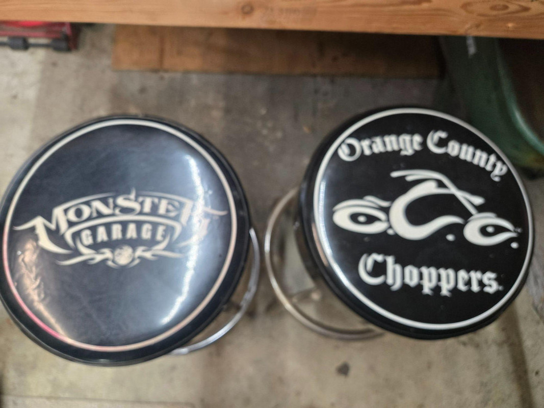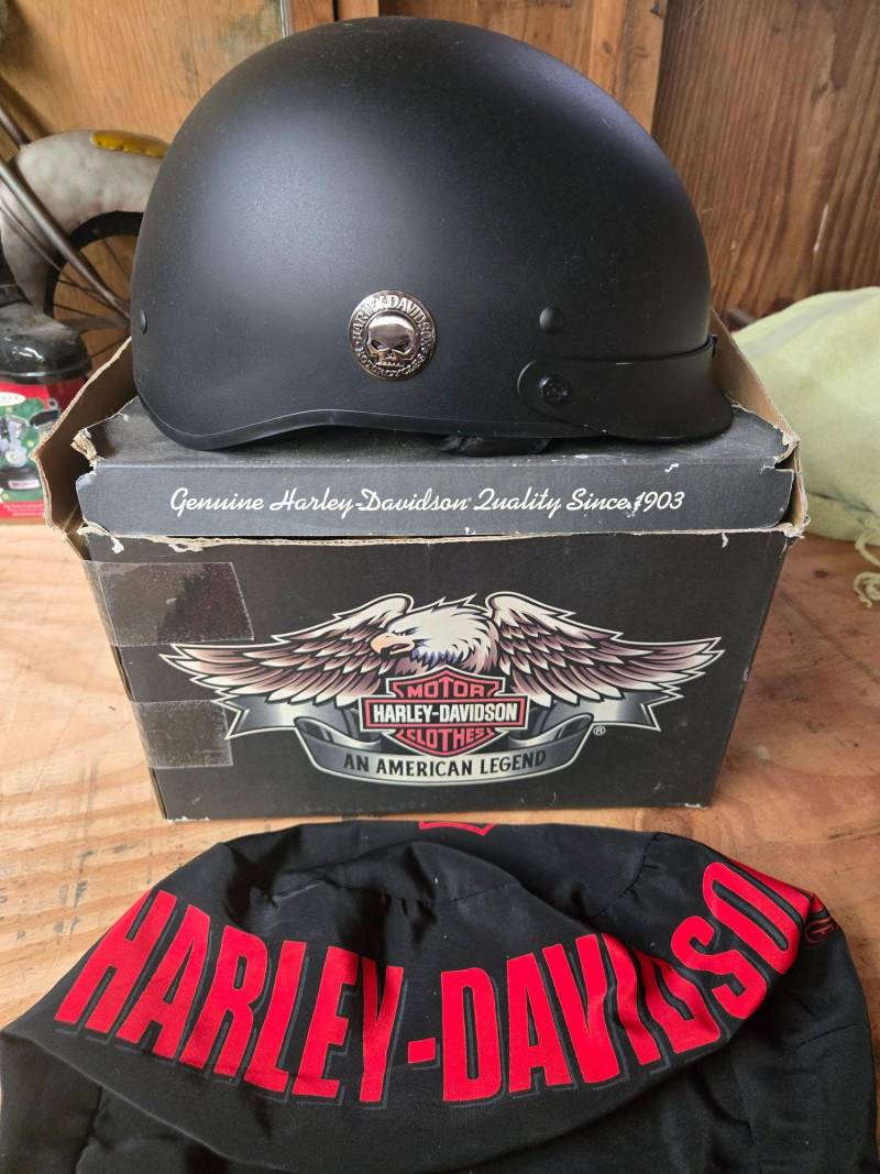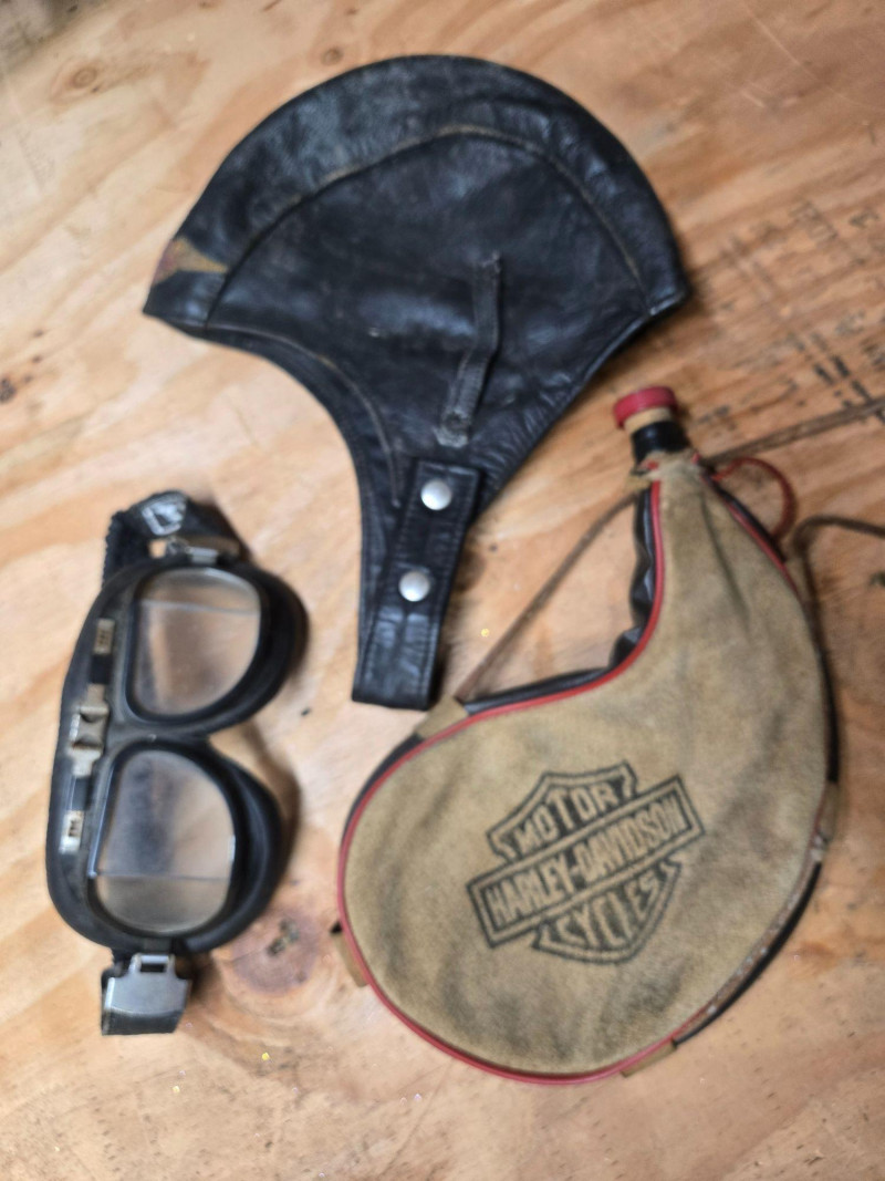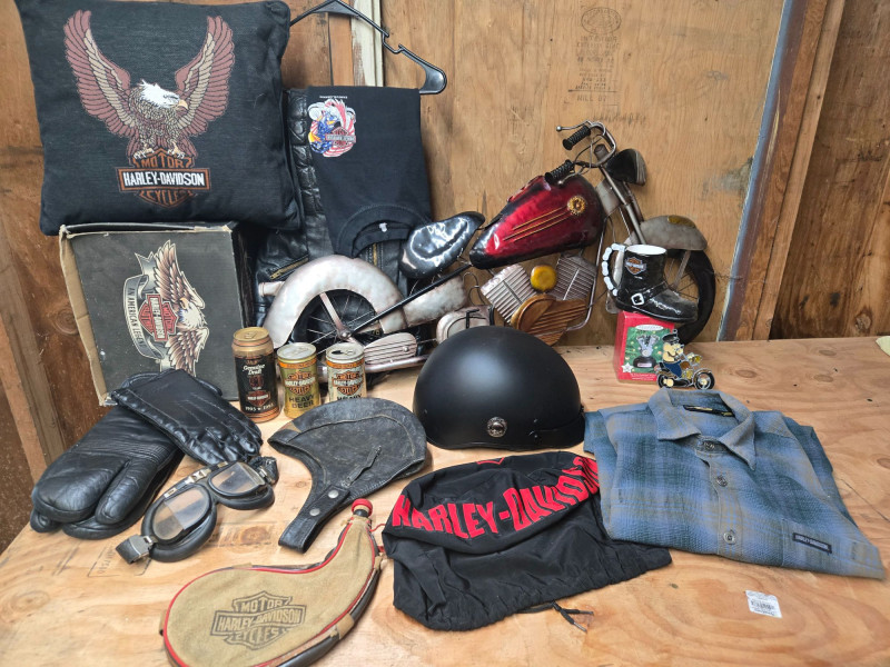 A sharp, biker‑ready assortment featuring a Harley‑style helmet in like‑new condition, paired with ladies' vintage leather pants (petite) and additional riding accessories and a couple of fun bar stools. Harley helmet – excellent, like‑new condition/size small Ladies vintage leather pants – petite sizing; classic cut and soft, broken‑in leather Additional riding items – assorted smalls included in the lot Helmet presents in like‑new condition. Leather pants show expected vintage wear and softness. All items sold AS IS.Harley “Like New” Helmet, Ladies Vintage Leather Pants (Petite) & More