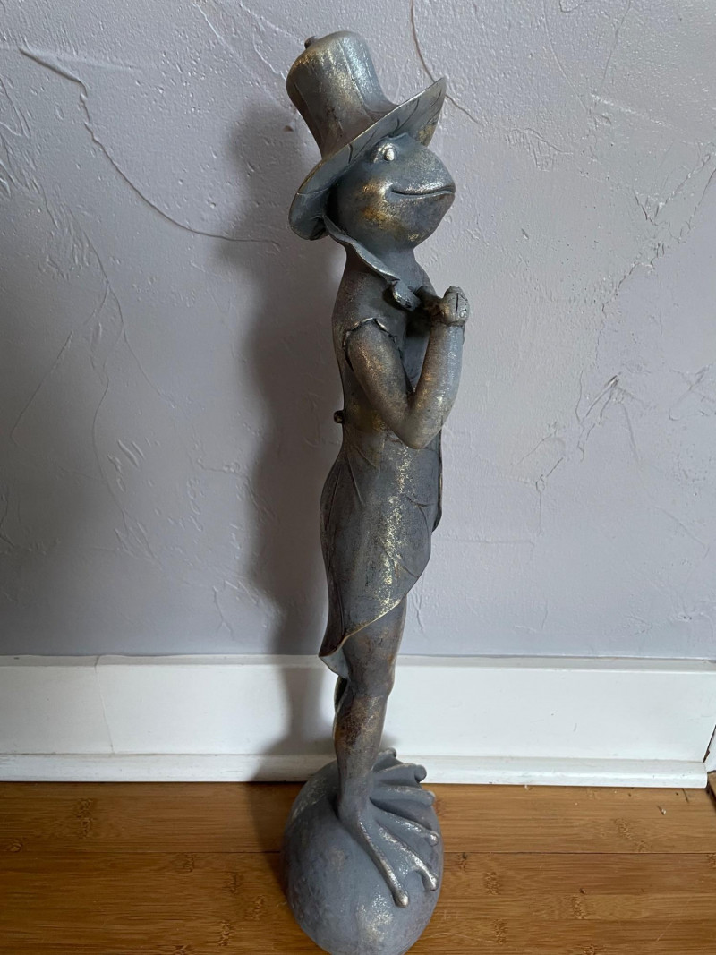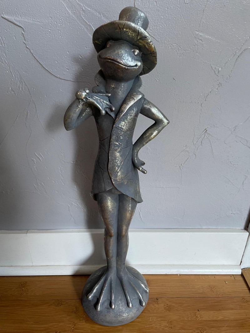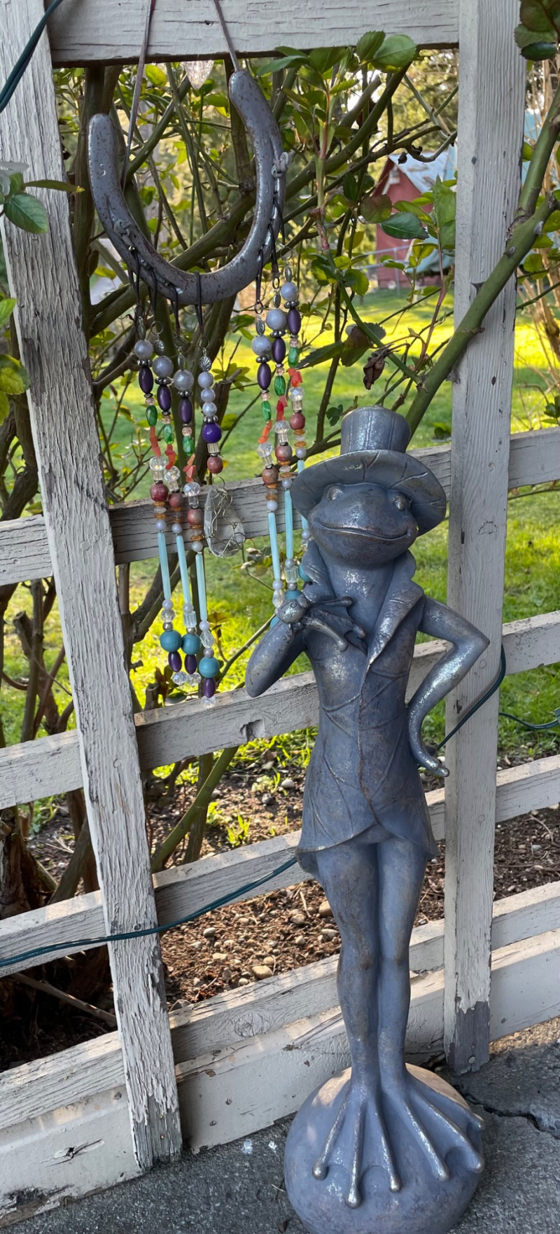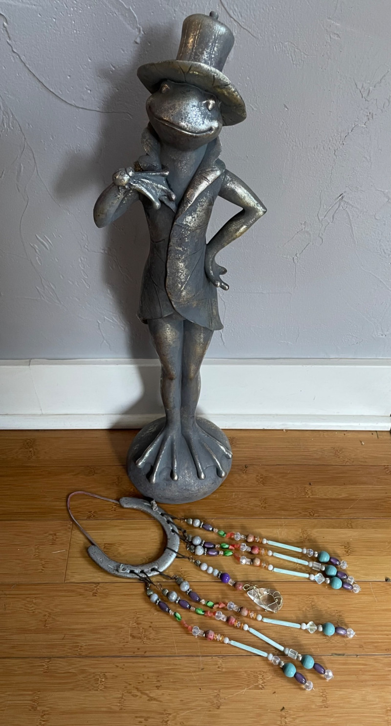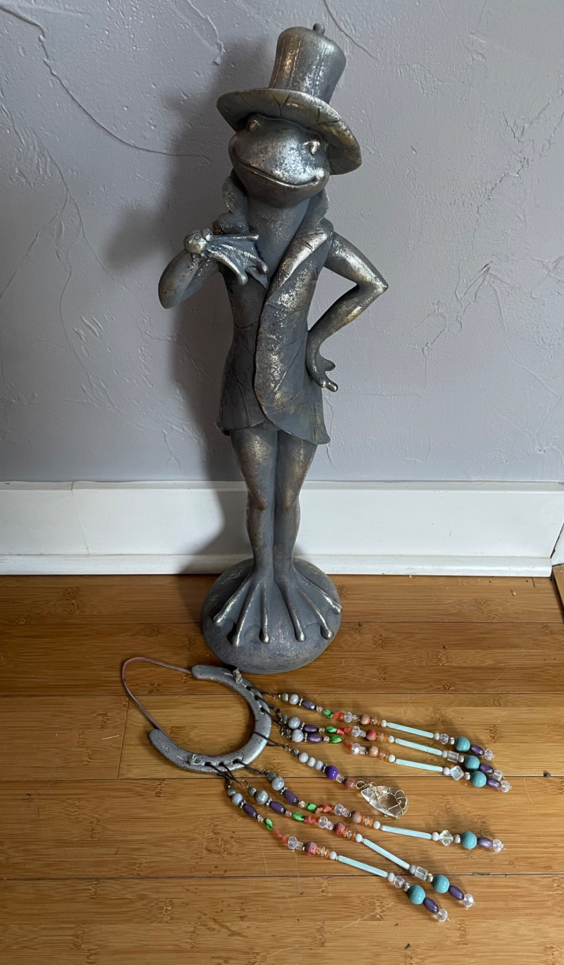 A charming, eclectic pairing of garden décor featuring a whimsical metal frog sculpture and a colorful beaded sun catcher set. Perfect for patios, porches, garden paths, or indoor accent displays. Included Highlights: Metal Frog Sculpture (Resin) Tall, upright frog in a suit and top hat Silver‑tone finish with artistic, weathered texture Stands on a round base; great statement piece for garden or entryway Beaded Sun Catcher Set Multi‑strand beaded design with vibrant colors: purples, turquoise, orange, green, and clear Includes wire‑wrapped crystal pendant Pre‑owned condition with typical wear from display. All items sold AS IS, WHERE IS. Frog Statue: 26” H x 7” Base (Resin) Sun Catcher: 15”Fancy Frog Decor and Sun Catcher
