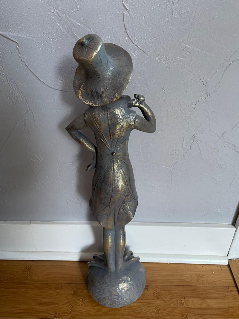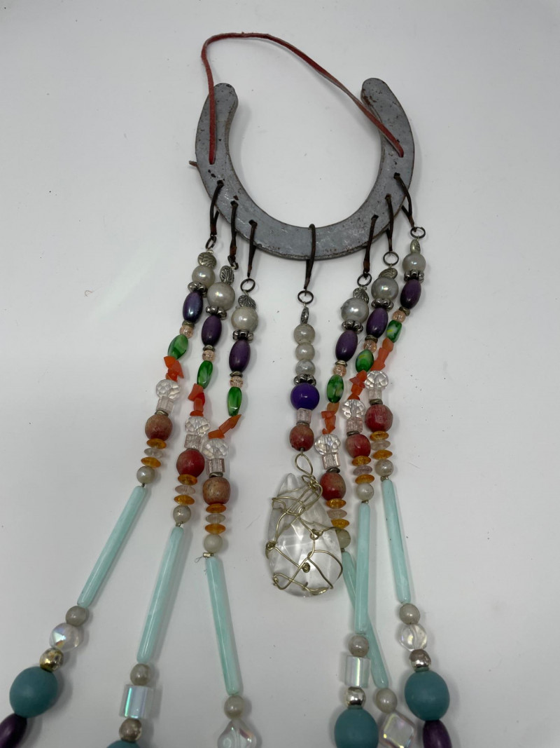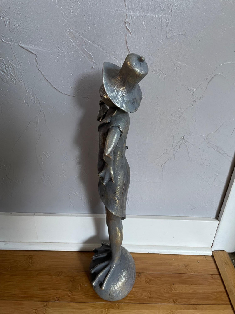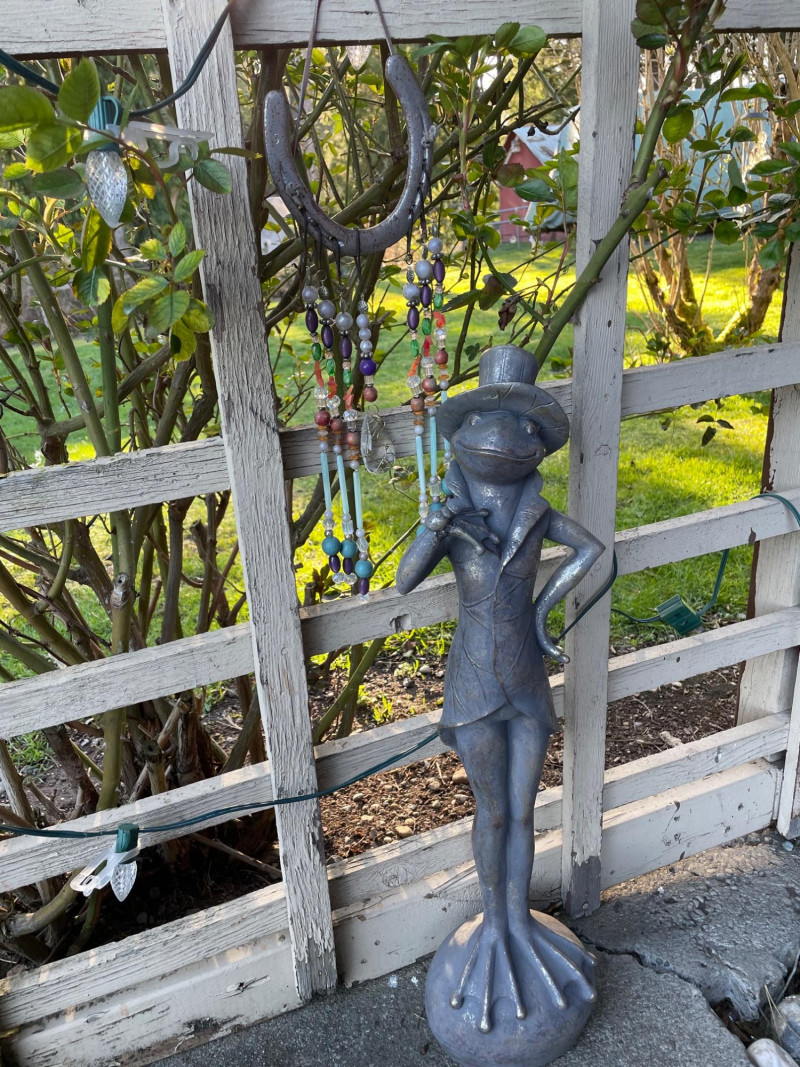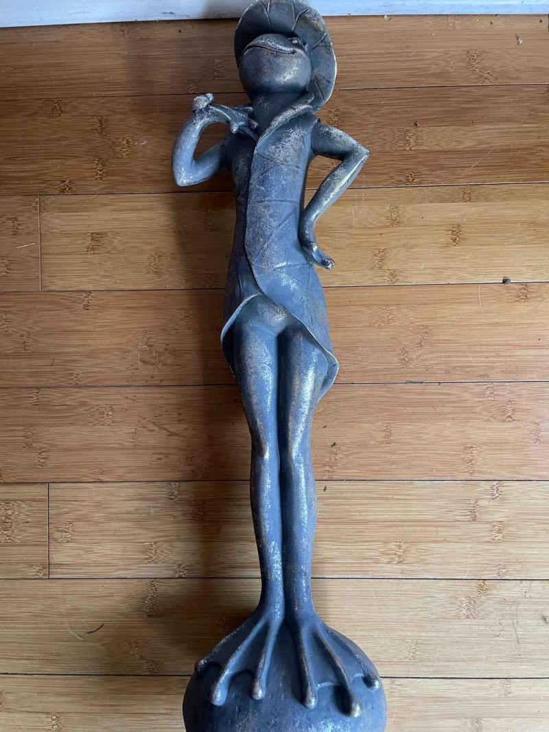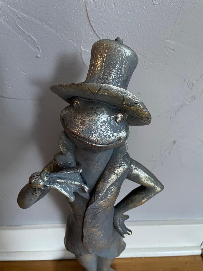 A charming, eclectic pairing of garden décor featuring a whimsical metal frog sculpture and a colorful beaded sun catcher set. Perfect for patios, porches, garden paths, or indoor accent displays. Included Highlights: Metal Frog Sculpture (Resin) Tall, upright frog in a suit and top hat Silver‑tone finish with artistic, weathered texture Stands on a round base; great statement piece for garden or entryway Beaded Sun Catcher Set Multi‑strand beaded design with vibrant colors: purples, turquoise, orange, green, and clear Includes wire‑wrapped crystal pendant Pre‑owned condition with typical wear from display. All items sold AS IS, WHERE IS. Frog Statue: 26” H x 7” Base (Resin) Sun Catcher: 15”Fancy Frog Decor and Sun Catcher