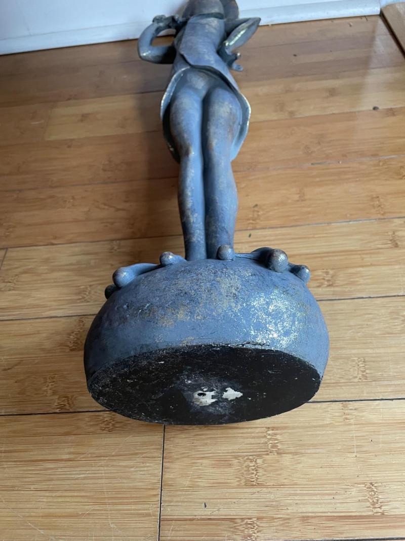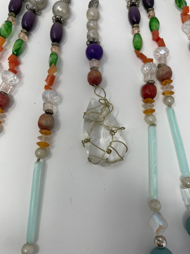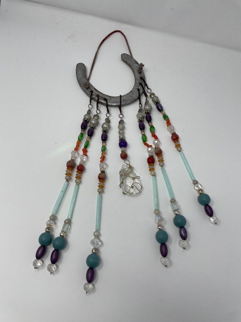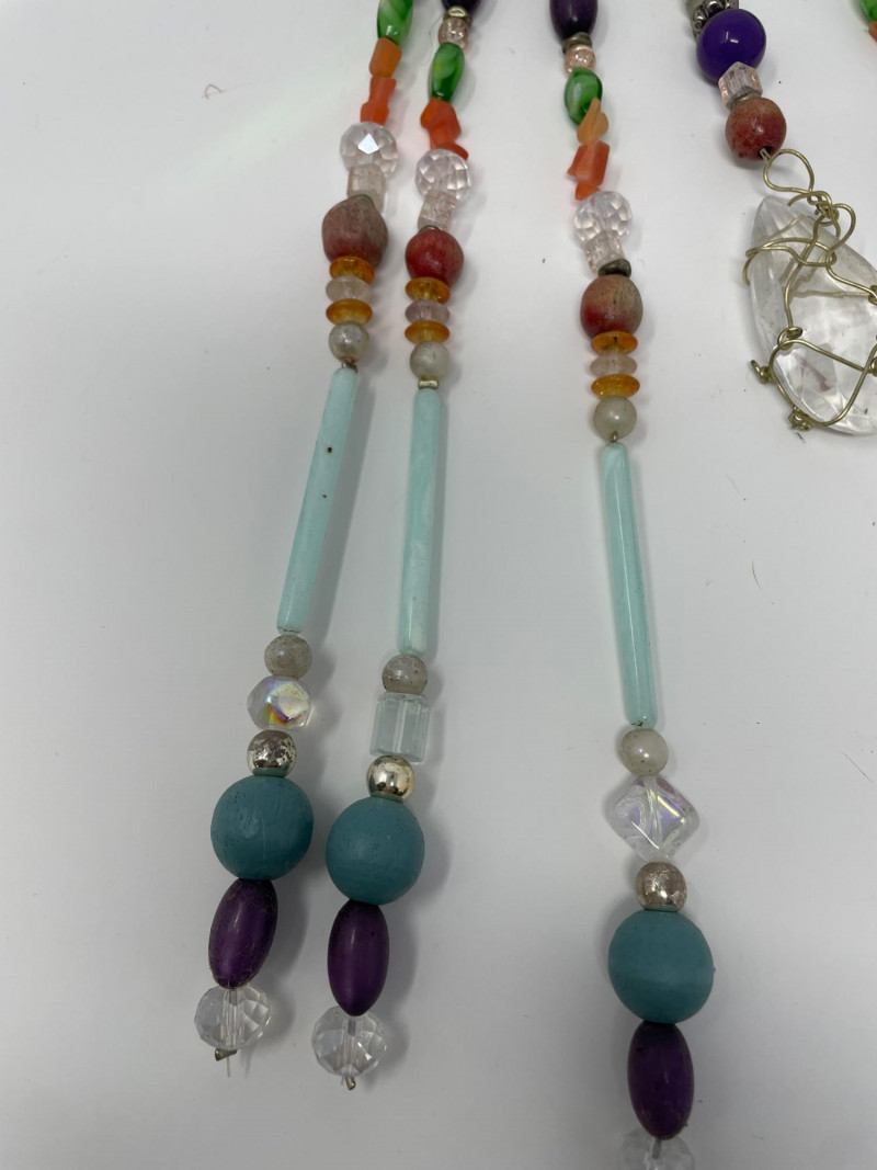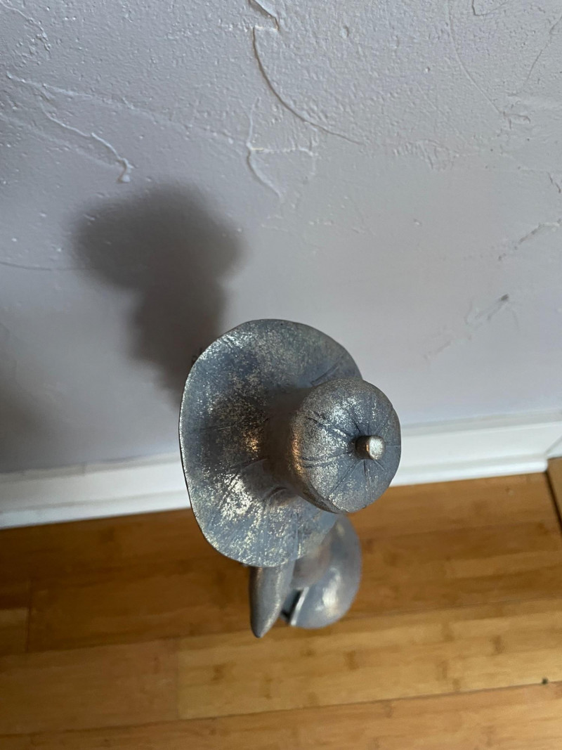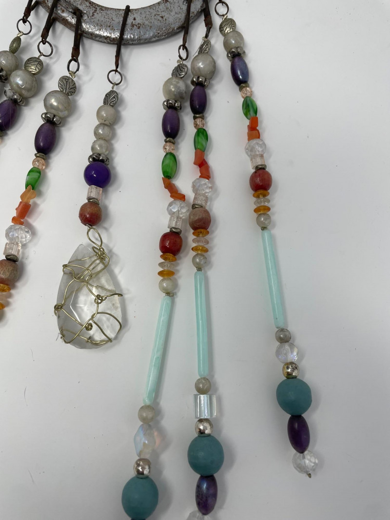 A charming, eclectic pairing of garden décor featuring a whimsical metal frog sculpture and a colorful beaded sun catcher set. Perfect for patios, porches, garden paths, or indoor accent displays. Included Highlights: Metal Frog Sculpture (Resin) Tall, upright frog in a suit and top hat Silver‑tone finish with artistic, weathered texture Stands on a round base; great statement piece for garden or entryway Beaded Sun Catcher Set Multi‑strand beaded design with vibrant colors: purples, turquoise, orange, green, and clear Includes wire‑wrapped crystal pendant Pre‑owned condition with typical wear from display. All items sold AS IS, WHERE IS. Frog Statue: 26” H x 7” Base (Resin) Sun Catcher: 15”Fancy Frog Decor and Sun Catcher