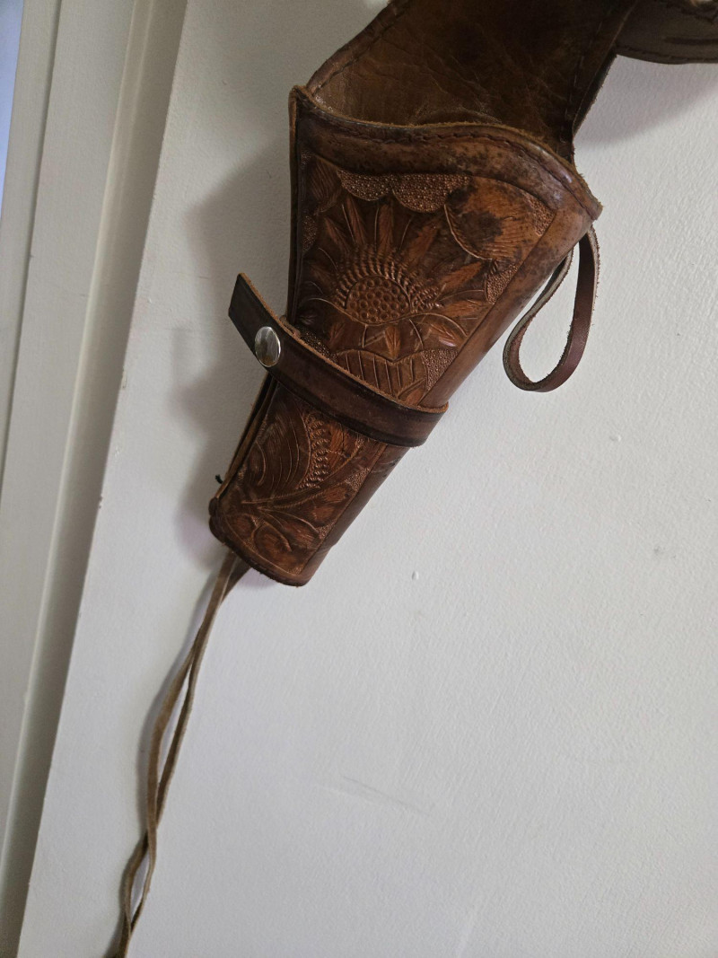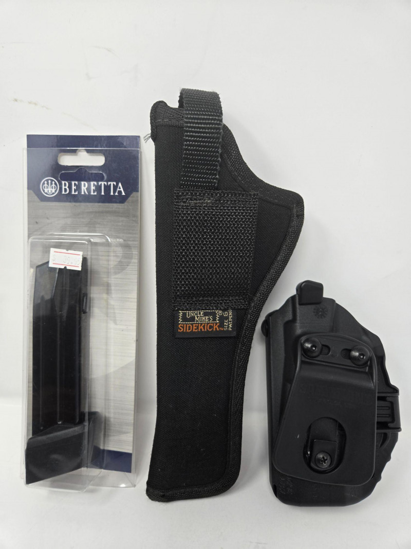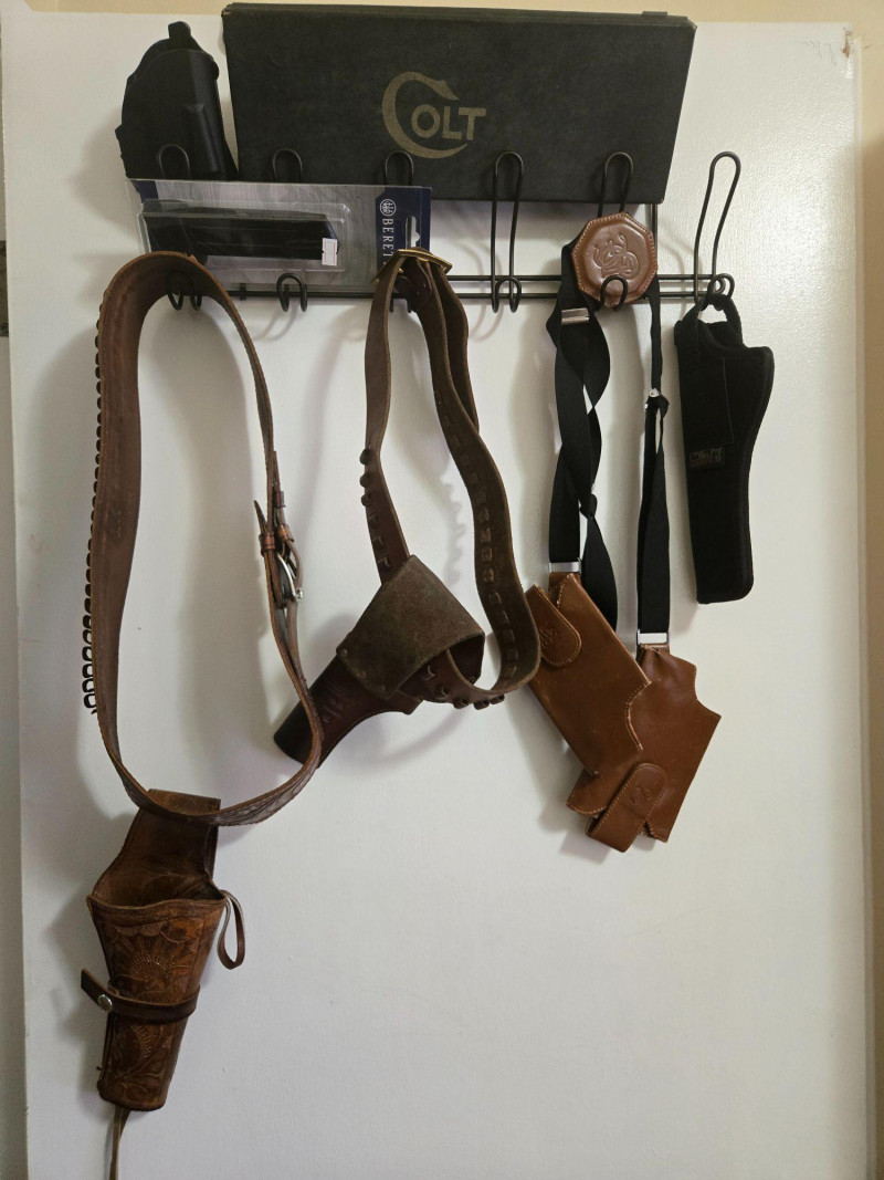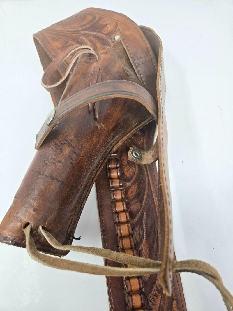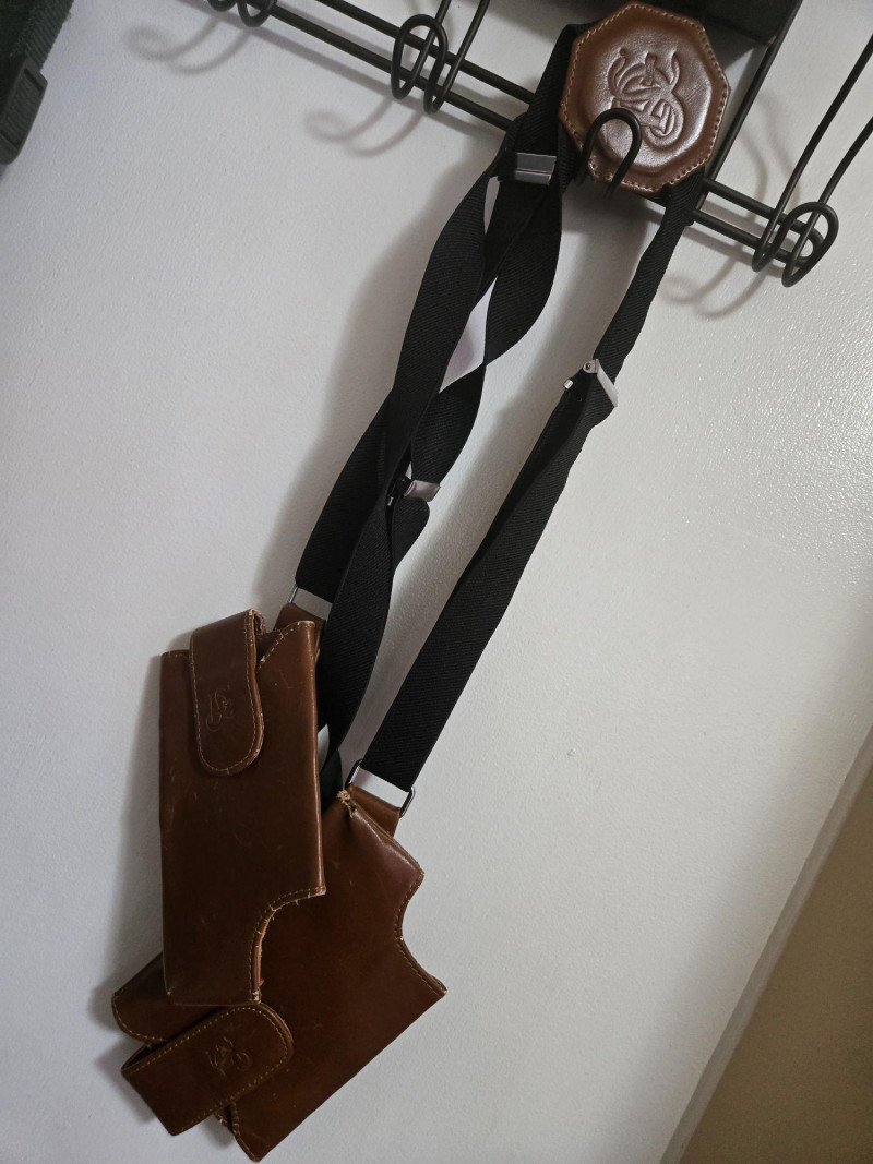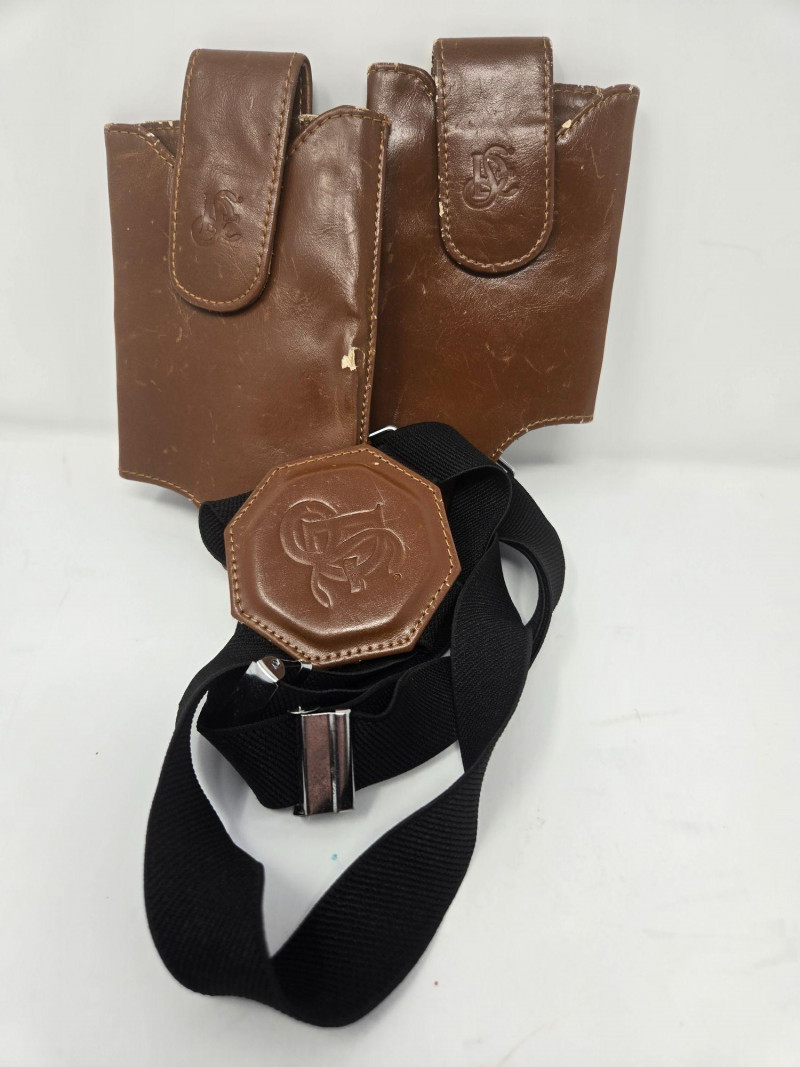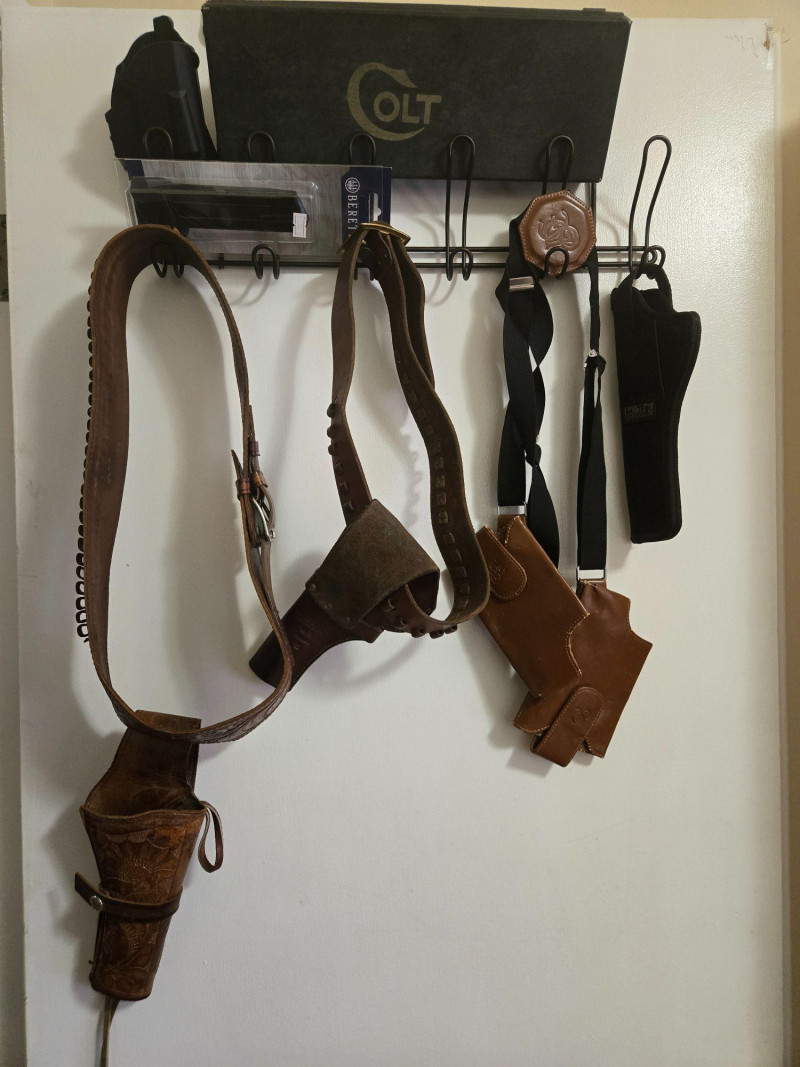 A practical and collectible assortment featuring an empty Colt firearm case paired with a variety of gun holsters and related gear. This lot is ideal for firearm enthusiasts, reenactors, or anyone needing quality storage and carry accessories. Included Items: Colt‑branded hard case (empty) Beretta‑branded magazine package (contents not verified) Multiple leather holsters, including: Tooled brown leather holster with decorative pattern Suede holster Shoulder holster with adjustable straps Assorted belts and holster rigs Pre‑owned condition with typical wear. Contents of packages and fitment of holsters not guaranteed. All items sold AS IS, WHERE IS.Colt (Empty) Box & Gun Holsters