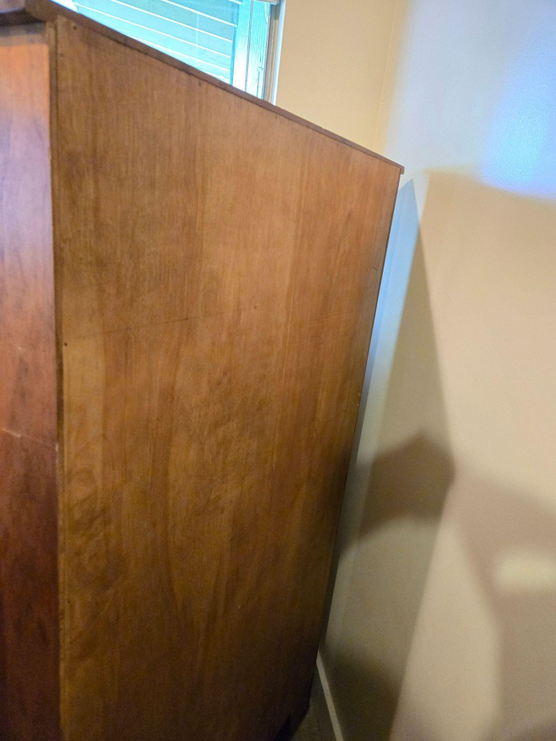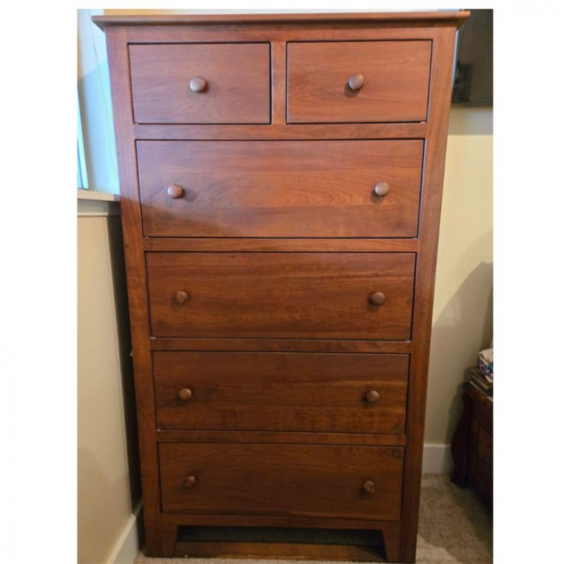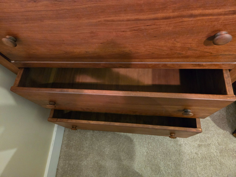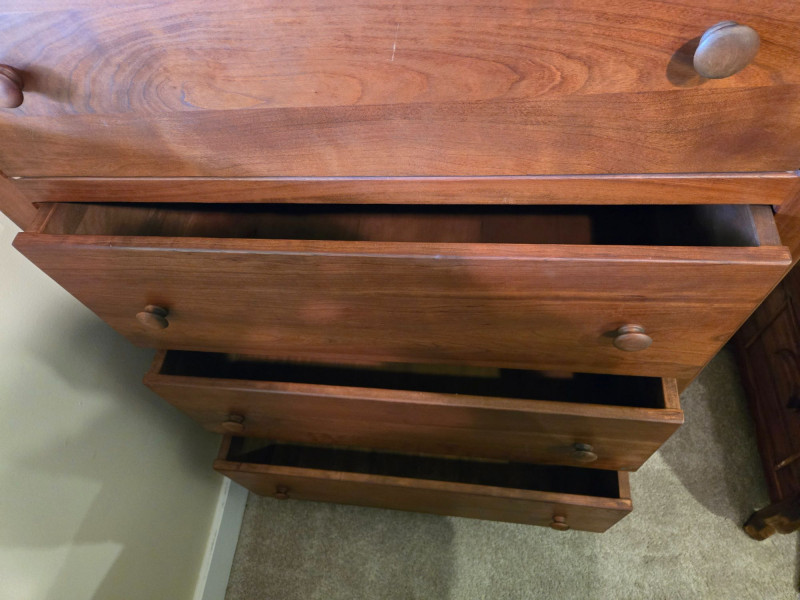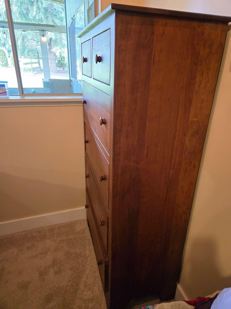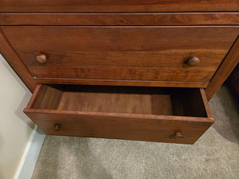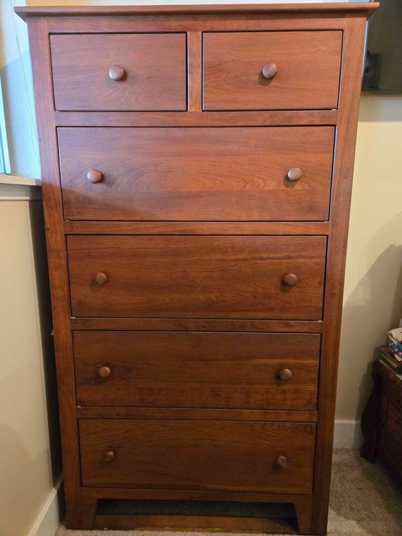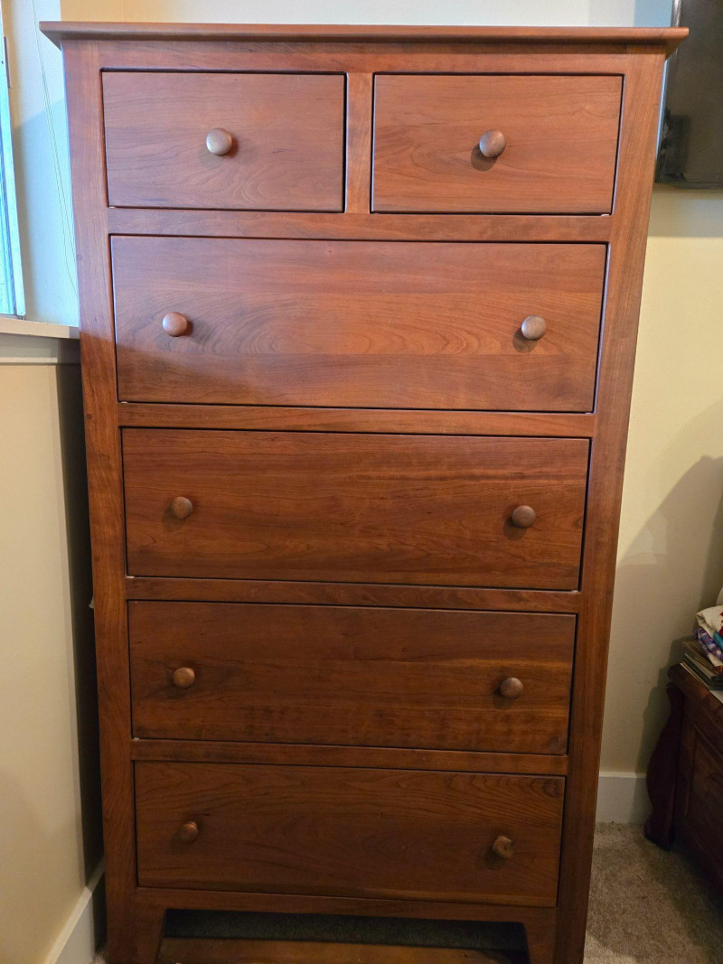 A classic, solid wood 6‑foot tall dresser offering generous storage and timeless simplicity. This piece features clean lines, natural wood grain, and a practical drawer layout suited for bedrooms, guest rooms, or organized household storage. Features: Tall 6' profile for maximum vertical storage Six‑drawer configuration Two smaller top drawers for accessories or linens Four full‑size lower drawers for clothing or bulk storage Natural wood finish with visible grain Round wooden knobs for a cohesive, traditional look Sturdy construction with a warm, homey aesthetic A dependable, functional dresser that blends easily with a variety of décor styles. Pre‑owned with typical wear from home use. All items sold AS IS, WHERE IS.6' Tall Dresser