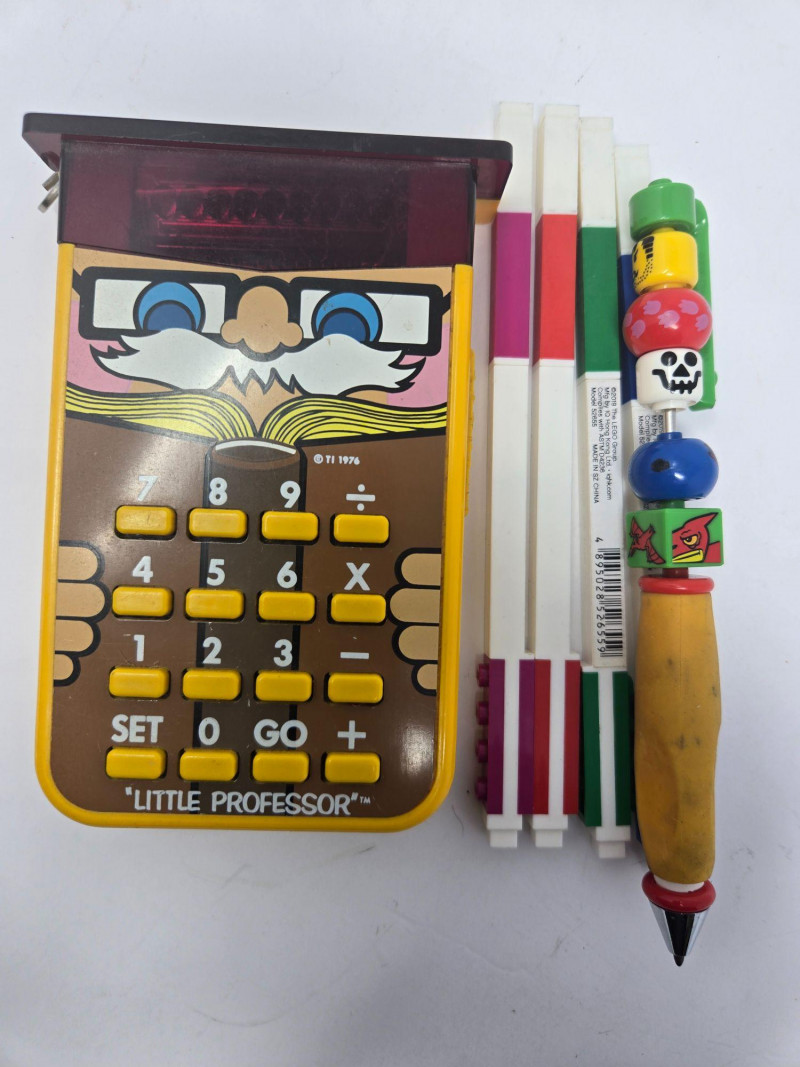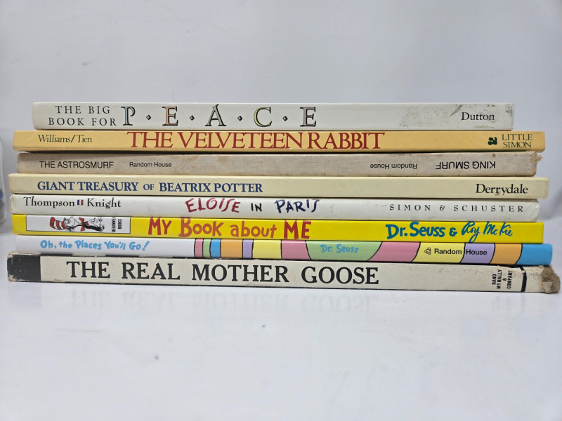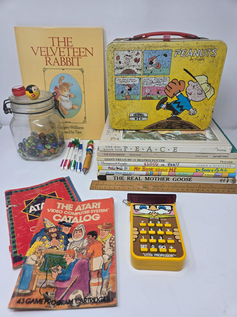A nostalgic, story‑rich assortment of vintage children’s books, toys, and classic pop‑culture treasures, perfect for collectors, educators, or anyone who loves retro childhood memorabilia. Included Highlights: “The Velveteen Rabbit” hardcover edition Yellow Peanuts Lunchbox featuring Charlie Brown & Snoopy Glass Jar of Marbles topped with a Mickey Mouse figure Vintage Colored Pencils Stack of Classic Children’s Books, including: The Big Book for Peace The Real Mother Goose Eloise in Paris My Book About Me — Dr. Seuss & Roy McKie The Giant Treasury of Beatrix Potter The Astronauts Wooden Ruler Two Atari Video Computer System Catalogs (43 Game Program Cartridges) “Little Professor” Educational Calculator — beloved retro learning toy Pre‑owned vintage condition with age‑appropriate wear. All items sold AS IS, WHERE IS.Vintage Kids Books & Toys