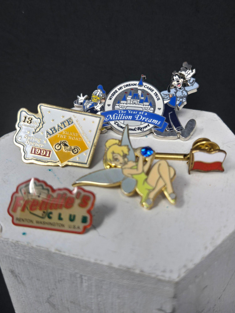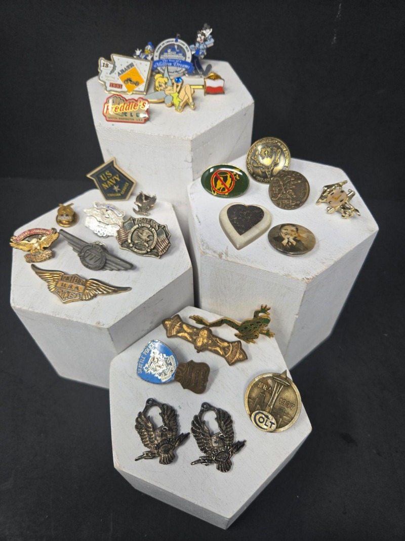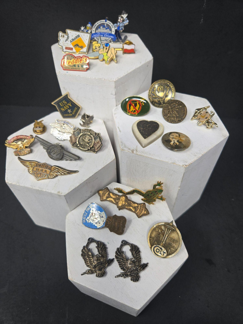A fun, collectible assortment of souvenir and novelty pins spanning travel, pop culture, and specialty themes. This mixed lot is perfect for pin collectors, jacket/hat decorators, or anyone who enjoys small keepsakes with personality. Included Themes May Include: Harley‑Davidson SPD / Police‑related Disney characters & park souvenirs Travel, state, and city pins Misc. novelty and commemorative pins Pre‑owned with typical light wear. All items sold AS IS, WHERE IS.Souvenir Pins, Harley, SPD, Disney…
