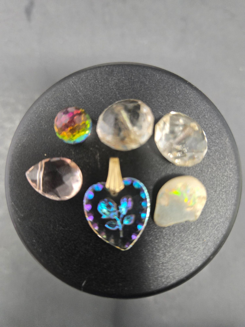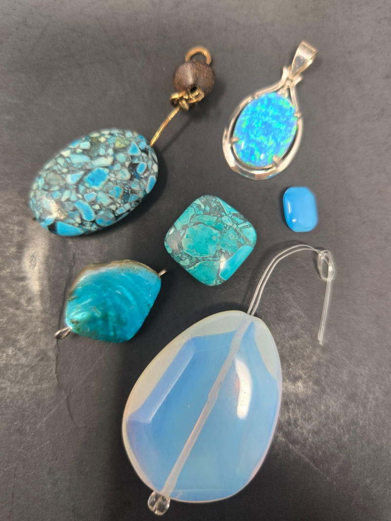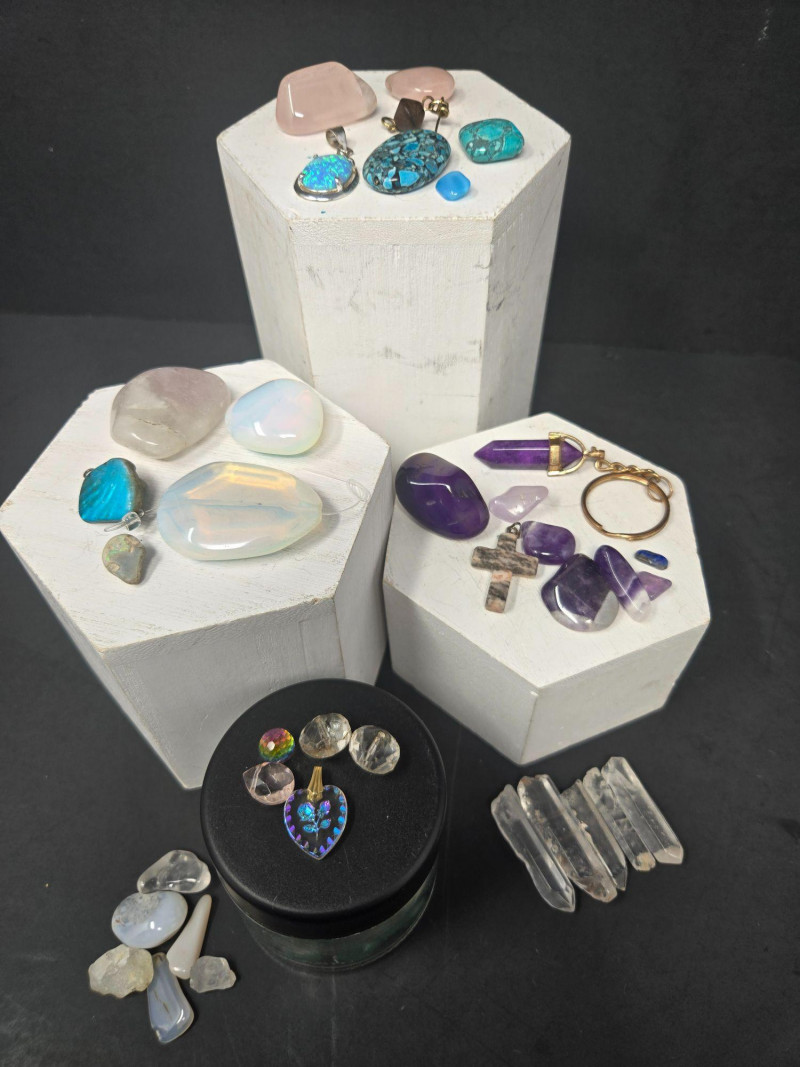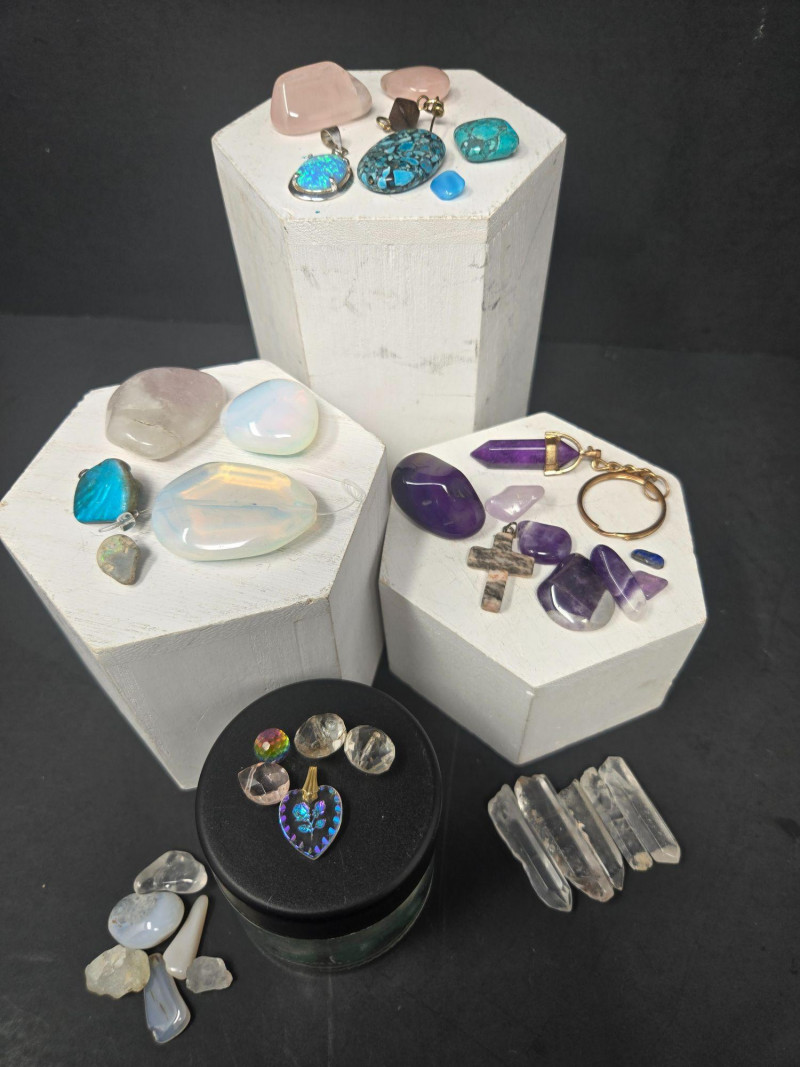 A vibrant, eye‑catching assortment of polished stones, crystals, and gemstone jewelry, perfect for collectors, crafters, wire‑wrappers, or anyone who loves natural minerals. This curated grouping showcases a wide range of colors, textures, and finishes—from soft pastels to bold, saturated hues. Included Highlights: Polished Gemstones & Tumbled Stones Rose quartz, turquoise, opal‑style pieces, amethyst, clear quartz points, and more Smooth, display‑ready specimens Gemstone Pendants Metal‑set stones in various shapes Ready for chains, crafting, or resale Gemstone Earrings Multiple pairs featuring natural stones Coordinated colors and silver‑tone settings Loose Crystals & Mineral Pieces Variety of sizes and finishes Ideal for décor, metaphysical use, or jewelry making A colorful, diverse lot with plenty of sparkle and natural beauty. Pre‑owned stones and jewelry pieces with typical light wear. All items sold AS IS, WHERE IS.Rock & Gems
