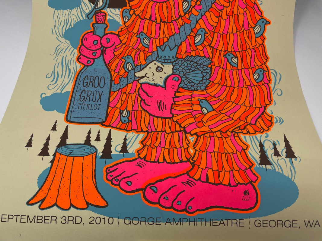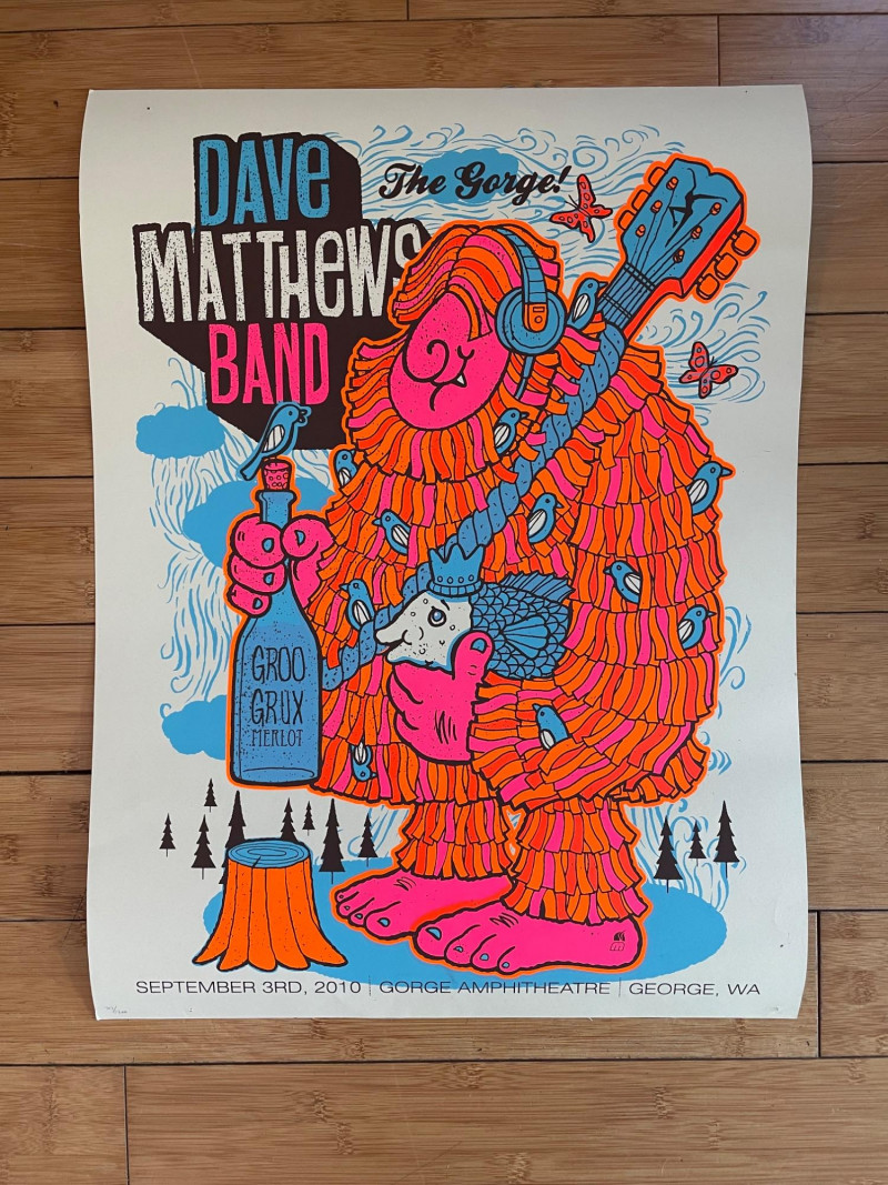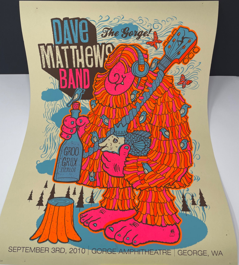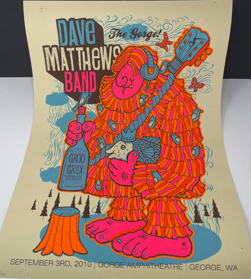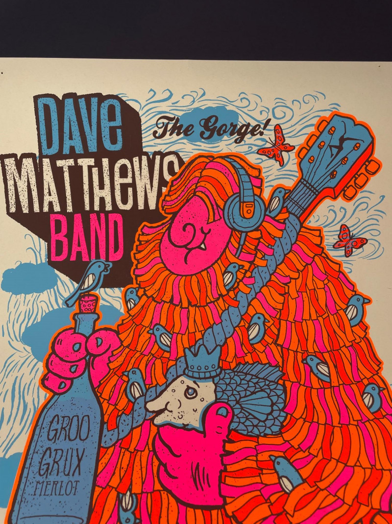A bold, limited‑edition Dave Matthews Band concert poster, numbered 703/1200, commemorating one of the band’s celebrated performances. Designed in the signature DMB poster tradition, this piece features strong graphic elements, vibrant color contrasts, and a striking central motif that makes it an instant focal point on any wall. Pre‑owned with typical signs of handling. Sold AS IS, WHERE IS.Dave Matthews Band Concert Poster — #703/1200