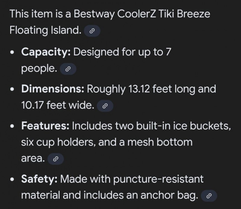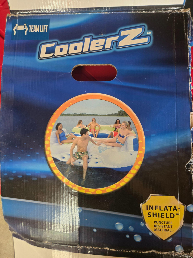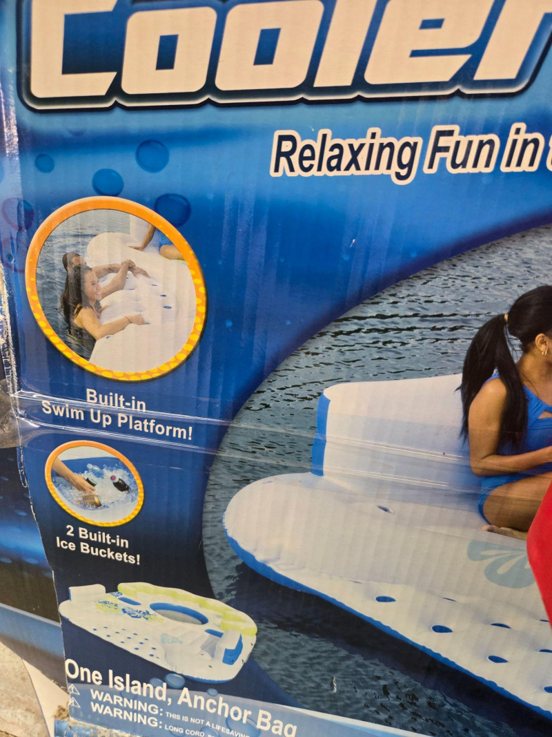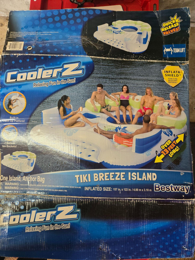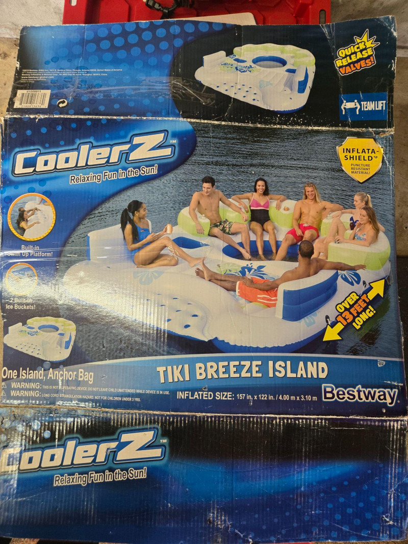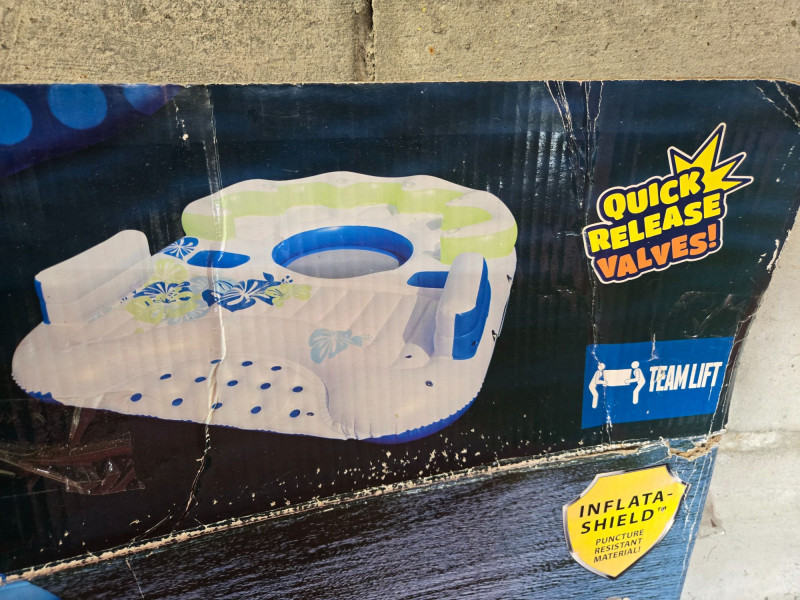 A large CoolerZ Tiki Breeze Island Float by Bestway—designed for group lounging and on‑the‑water fun. This oversized inflatable island seats multiple people comfortably and includes built‑in features for relaxing days on the lake or river. Inflated Size: approx. 157 in. x 122 in. (over 13 ft long) Group‑Sized Island Float with multiple seating areas Built‑In Swim‑Up Platform Cup Holders & Ice Buckets for easy refreshment access Inflata‑Shield Puncture‑Resistant Material Quick‑Release Valves for faster inflation/deflation Anchor Bag Included Boxed item; lightly used, no tears/rips. Sold AS IS, WHERE IS. Tiki Breeze Island Float f/7