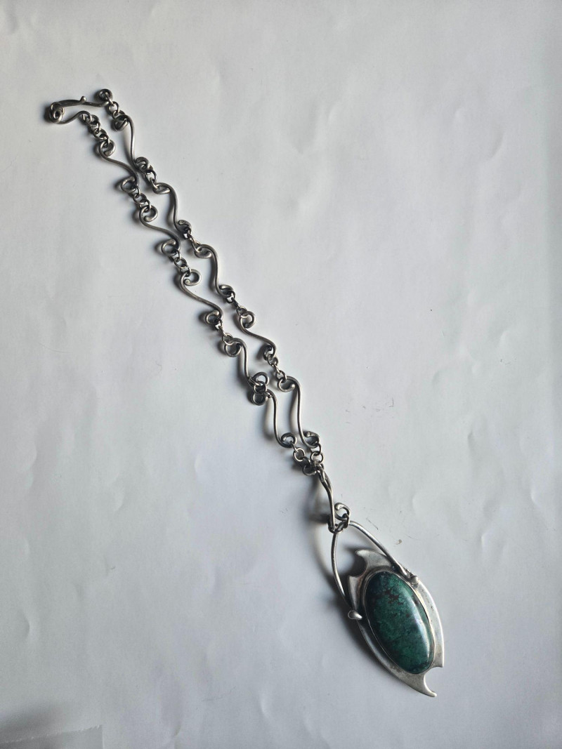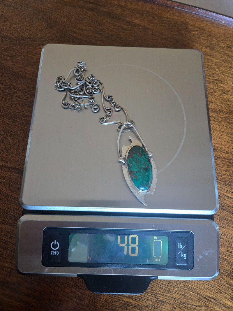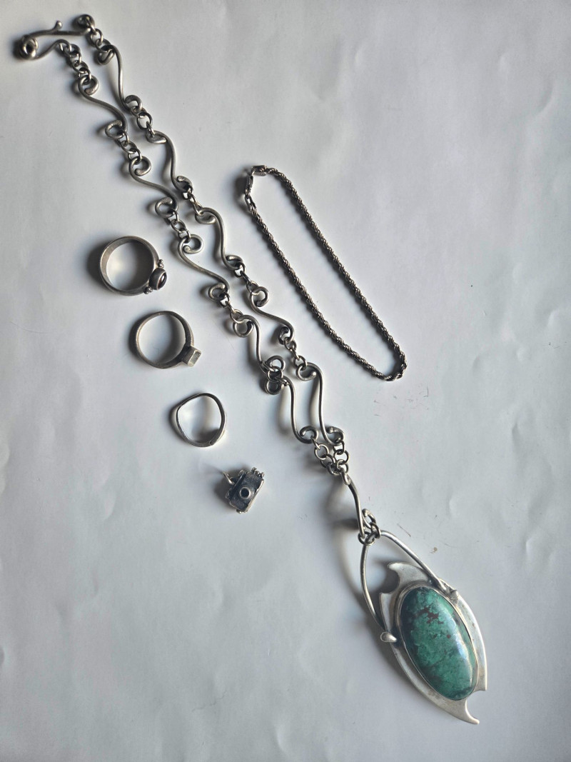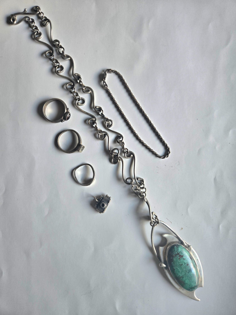 A striking, artisan‑crafted collection of sterling silver jewelry, highlighted by a sculptural turquoise pendant necklace and four uniquely designed rings. This grouping blends organic forms, modernist lines, and handcrafted character—ideal for collectors who appreciate expressive silverwork. Included Highlights: Sterling Turquoise Pendant Necklace Large oval turquoise stone with green‑brown matrix Ornate, flowing silver frame with sculptural curves Distinctive chain featuring artistic, wave‑like links Four Sterling Rings Round‑Stone Ring — simple band with a small round cabochon Square‑Bezel Ring — clean, modern profile with geometric presence Organic‑Form Ring — irregular, hand‑shaped silver design with artisan texture Geometric/Mechanical‑Style Ring — small raised decorative element with industrial flair Pre‑owned sterling jewelry with typical light wear. All items sold AS IS, WHERE IS.Sterling Necklace, Bracelet & 4 Rings