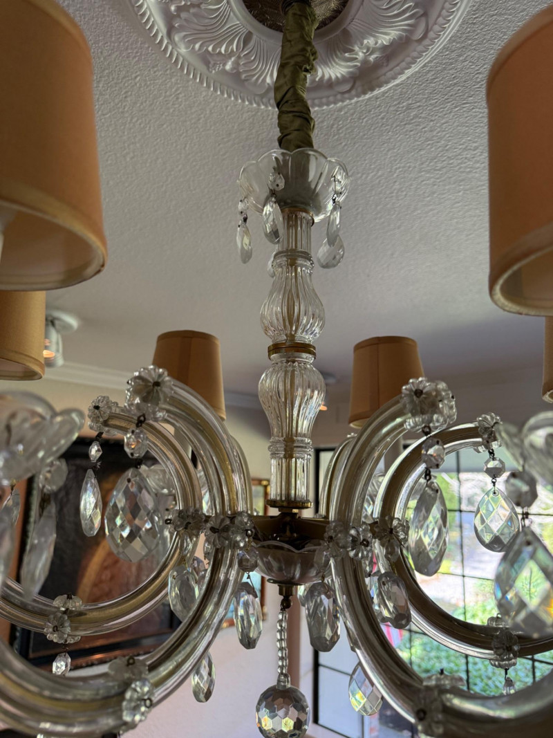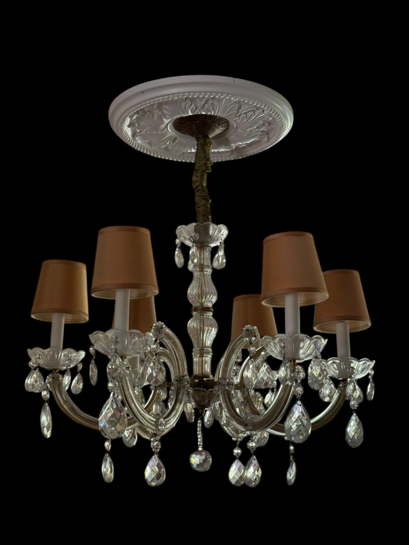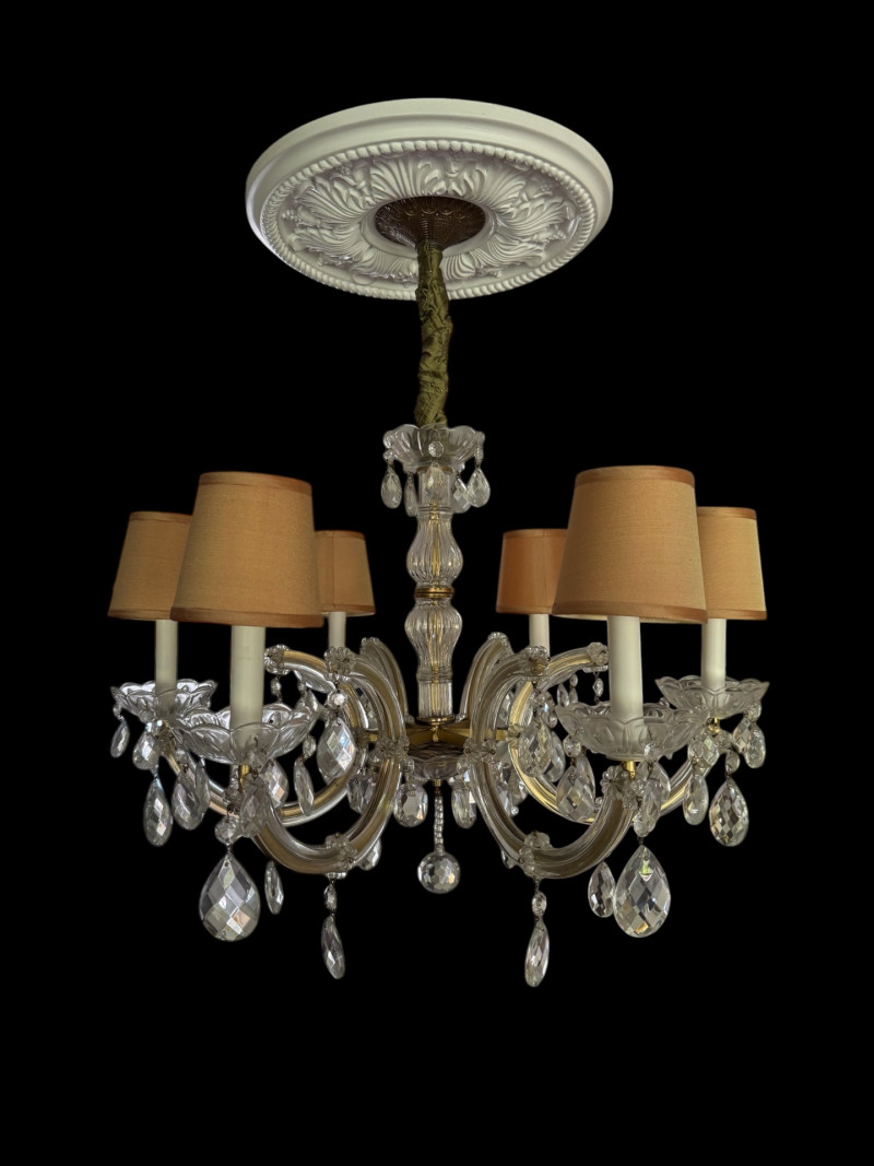Lot # 102 - 25” Crystal & Glass 6-Light Chandelier with Shades, 27” Drop