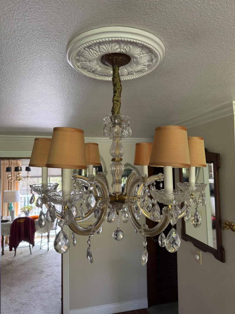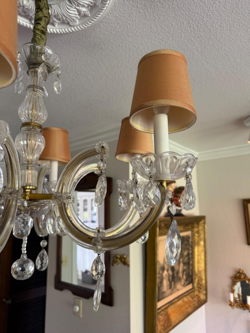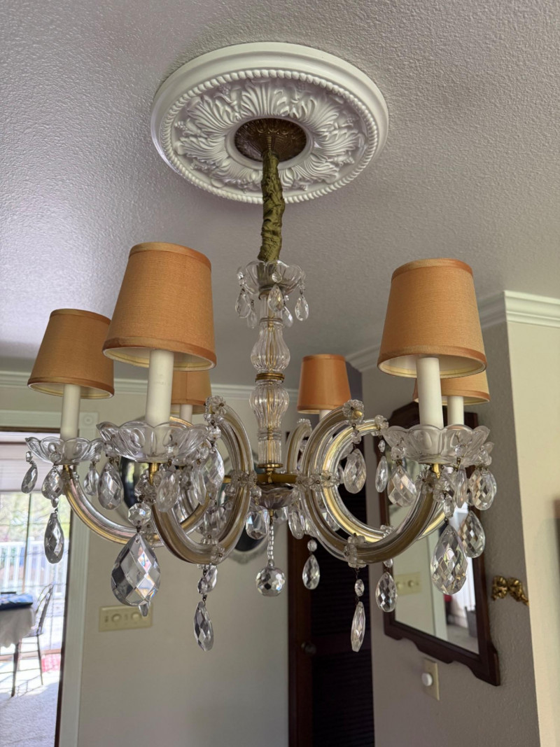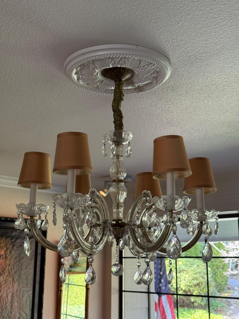 A beautifully scaled six-light chandelier featuring curved glass arms adorned with faceted crystal drops. The 25-inch diameter offers ideal proportion for dining or bedroom use, while the 27-inch drop makes it well-suited for standard ceiling heights. Warm-toned shades soften the light, creating an inviting glow. A versatile traditional fixture with just the right amount of sparkle. This has been uninstalled.
