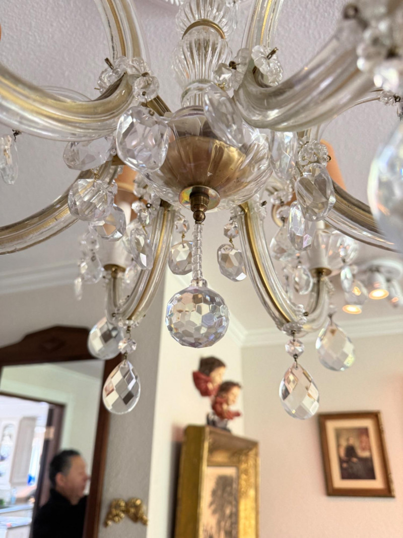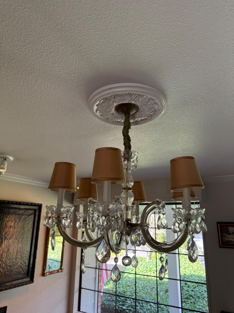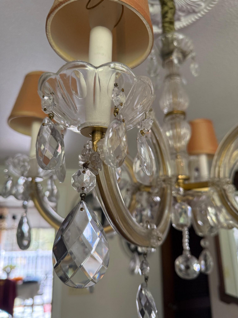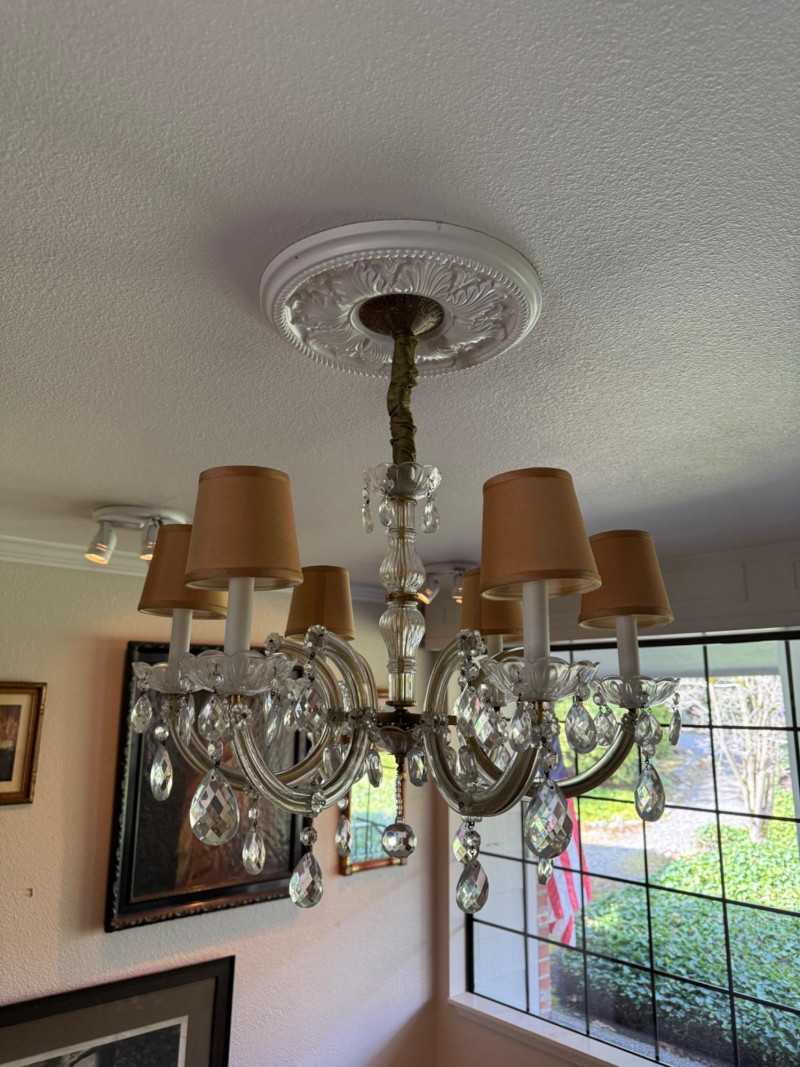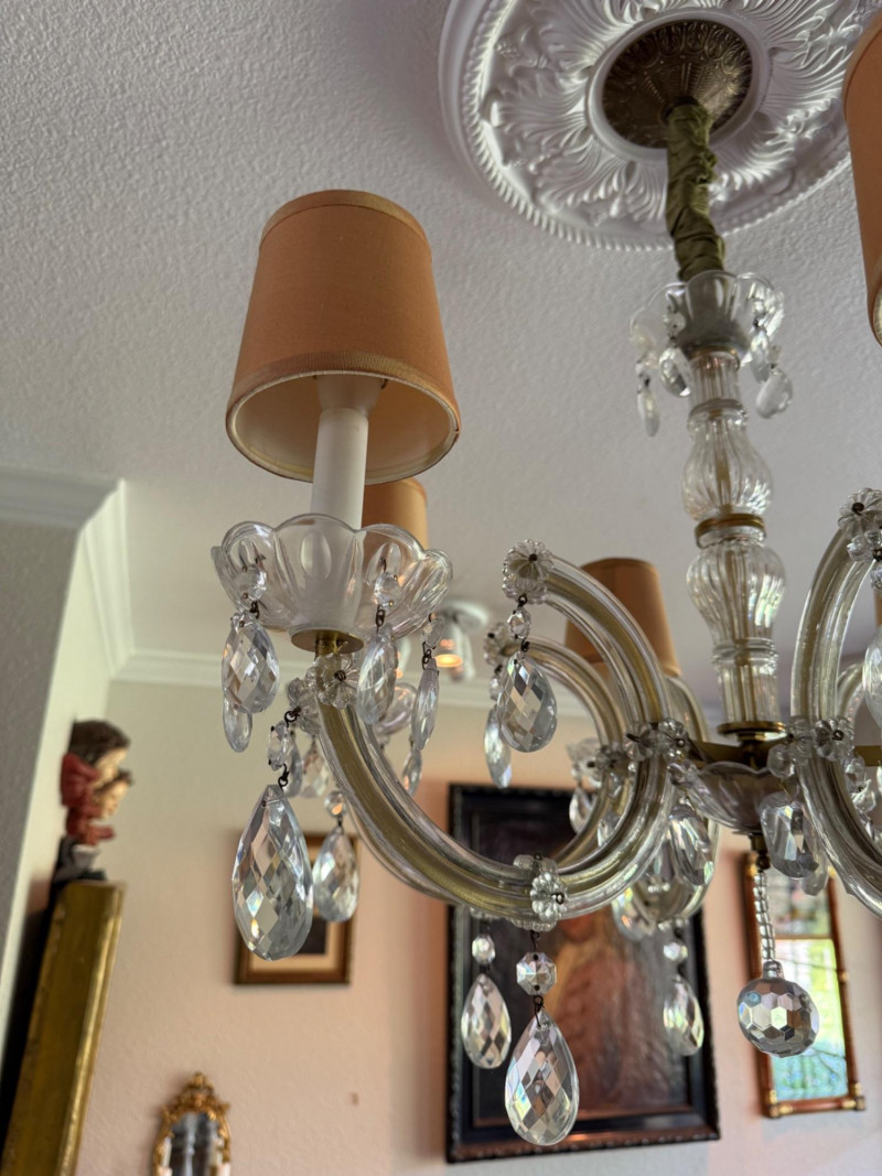 A beautifully scaled six-light chandelier featuring curved glass arms adorned with faceted crystal drops. The 25-inch diameter offers ideal proportion for dining or bedroom use, while the 27-inch drop makes it well-suited for standard ceiling heights. Warm-toned shades soften the light, creating an inviting glow. A versatile traditional fixture with just the right amount of sparkle. This has been uninstalled.