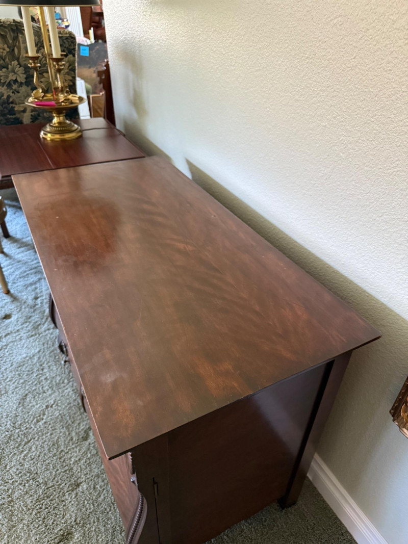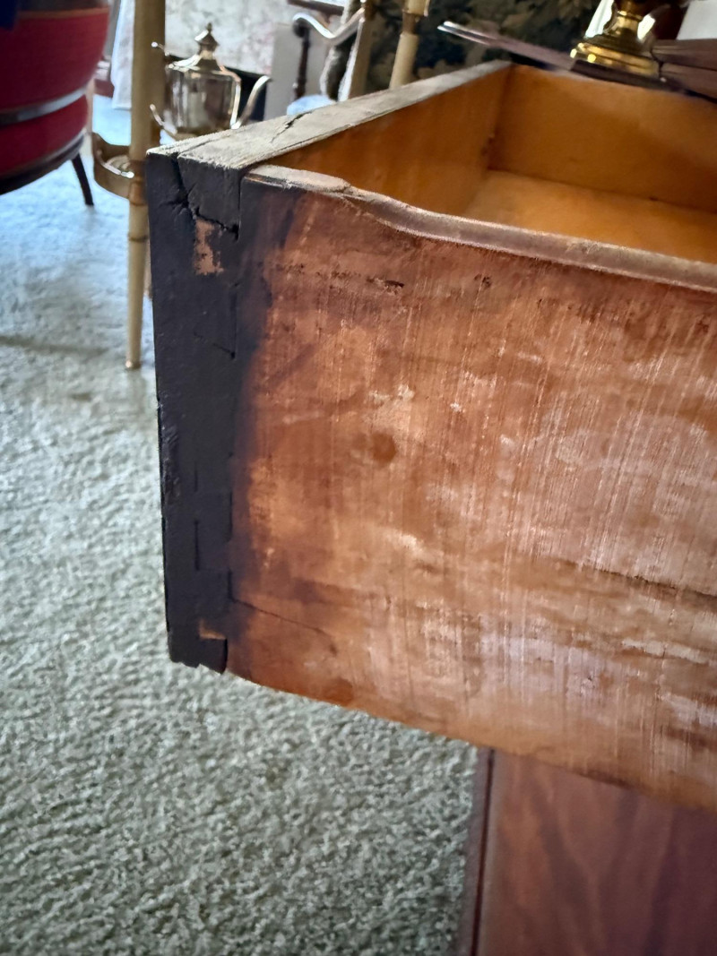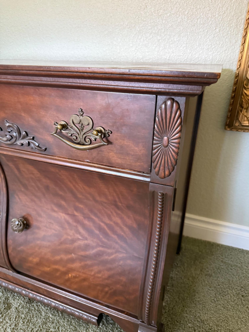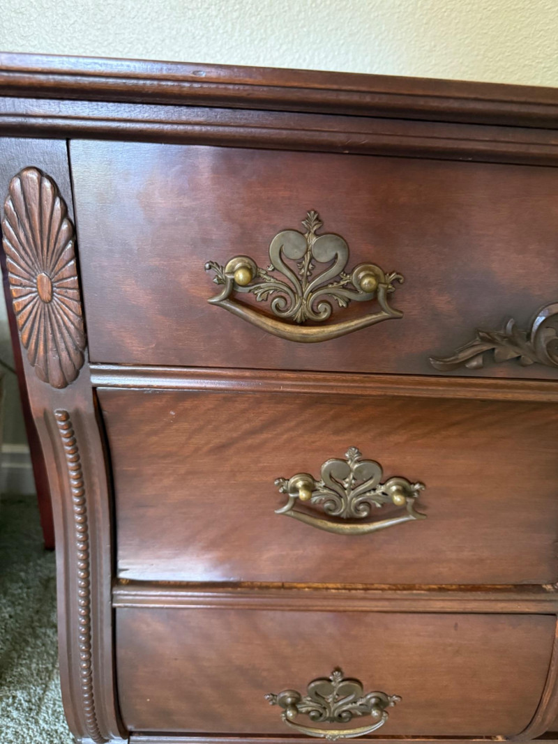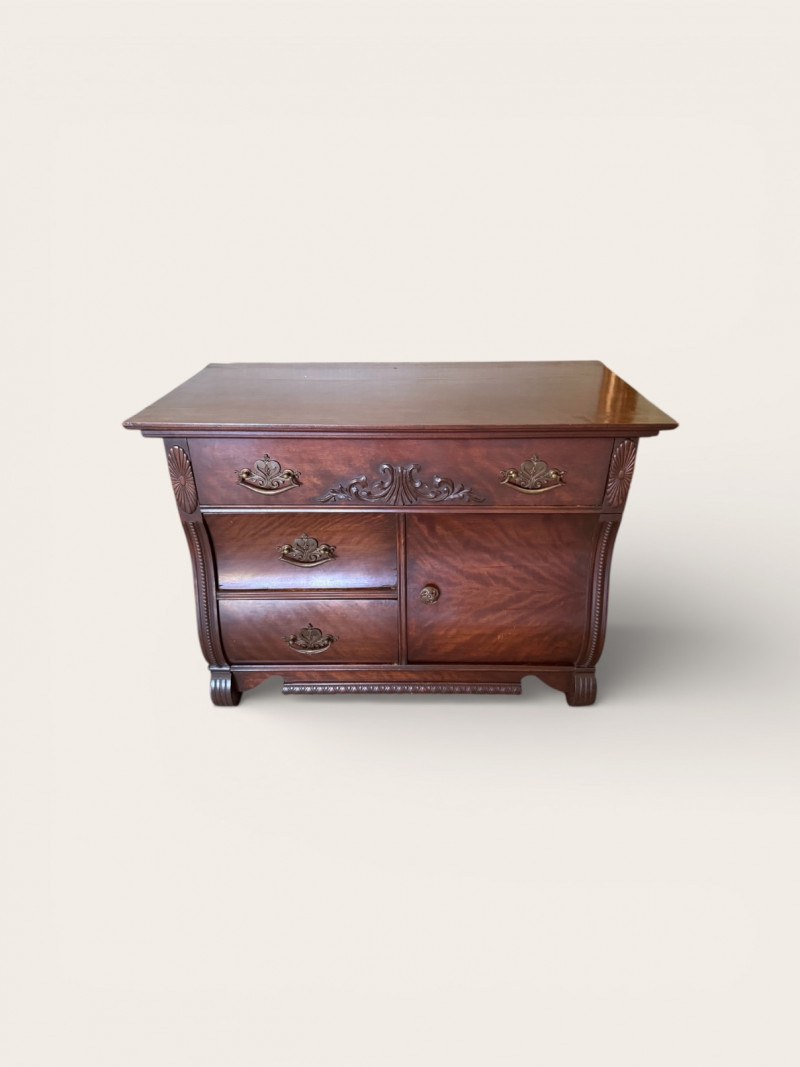 Vintage serpentine front chest featuring beautifully figured, bookmatched wood veneer and classic carved detailing. This piece reflects a transitional design blending traditional forms with subtle Art Deco influence, evident in its curved profile and stylized hardware. Configured with three drawers and a cabinet compartment, it offers versatile storage in a compact, highly usable scale—ideal for bedroom, entry, or accent placement. The warm wood tones and decorative elements give it a timeless presence that integrates easily into both traditional and eclectic interiors. A well-proportioned and functional estate piece with enduring character.