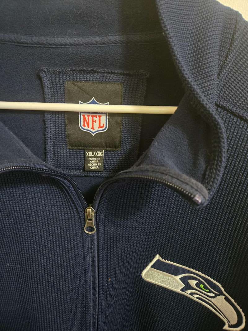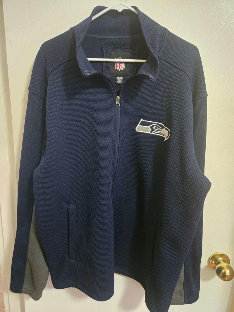 A spirited sports‑fan assortment featuring NFL team apparel, a large grouping of trading cards, and a collectible Kingdome Implosion print—perfect for Seattle sports enthusiasts or memorabilia collectors. 4 Seattle Seahawks items