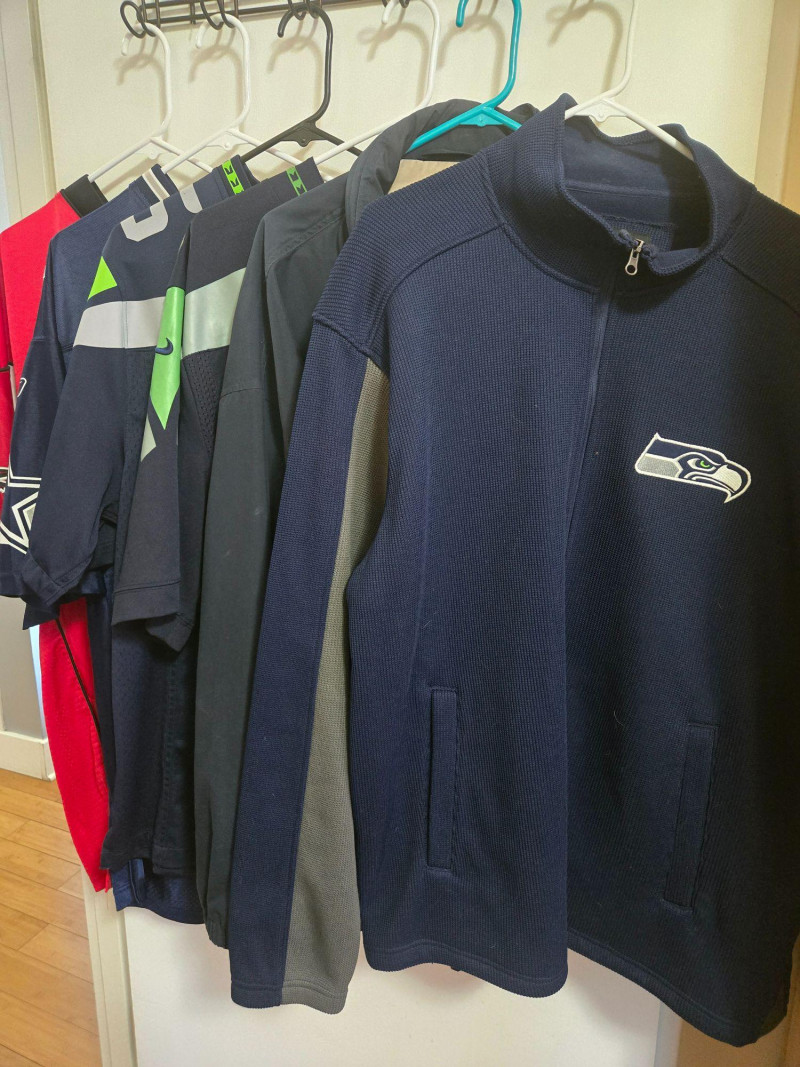 Mix of jerseys, jackets, and fan wear in classic navy, gray, and action‑green tones. 1 Dallas Cowboys item