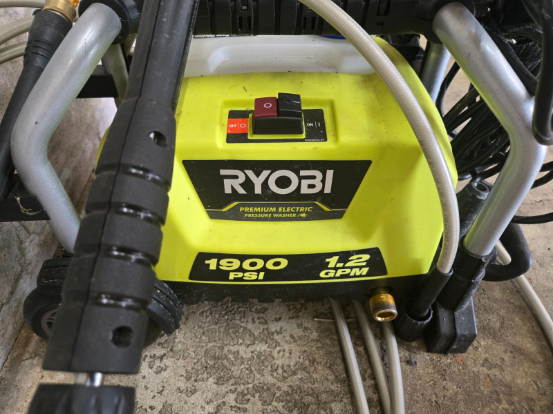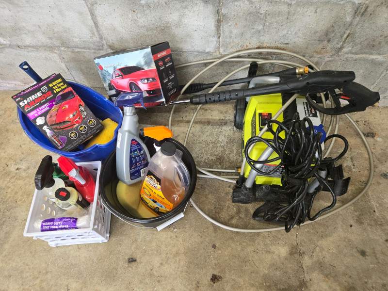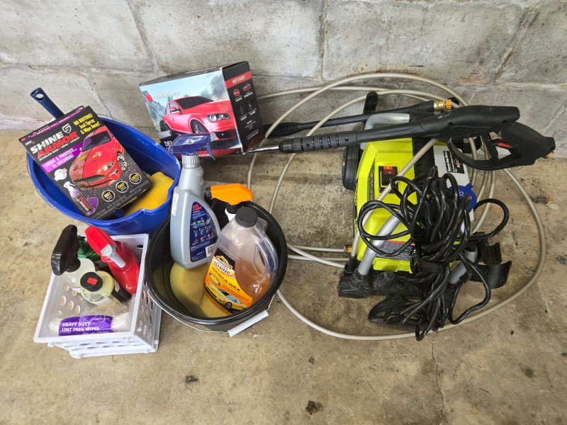 Includes Meguiar’s and other auto‑care items. Pre‑owned equipment and supplies with typical wear.RYOBI Premium Electric Pressure Washer & Cleaning Goods