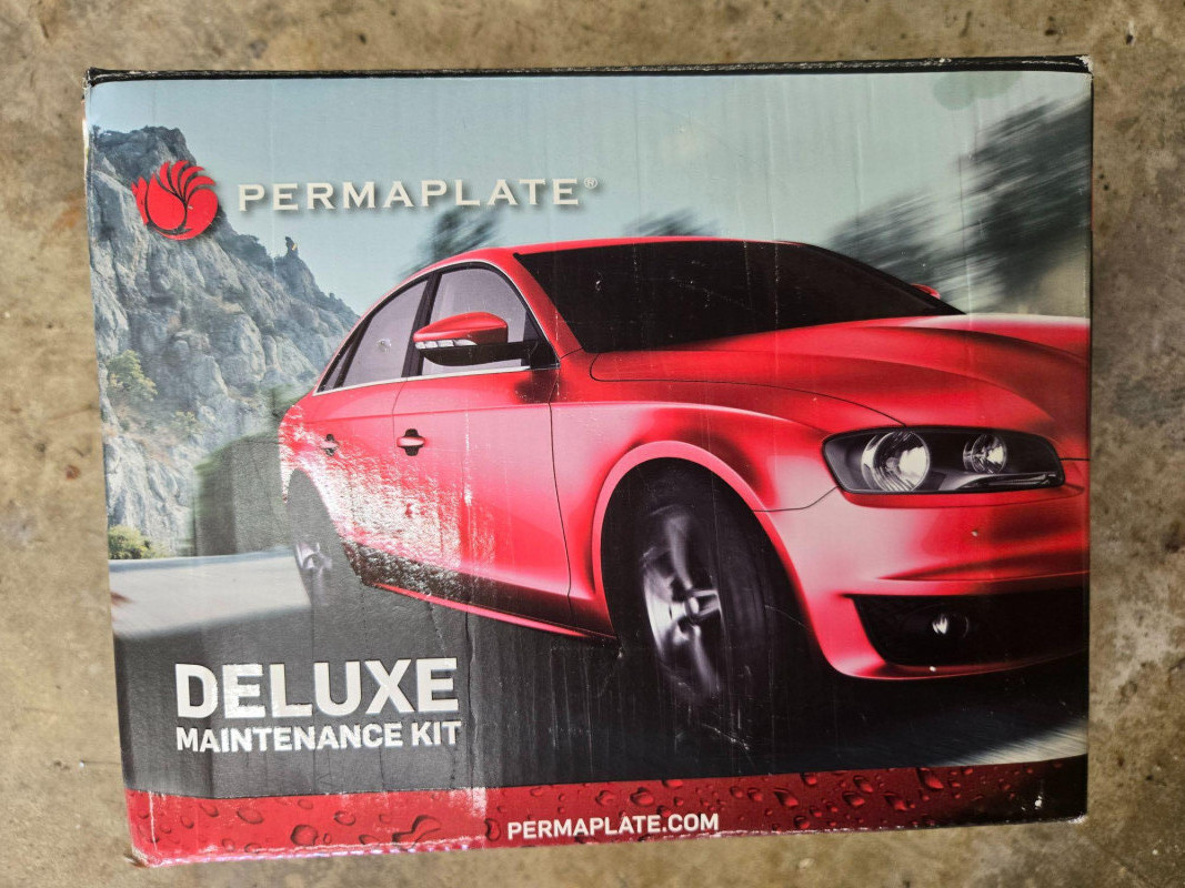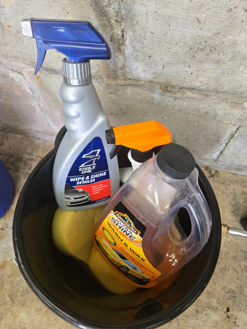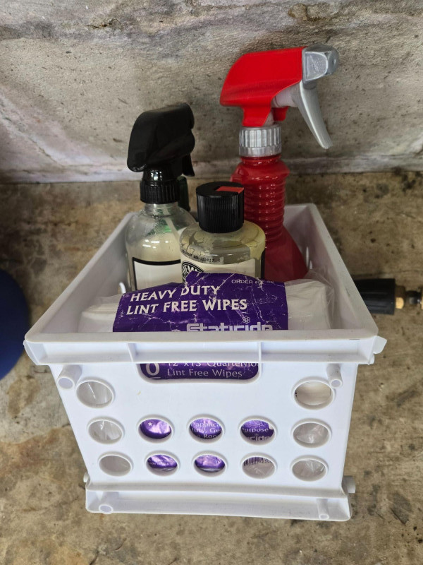 Car wash soap, wax, cleaning solutions, and additional applicators. White Crate of Supplies