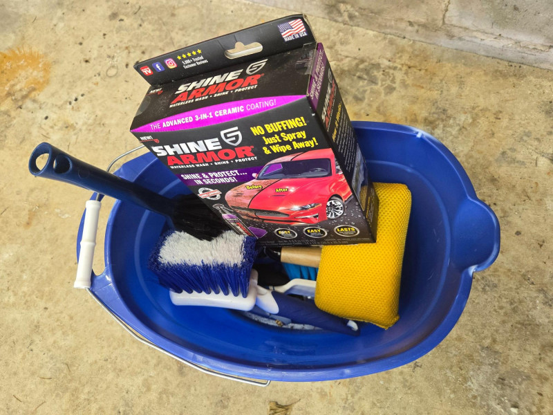 Shine Armor product, microfiber towels, sponges, and assorted cleaning accessories. Black Bucket of Car‑Care Chemicals