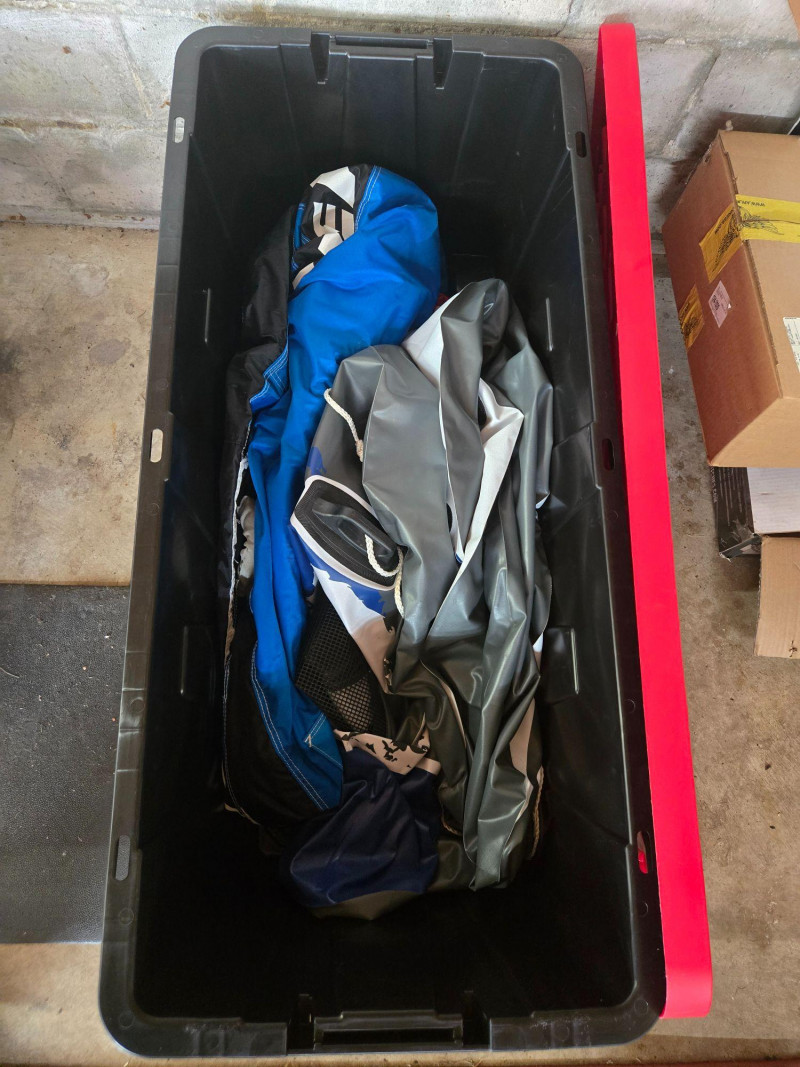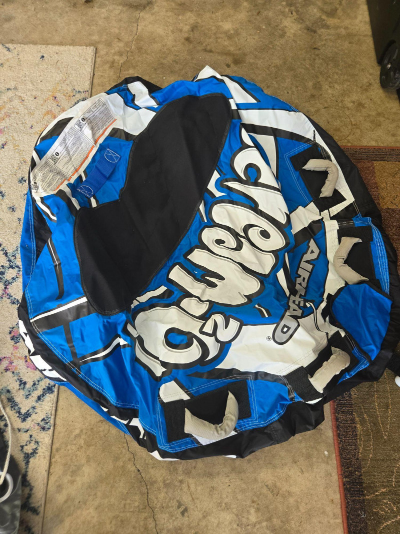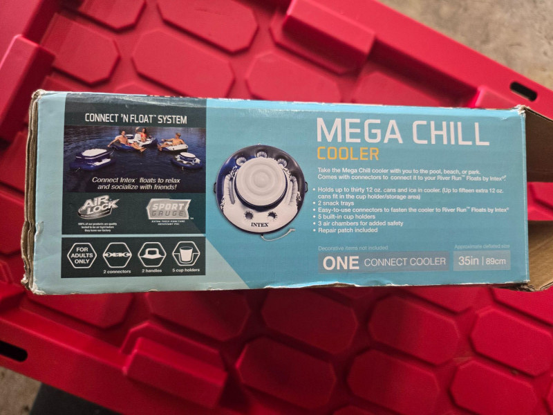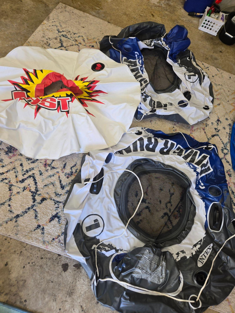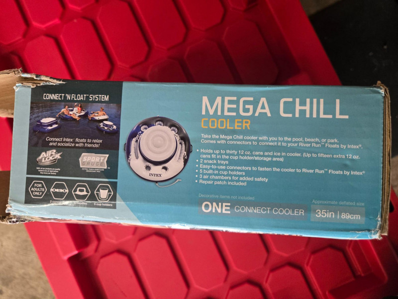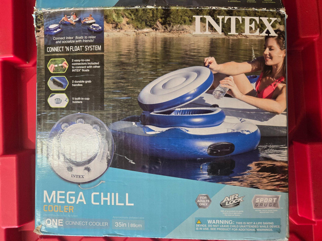 Comes stored inside a plastic tub for easy transport and storage Pre‑owned inflatables; sold as is. Not tested for air retention.3 River Floats, 1 Lake Floater & Floating Mega Chill Cooler in Tub w/Wheels