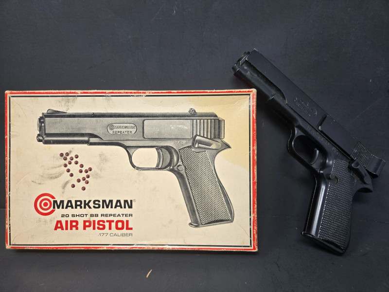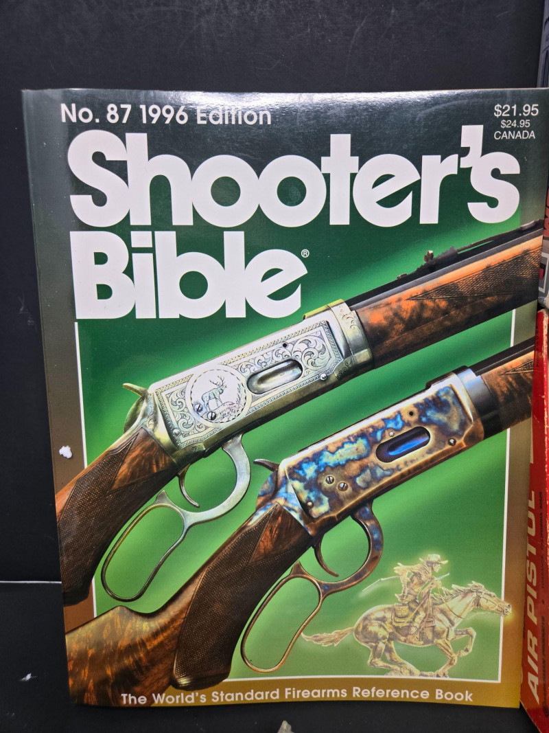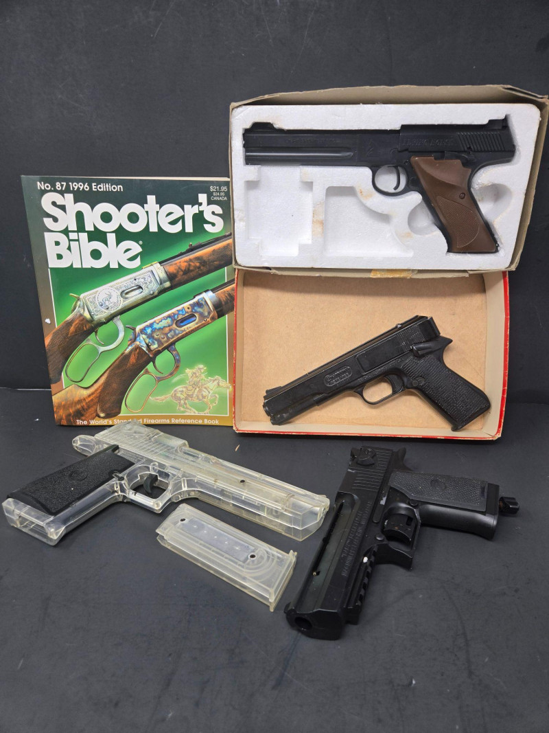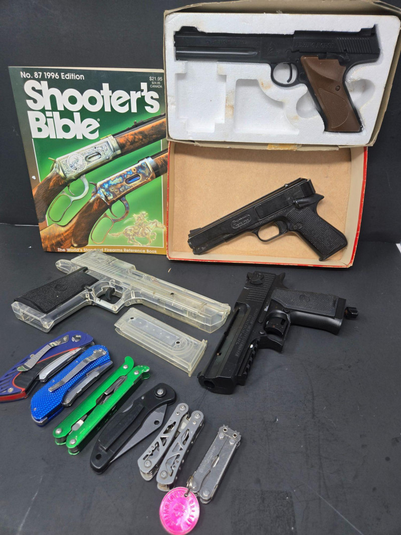 A mixed collection ideal for hobbyists, display collectors, or anyone interested in vintage shooting‑sports memorabilia. This lot includes four BB pistols, six folding pocket knives, and a 1996 Shooter’s Bible No. 87 reference book. 2 Boxed BB Pistols