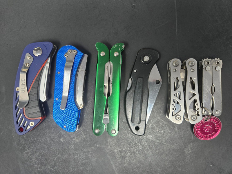 Includes a transparent‑frame model and a black‑frame model. A colorful assortment of folding knives and multitools, including: Blue, green, black, and silver multitool‑style knives Additional compact folders Pink circular keychain tool included Classic reference book featuring rifles, handguns, and sporting arms Green cover with engraved rifle artwork A staple resource for firearm enthusiasts and collectors Pre‑owned items with typical wear. BB guns and knives not tested. Book shows normal handling. Sold AS IS, WHERE IS.4 BB Guns, 6 Pocket Knives & Shooter’s Bible Book