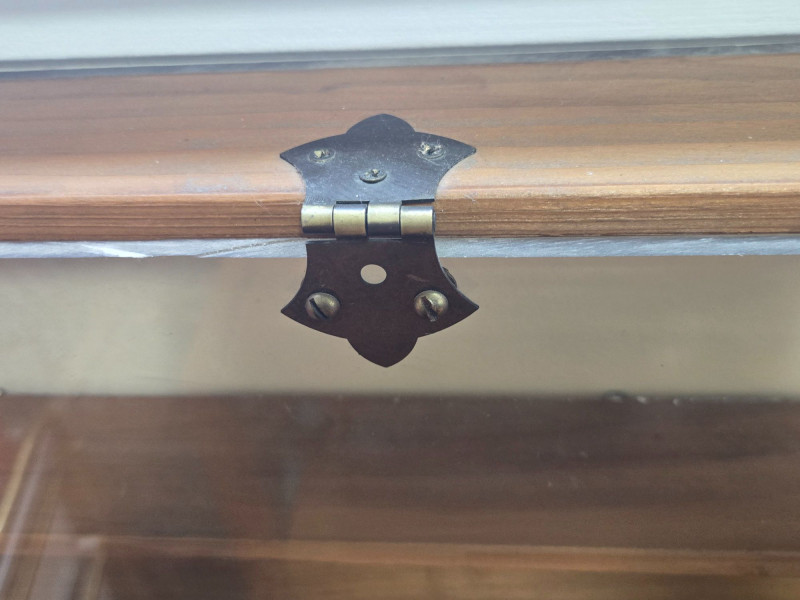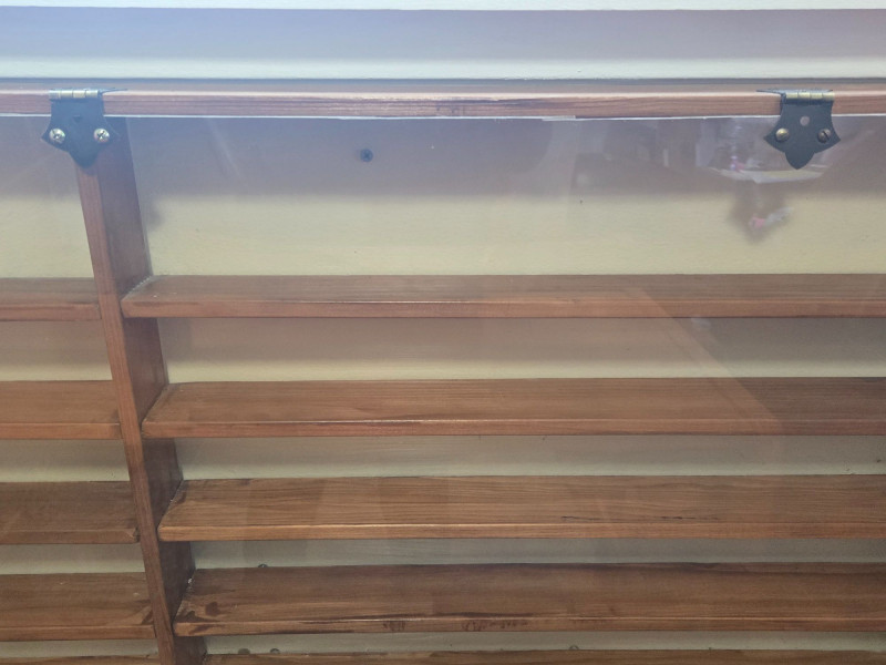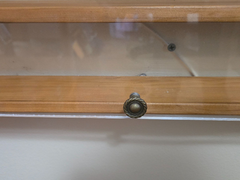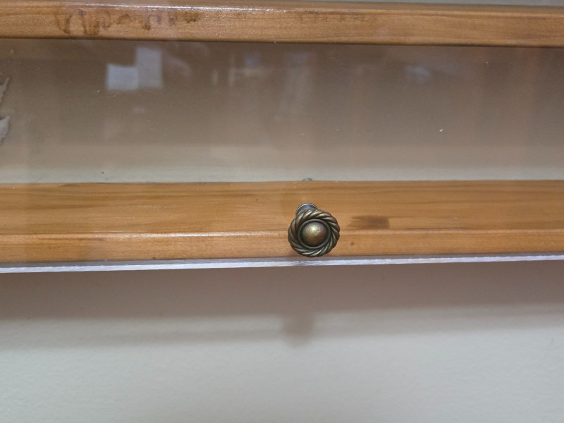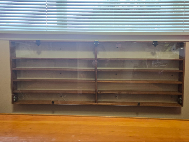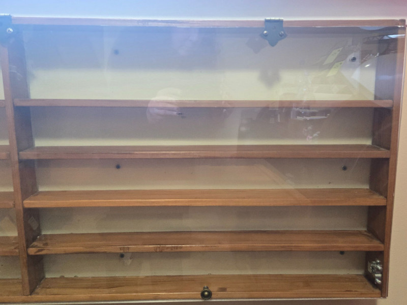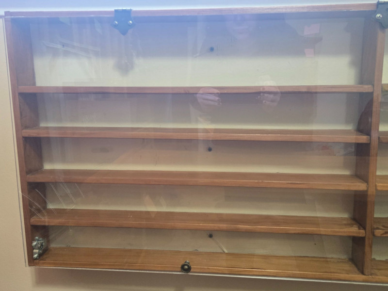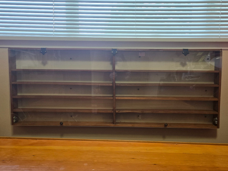 A well‑crafted wall‑mounted collections display case featuring multiple shelves and a clear front cover—perfect for showcasing miniatures, keepsakes, small collectibles, or curated themed sets. Multi‑shelf interior with two vertical sections and numerous horizontal compartments Clear front panel (acrylic or glass) with visible hardware for easy viewing and protection Wall‑mounted design, ideal for organizing and displaying small items Warm wood tone that blends easily with most décor styles Approx. 48 in W x 19 in H x 3 in D Pre‑owned with typical signs of use. Sold AS IS, WHERE IS.Collections Display Case